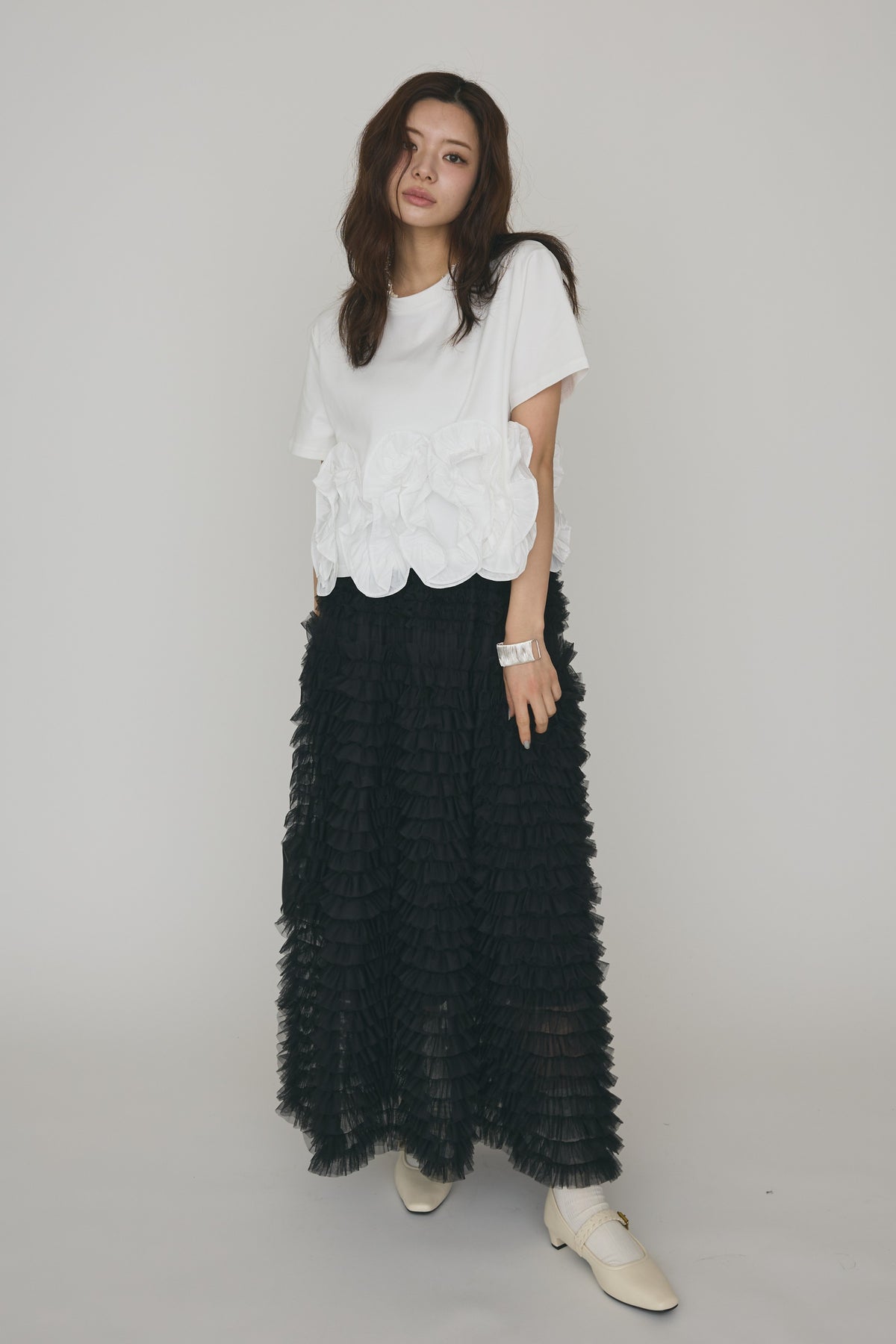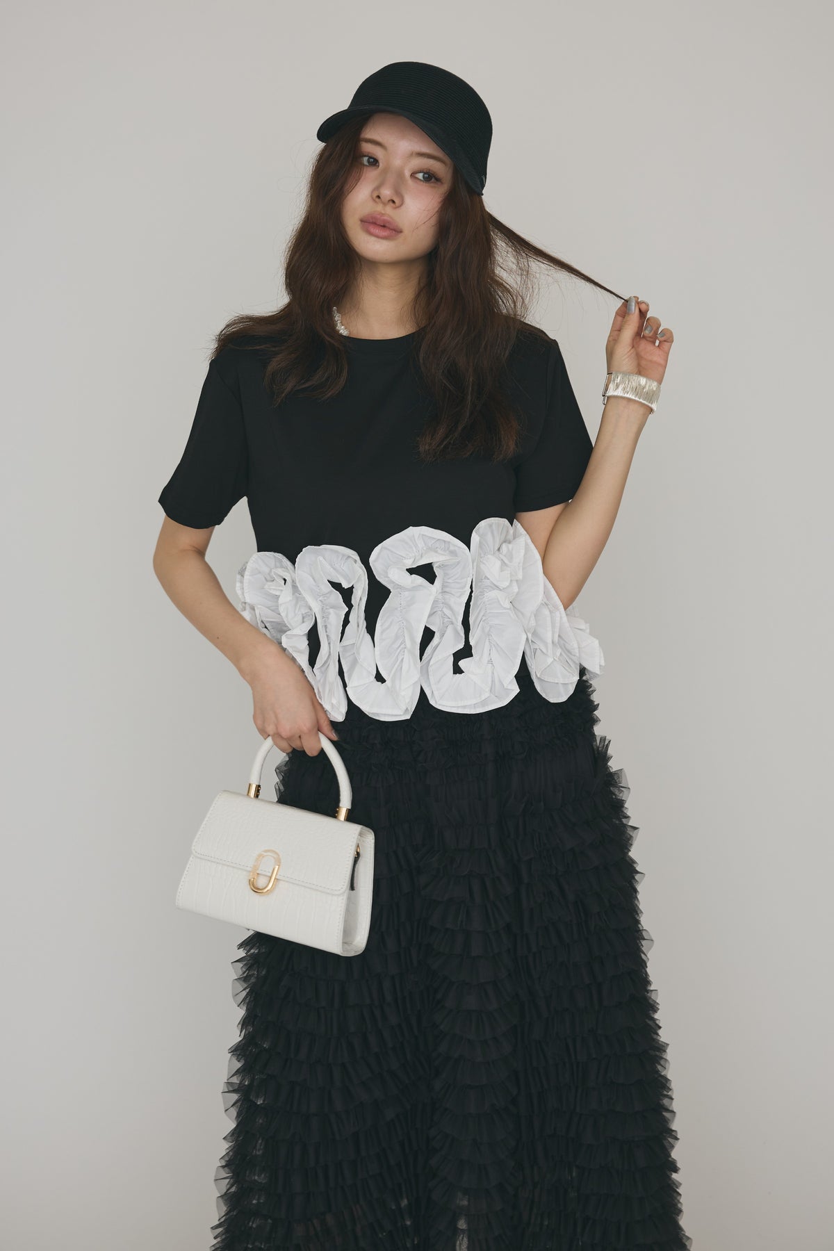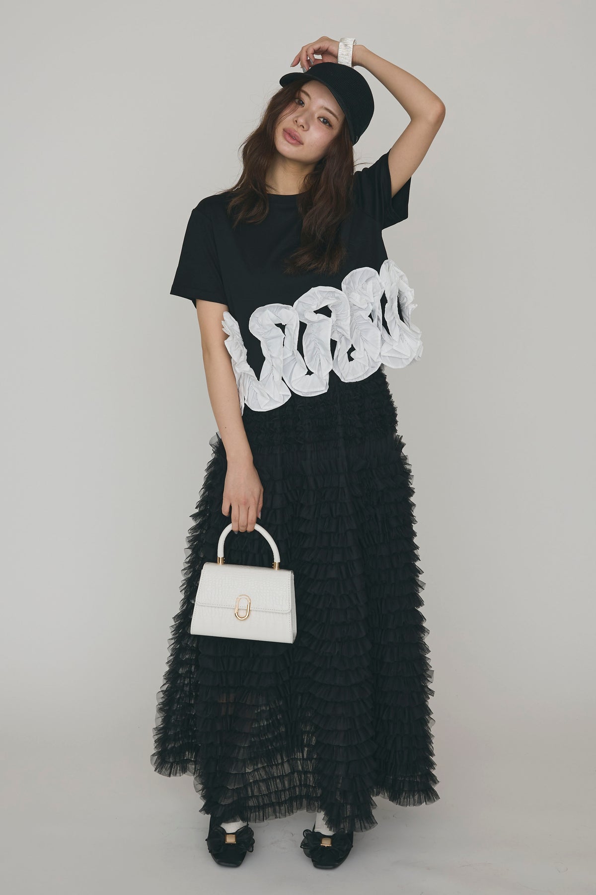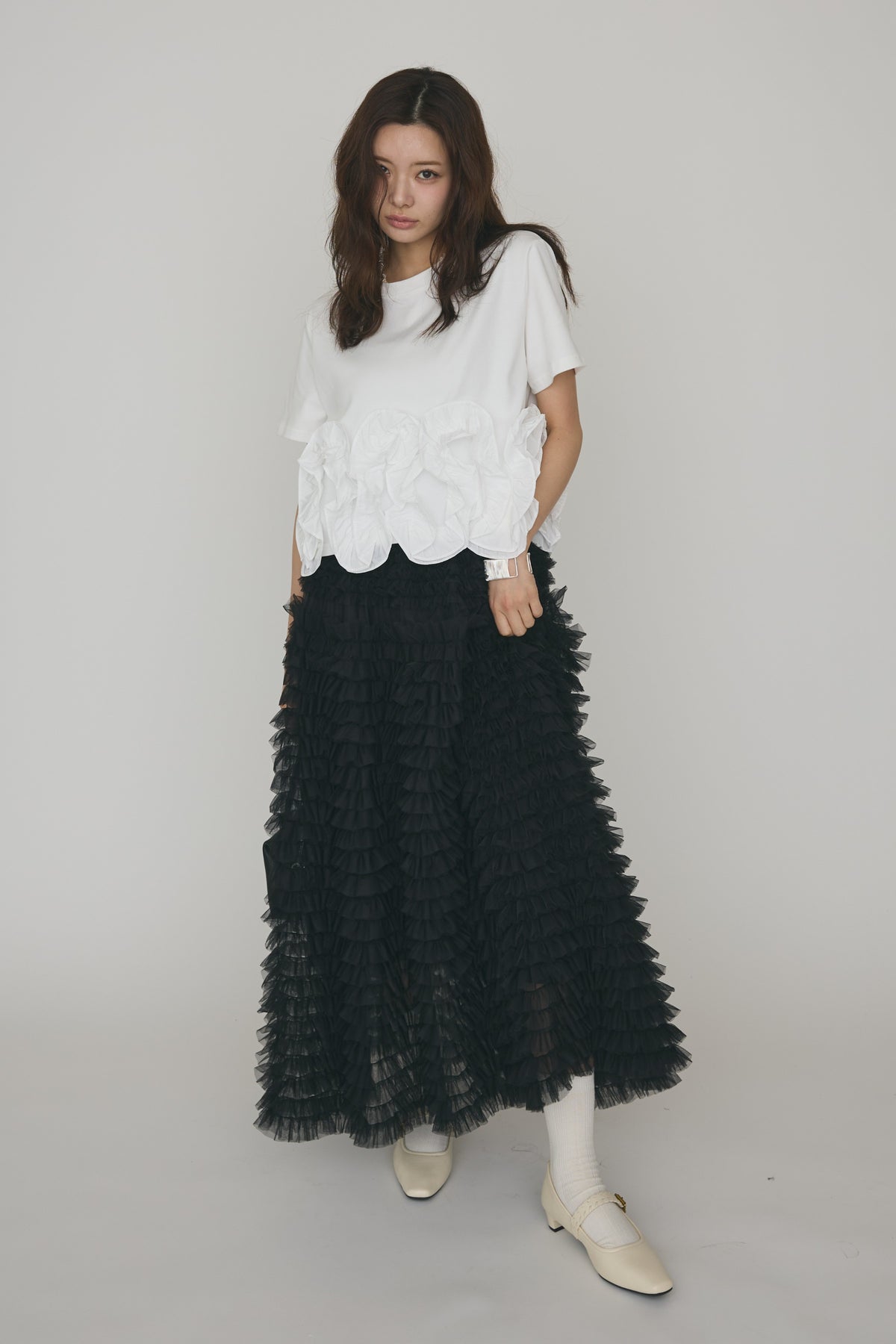 [予約/SET]フリルウェーブヘムカットTシャツ+ホイップチュールティアードスカート(2set)