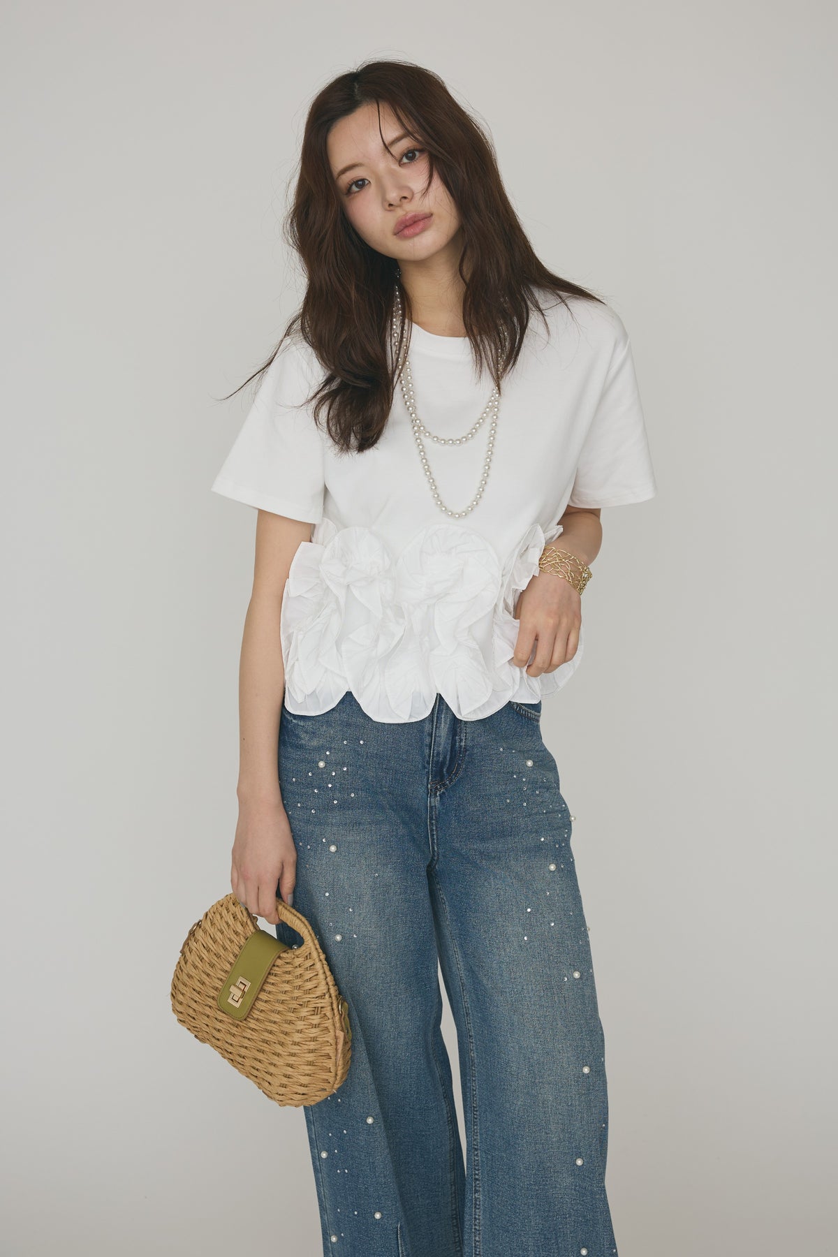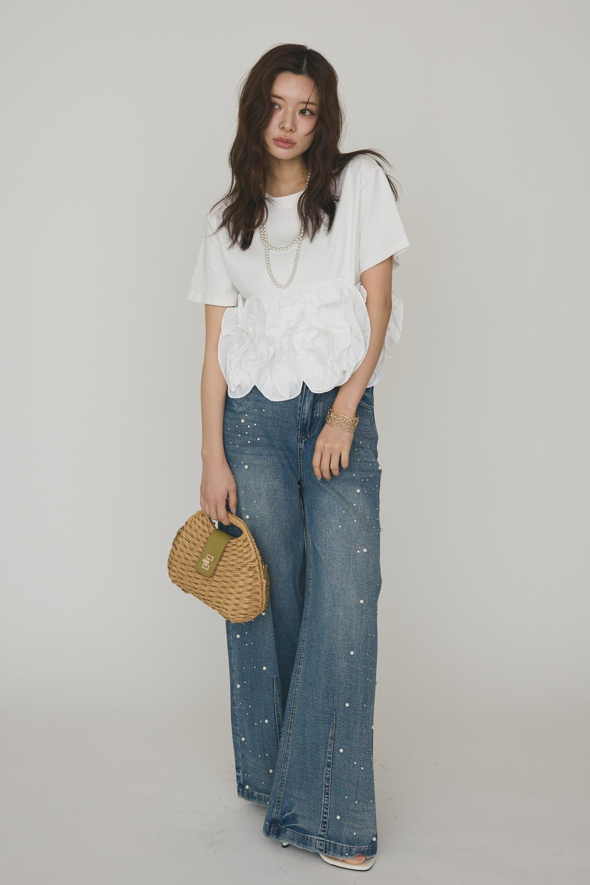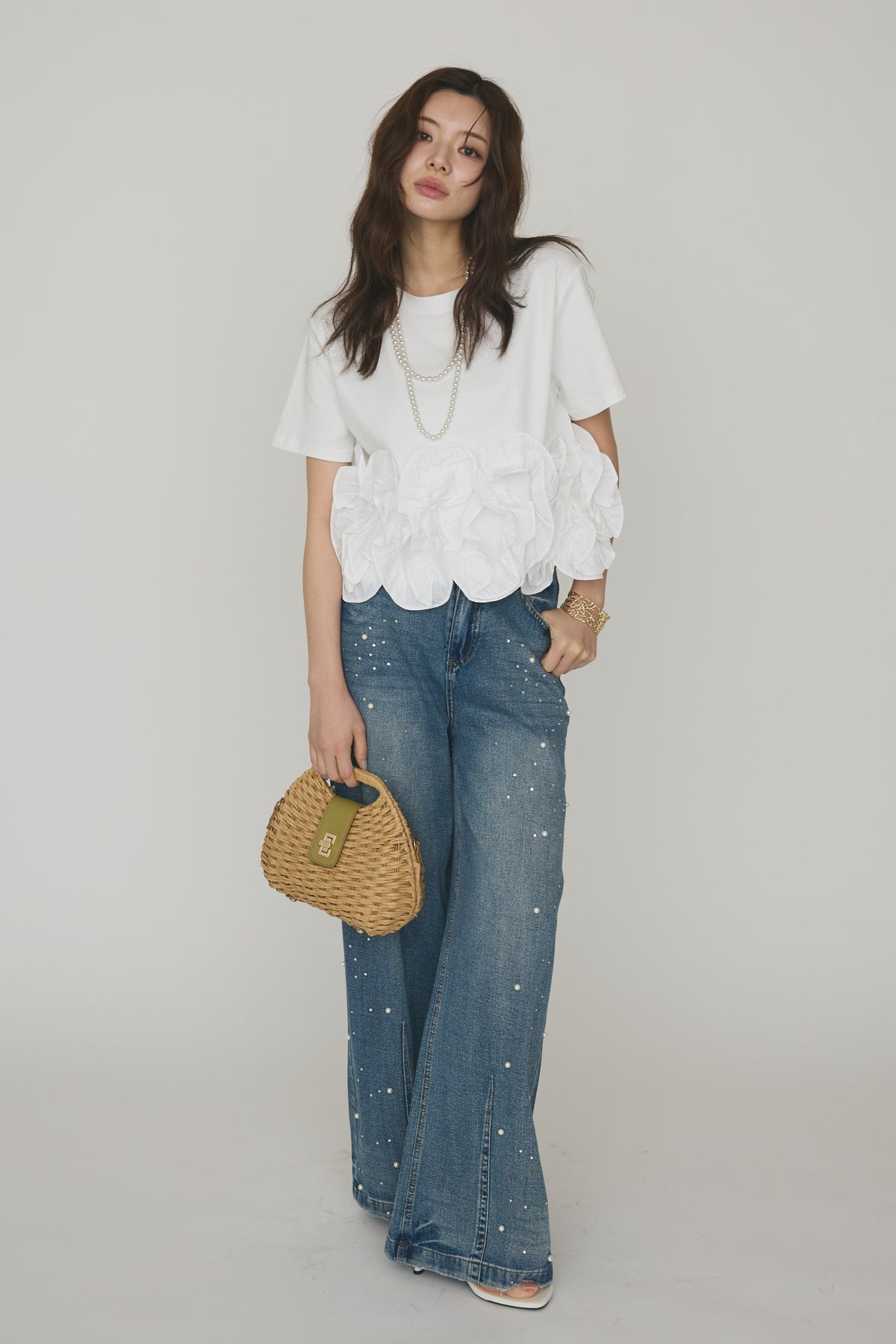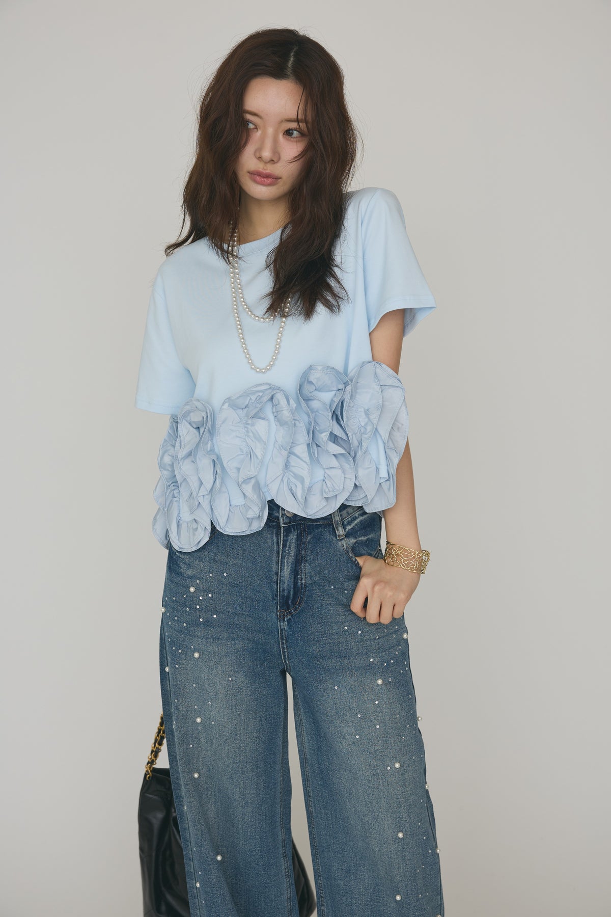 [予約/SET]フリルウェーブヘムカットTシャツ+パールラインストーンハイウエストデニム(2set)