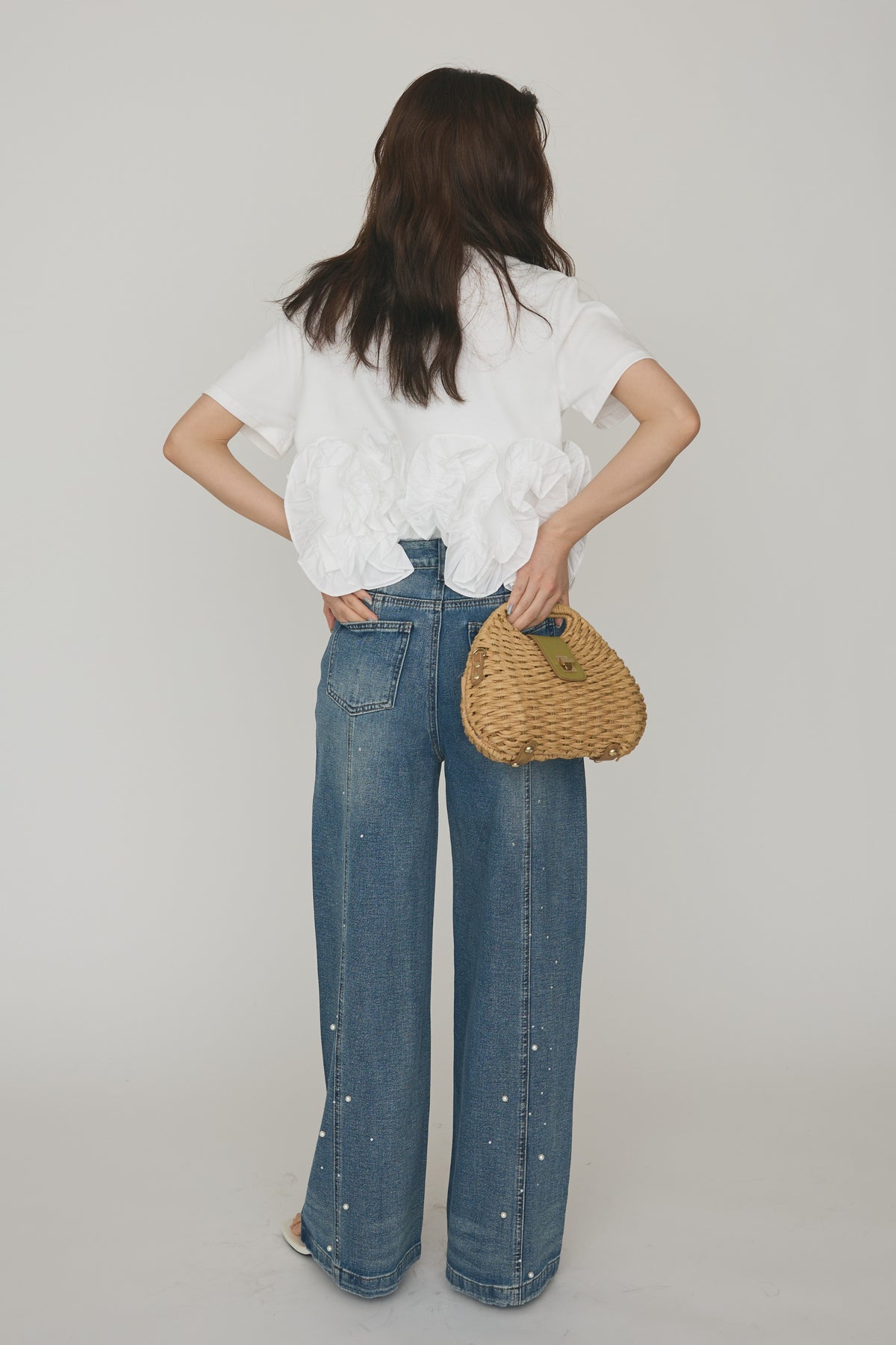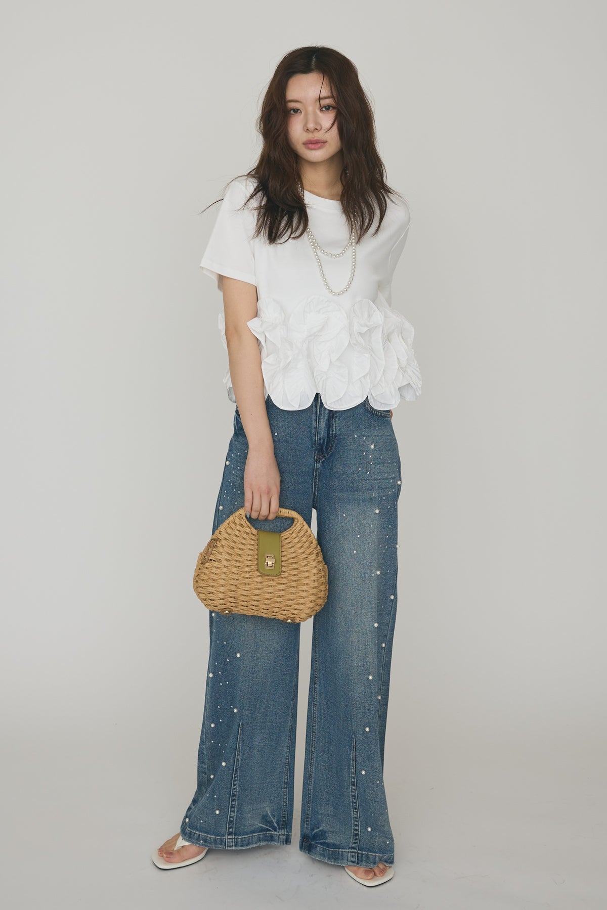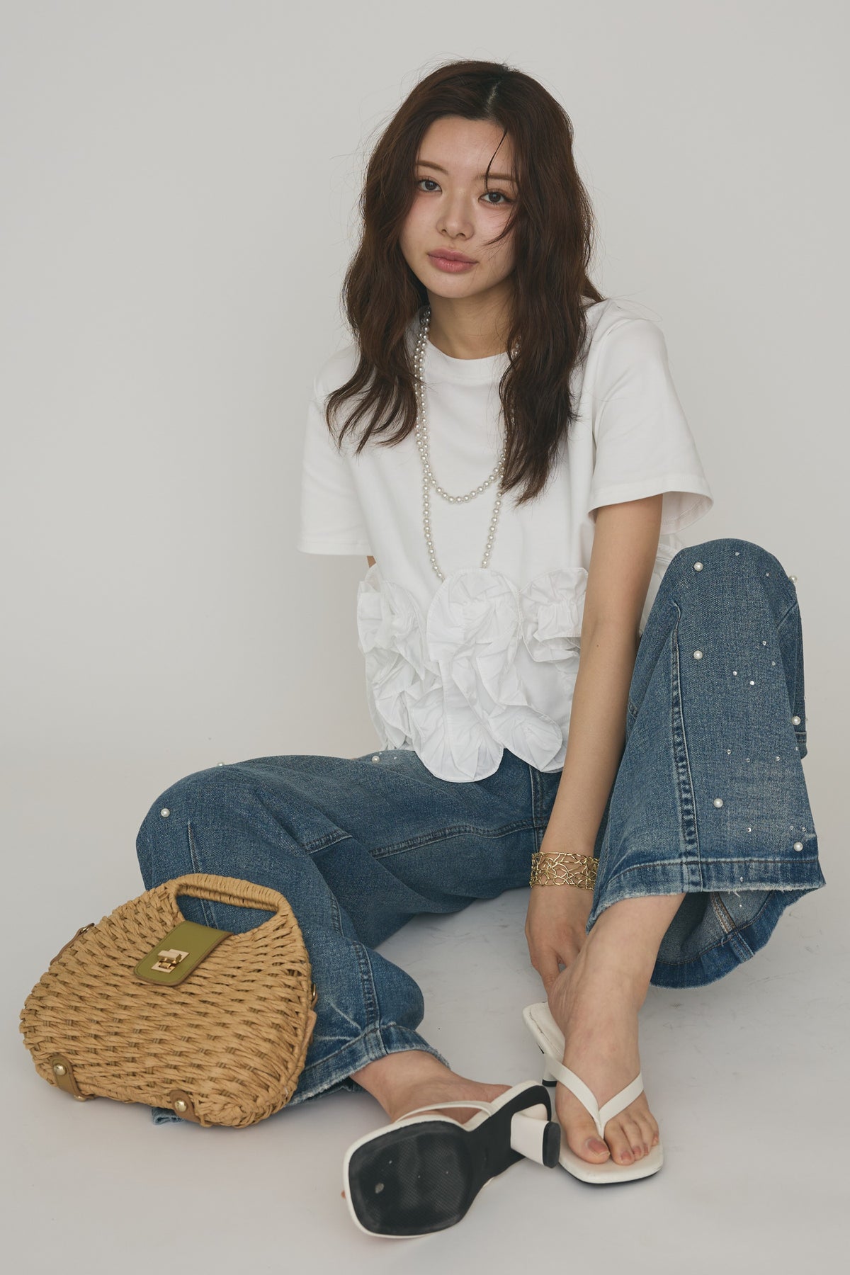 [予約/SET]フリルウェーブヘムカットTシャツ+パールラインストーンハイウエストデニム(2set)