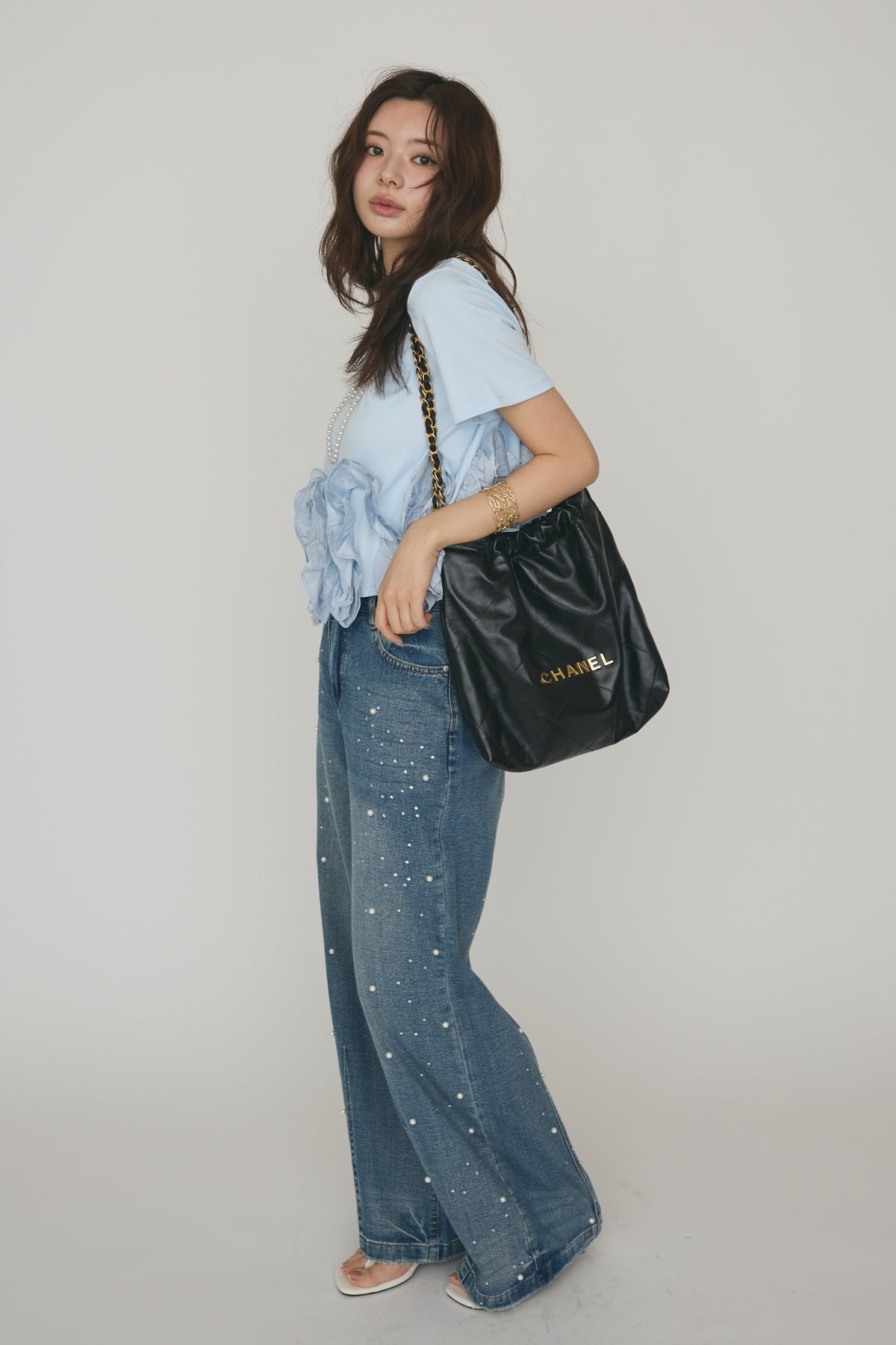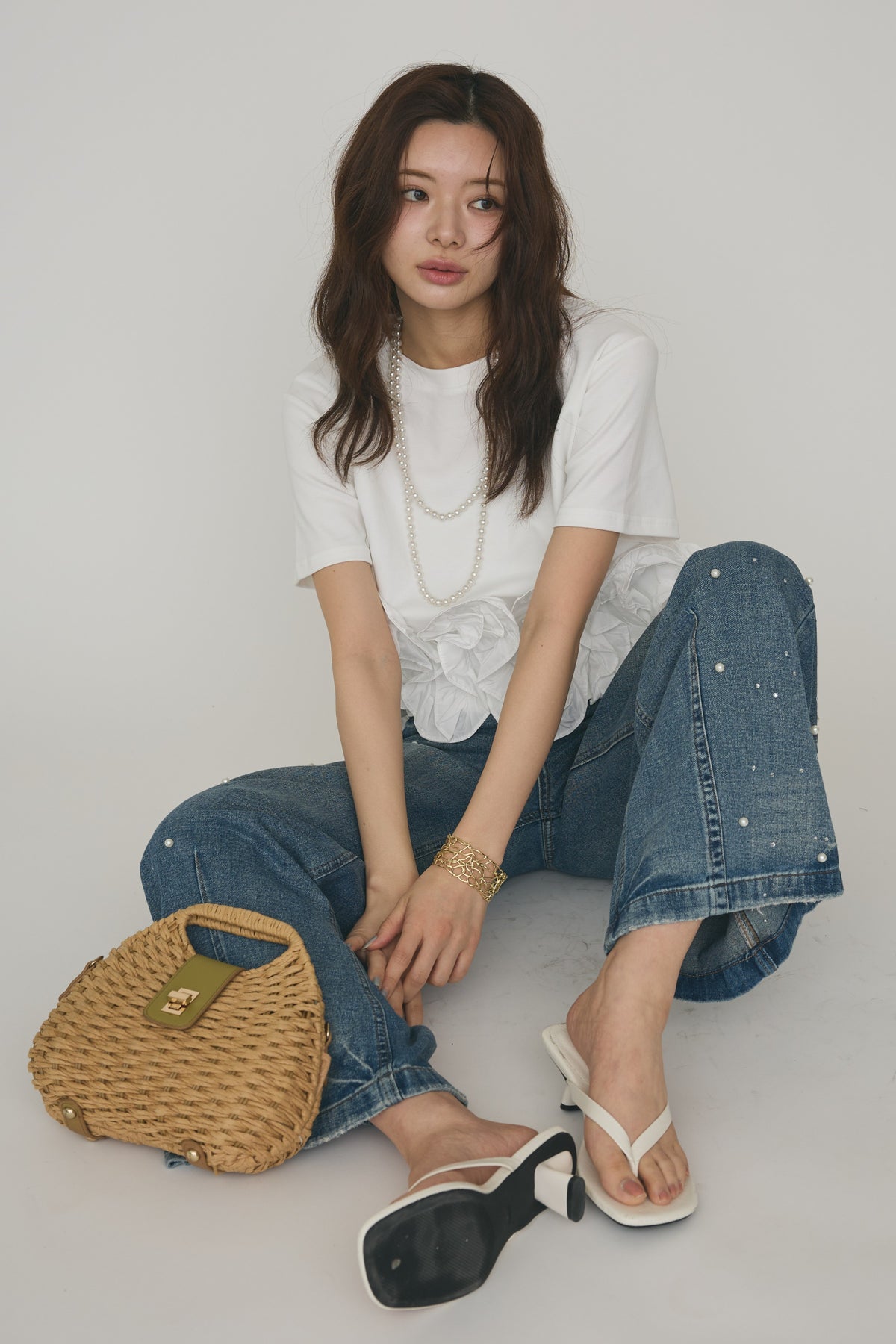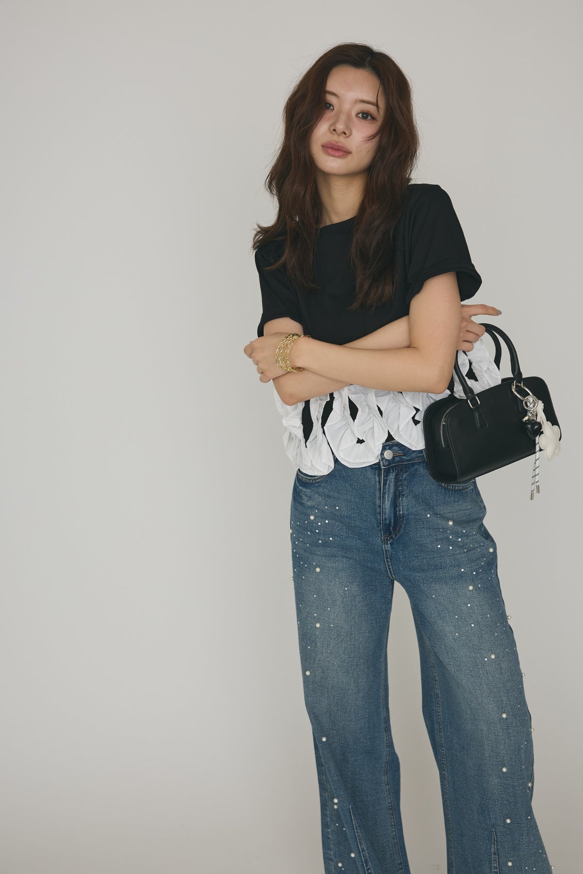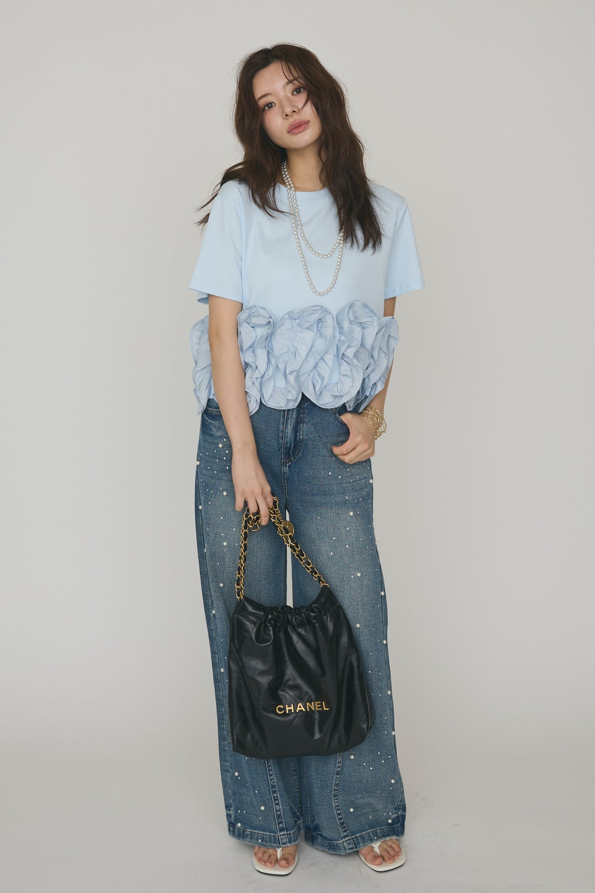 [予約/SET]フリルウェーブヘムカットTシャツ+パールラインストーンハイウエストデニム(2set)