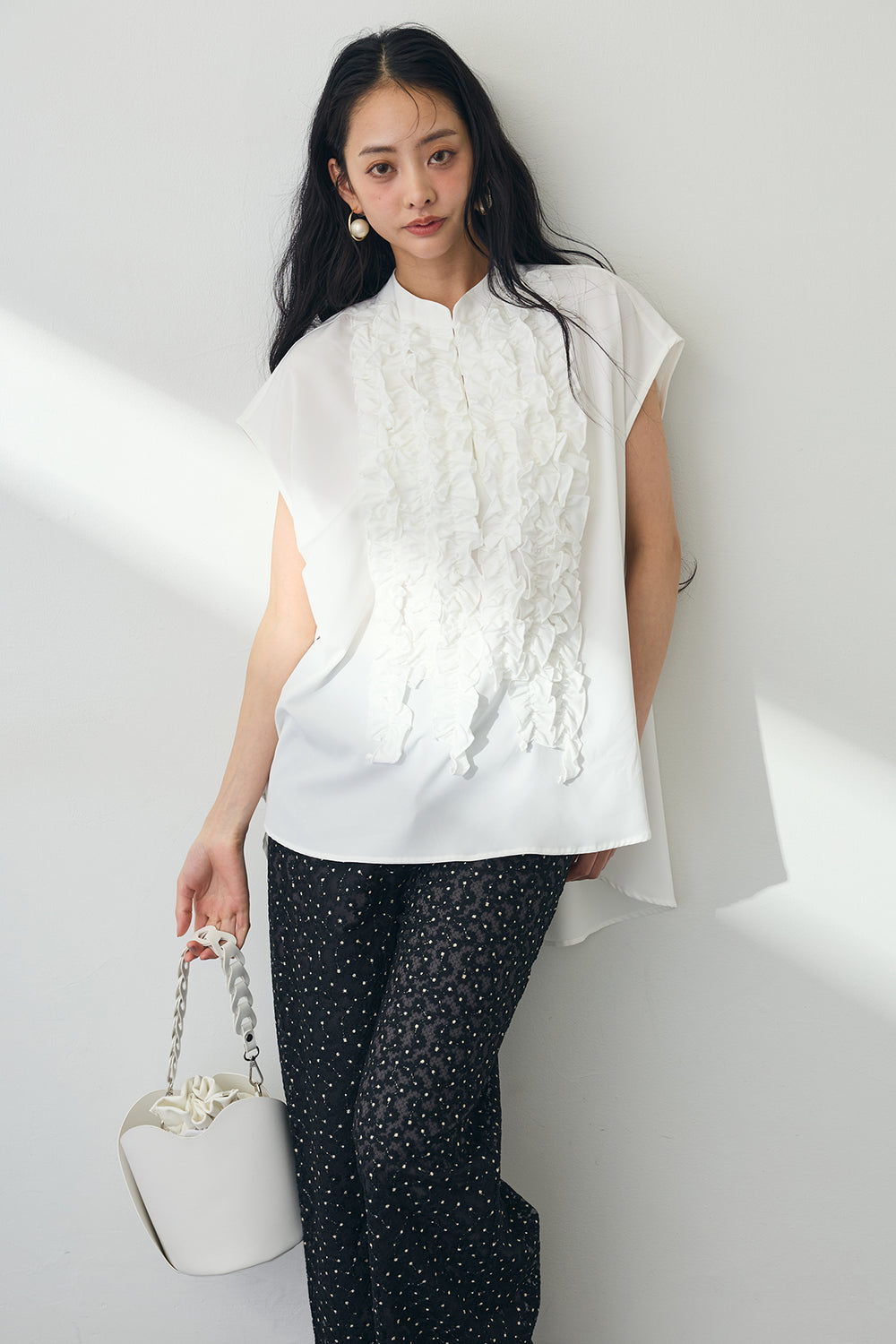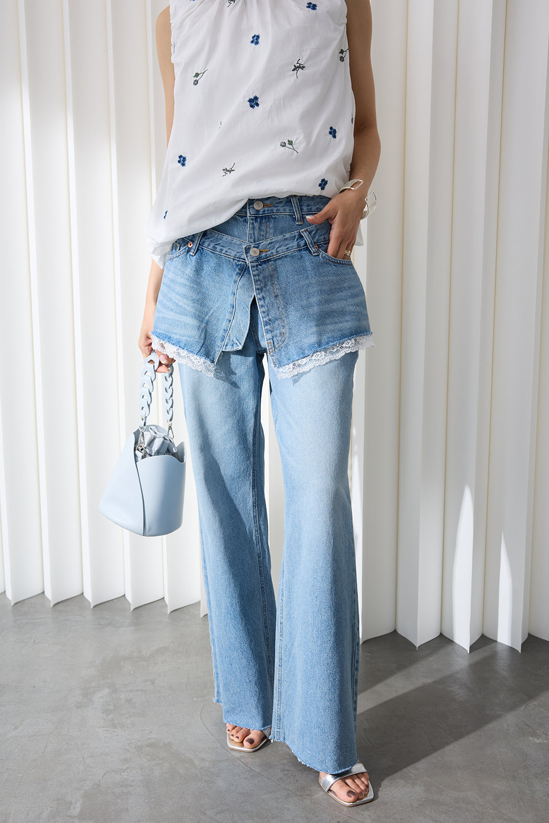 [予約/SET]シースルー×フリルドッキングトップス+パールラインストーンハイウエストデニム(2set)