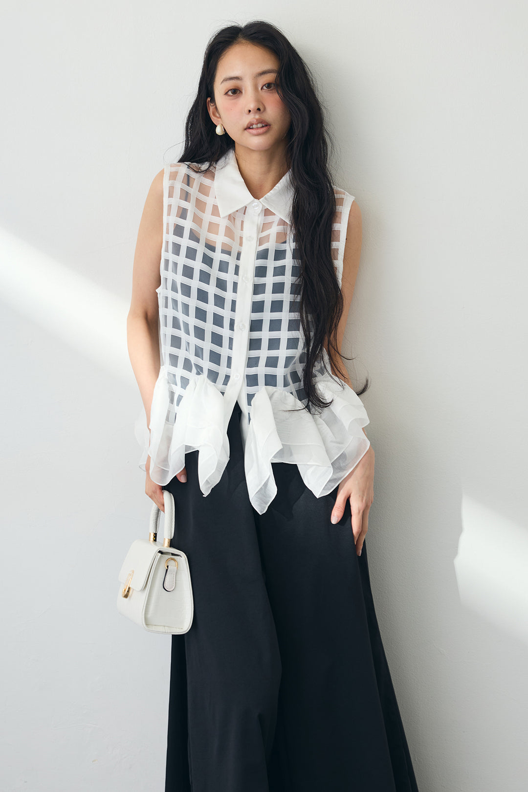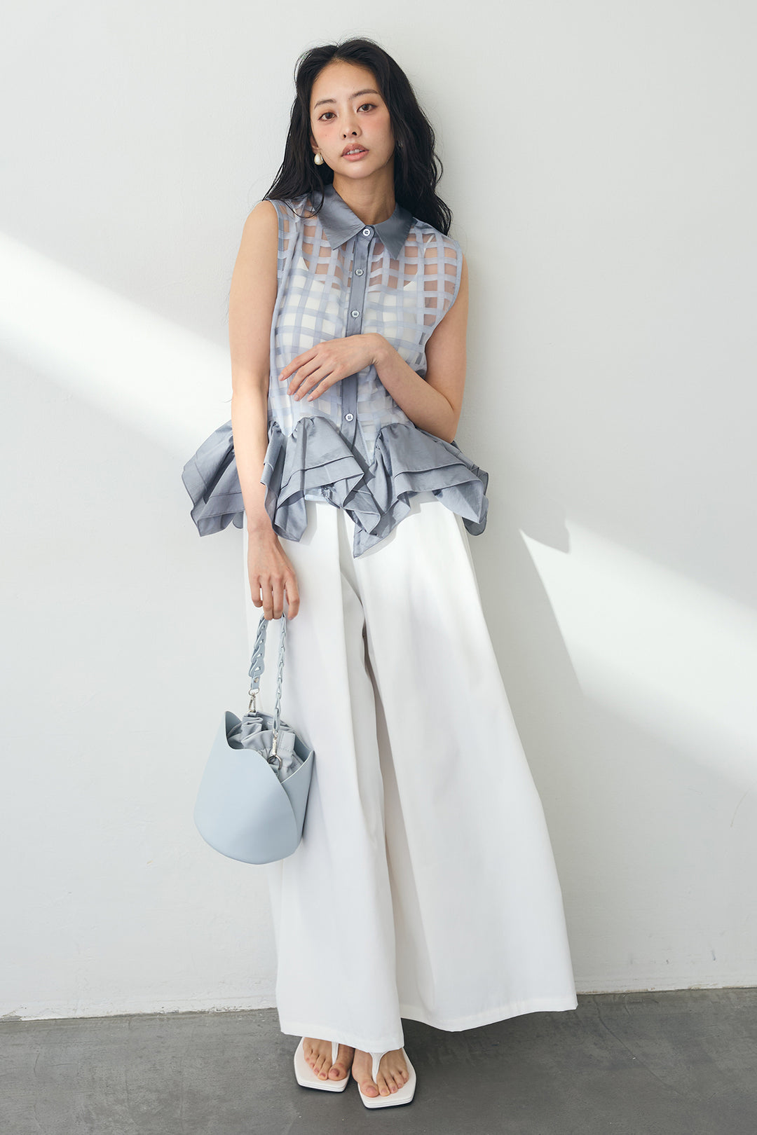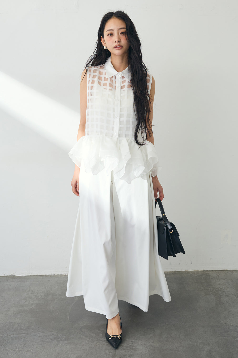 [予約/SET]シアーチェックフリルヘムシャツ+フロントサイドタックワイドパンツ(2set)