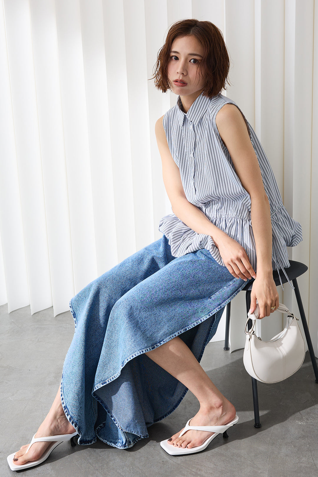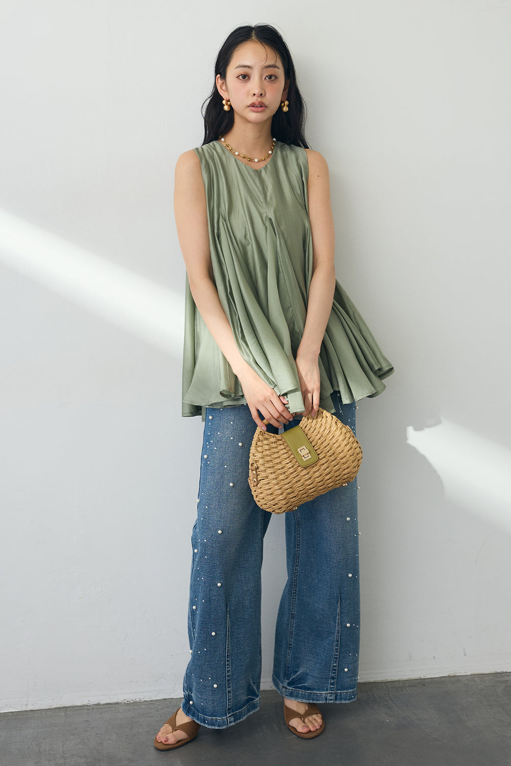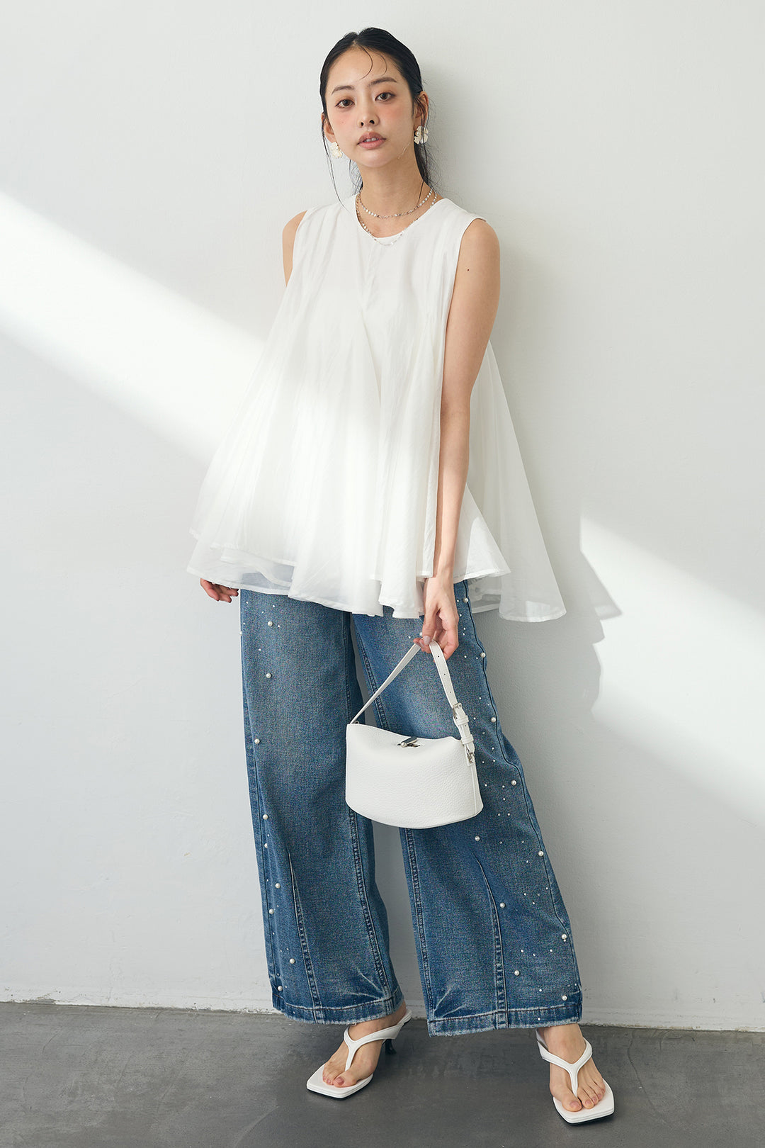 [予約/SET]エアリー切り替えフレアボリュームチュニック+パールラインストーンハイウエストデニム(2set)