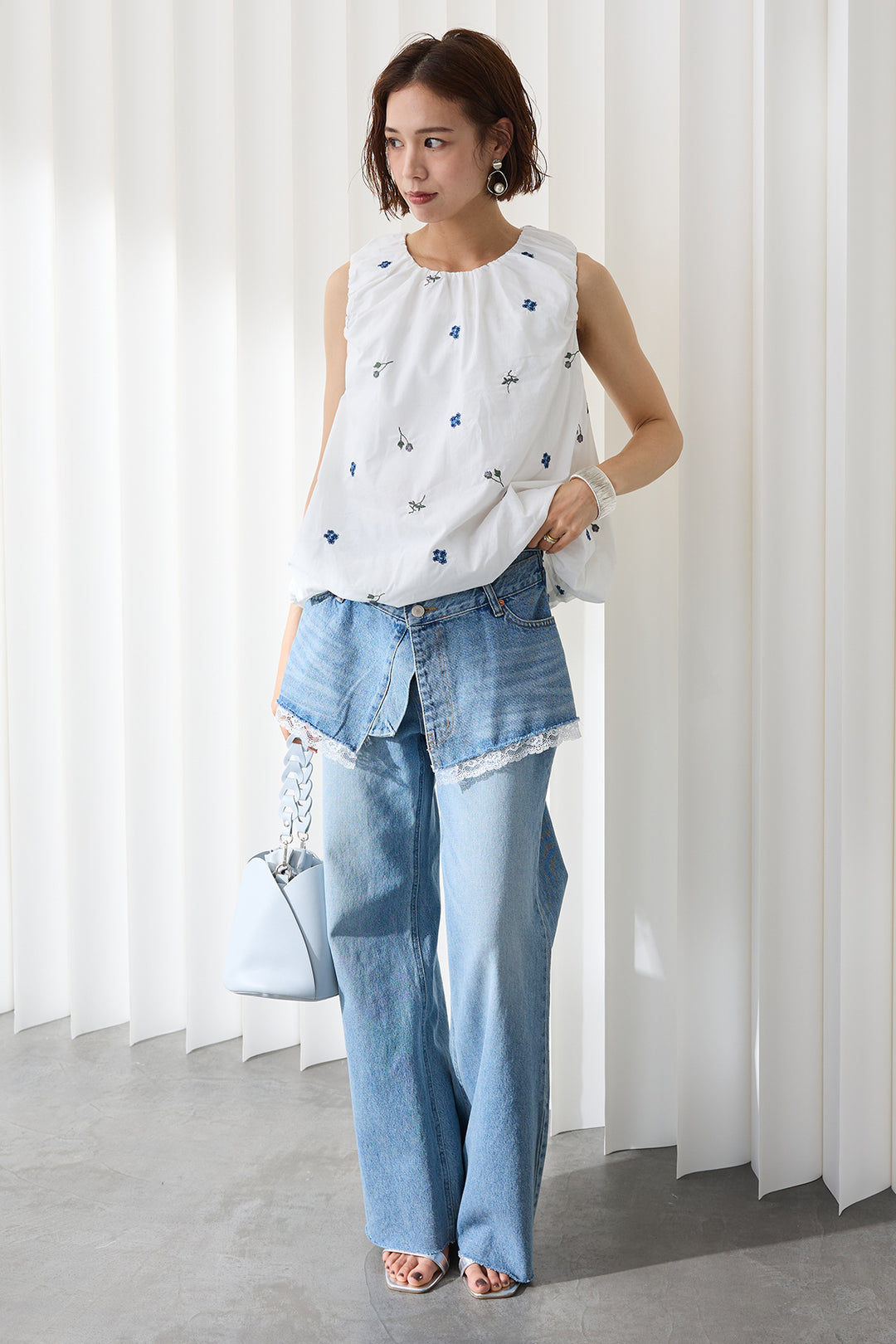 [予約/SET]刺繍ローンバルーンヘムブラウス+レースヘムエプロン付きデニムパンツ(2set)