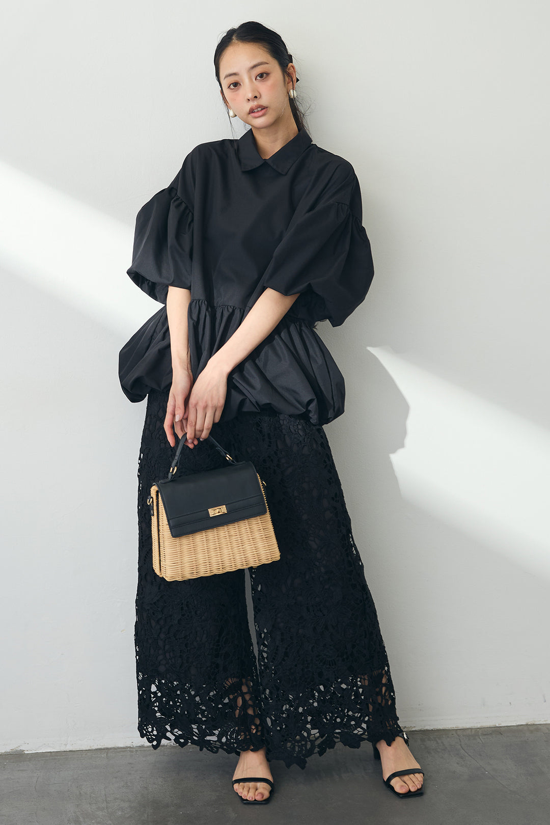 [予約/SET]クロシェレースソフトペプラムトップス+クロシェレースセミワイドパンツ(2set)