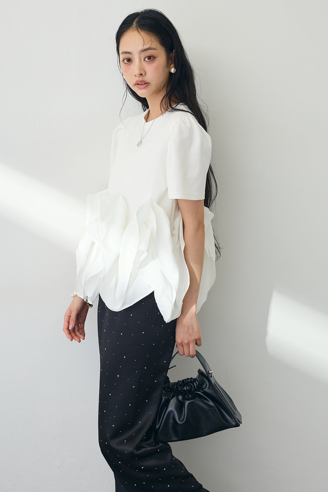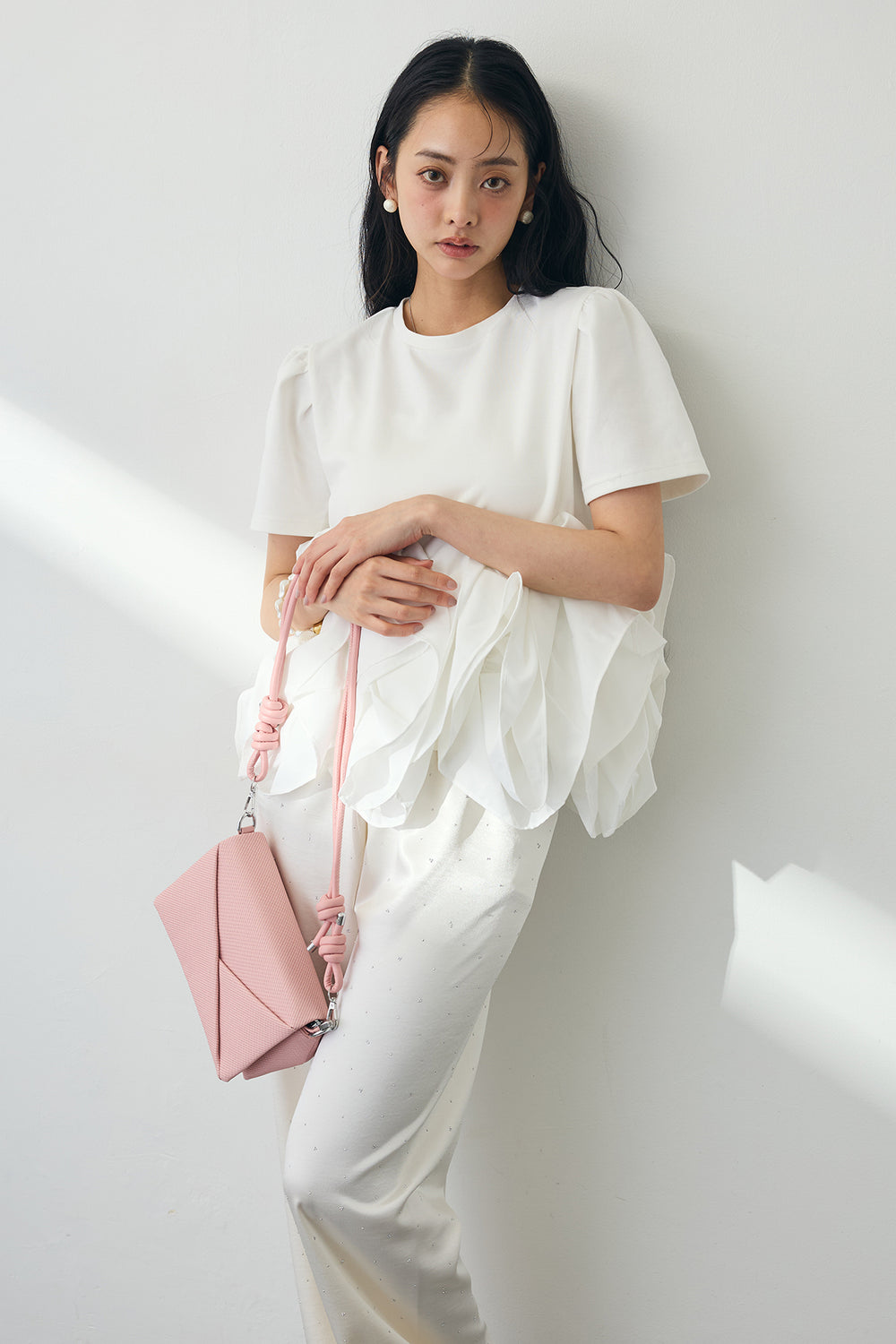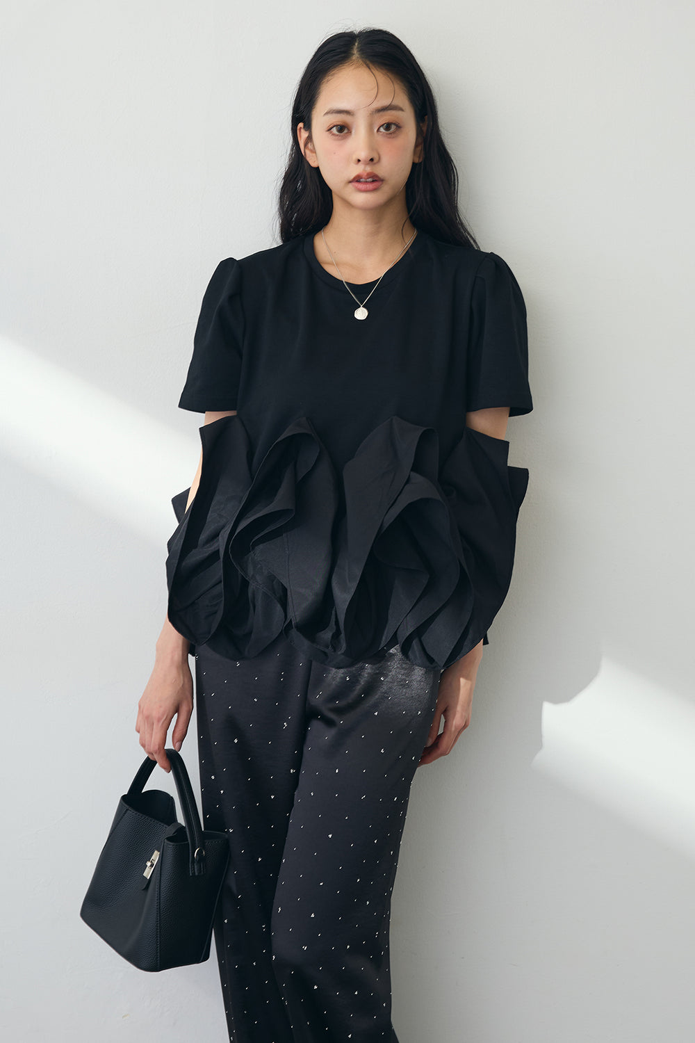 [予約/SET]ブルーミングフリルペプラムトップス+ラインストーンサテンストレートパンツ(2set)