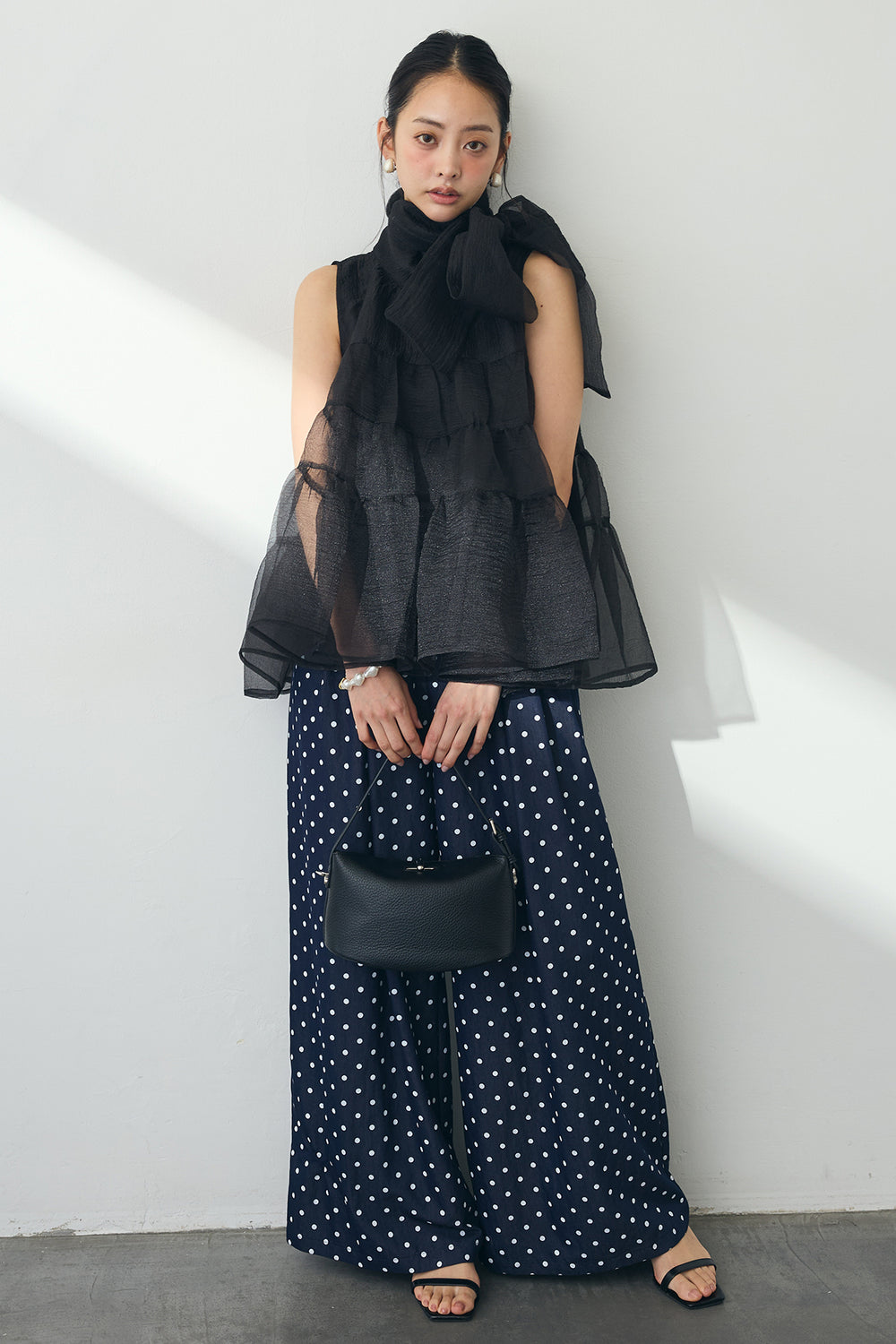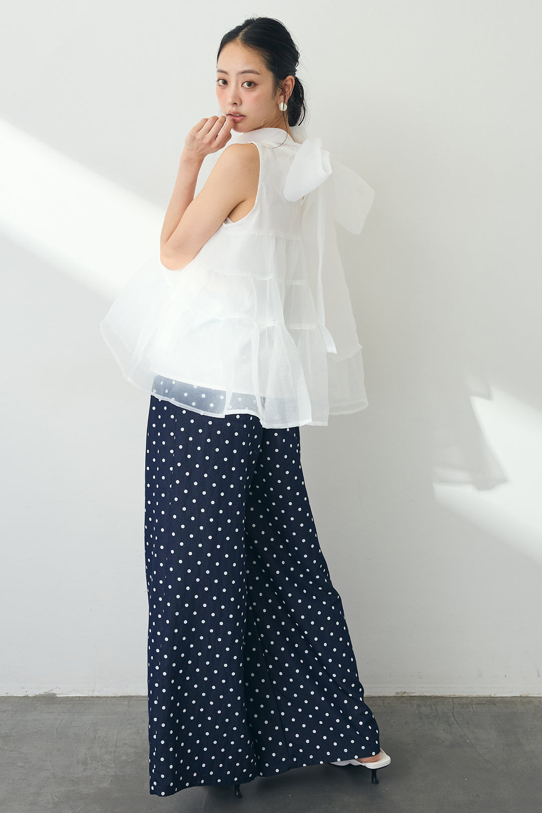 [予約/SET]バックリボンオーガンジーシアーティアードブラウス+ハイウエストドットデニムパンツ(2set)