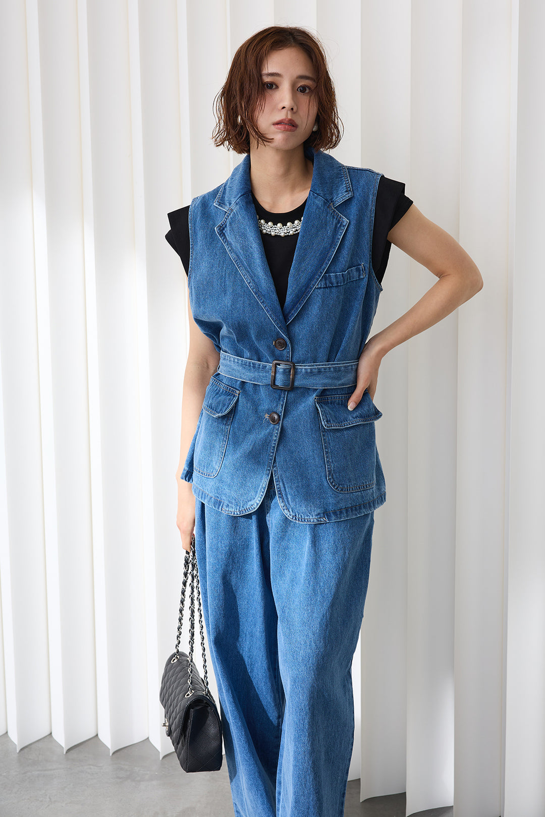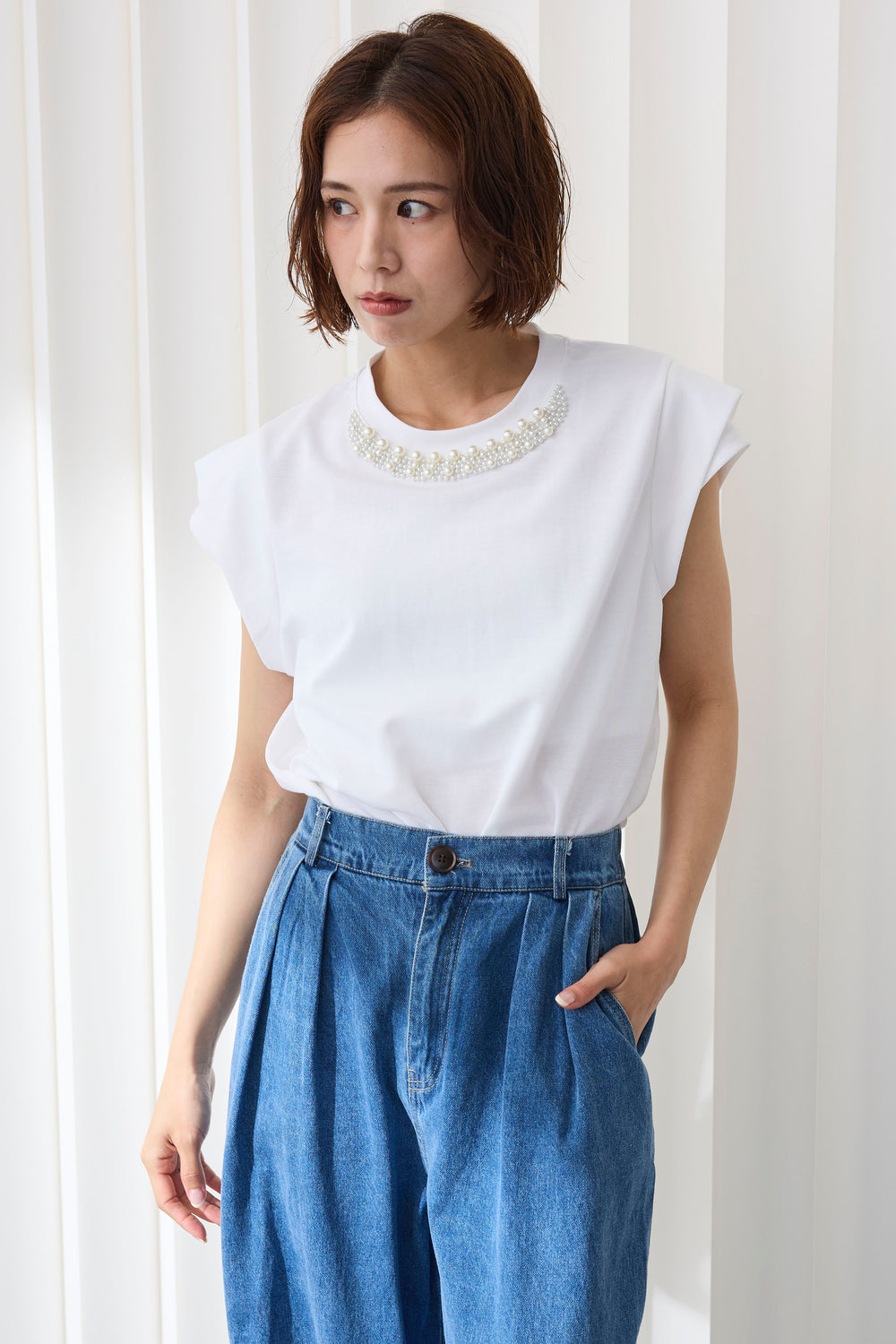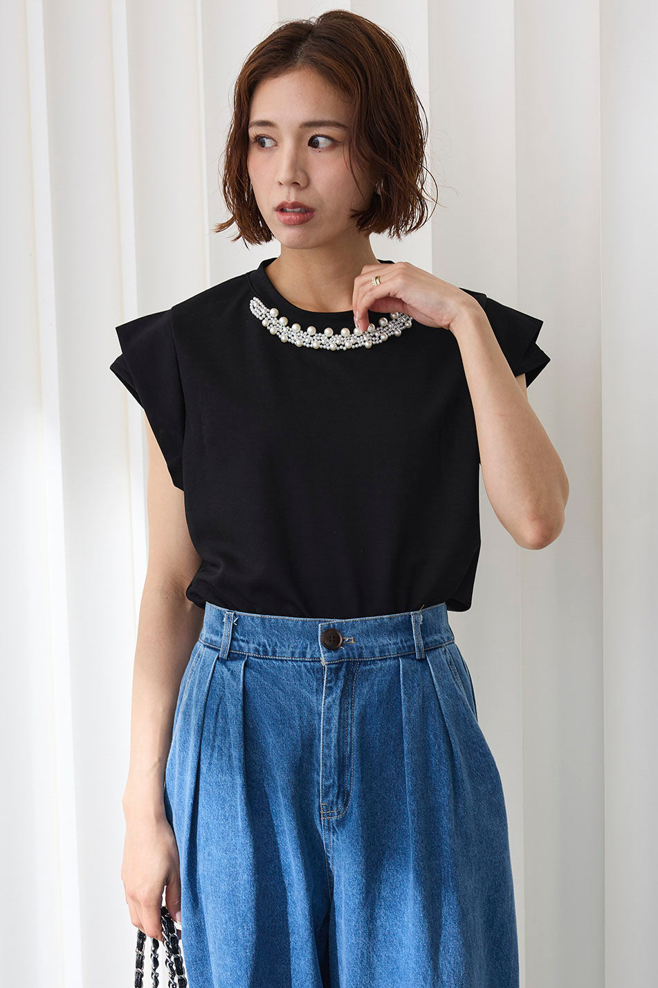 [予約/SET]パールビジューネックダブルフレンチスリーブトップス+テーラーデニムセットアップ(2set)