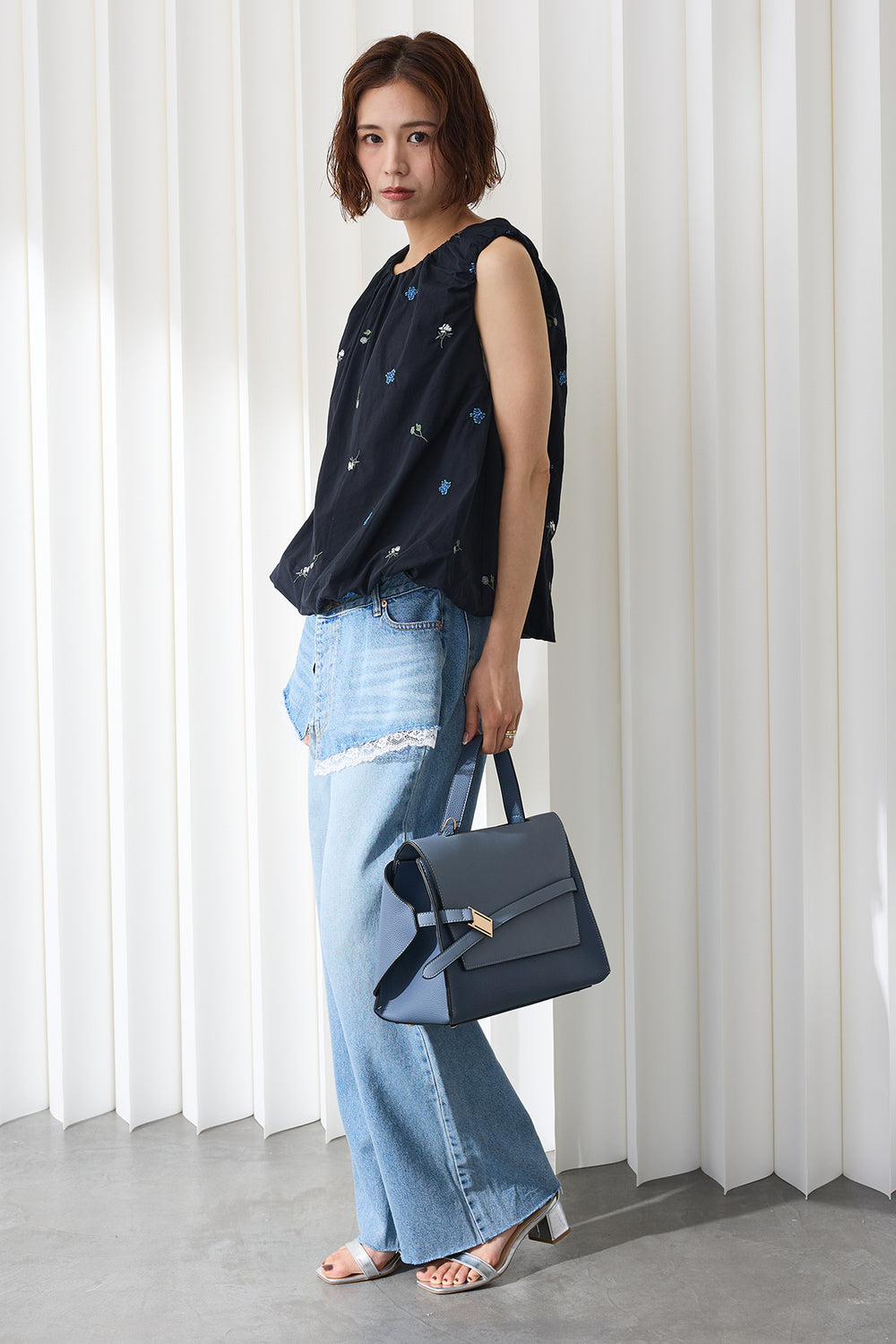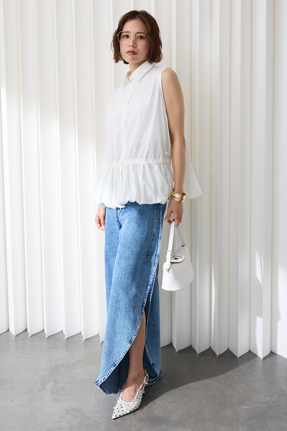 [予約/SET]バルーンヘムノースリブラウス+カーヴィースリットデニムパンツ(2set)
