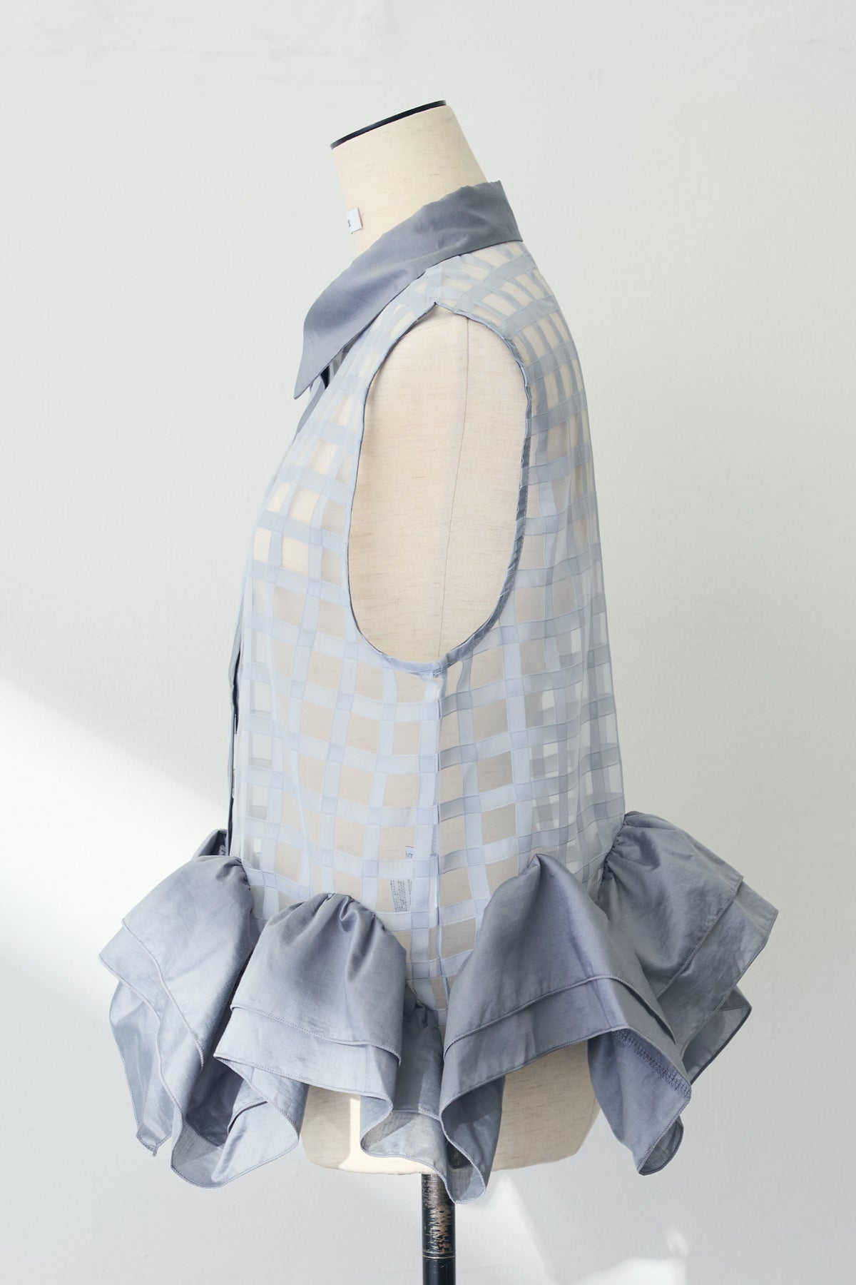 透け感のあるチェック柄の生地にたっぷりとあしらわれた裾のフリルが目を惹く華やかなノースリーブシャツ。 腰回りのボリュームフリルが気になる部分を自然にカバーしつつ女性らしいメリハリのあるシルエットを作り出します。 軽やかなシアー素材が涼しげで上品な印象を与え甘くなりすぎず大人っぽく着こなせるのが魅力。 いつものデニムに合わせてカジュアルに楽しむのはもちろん、すっきりとしたスラックスやタイトスカートを合わせたきれいめな装いにも大活躍します。