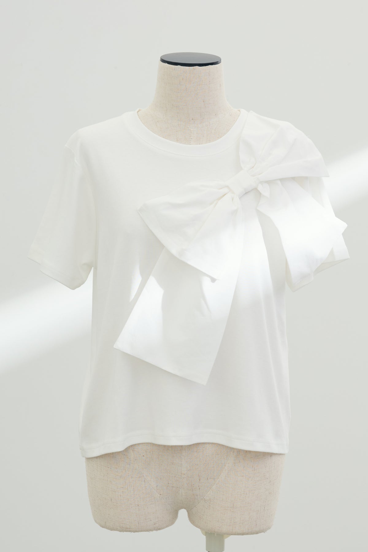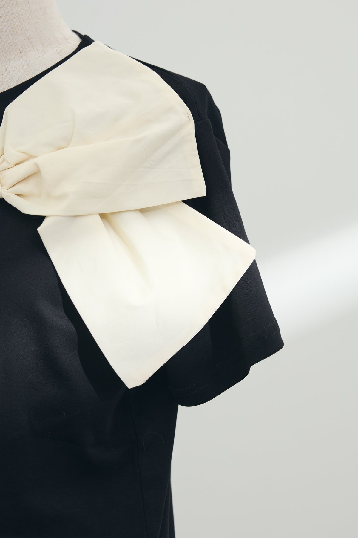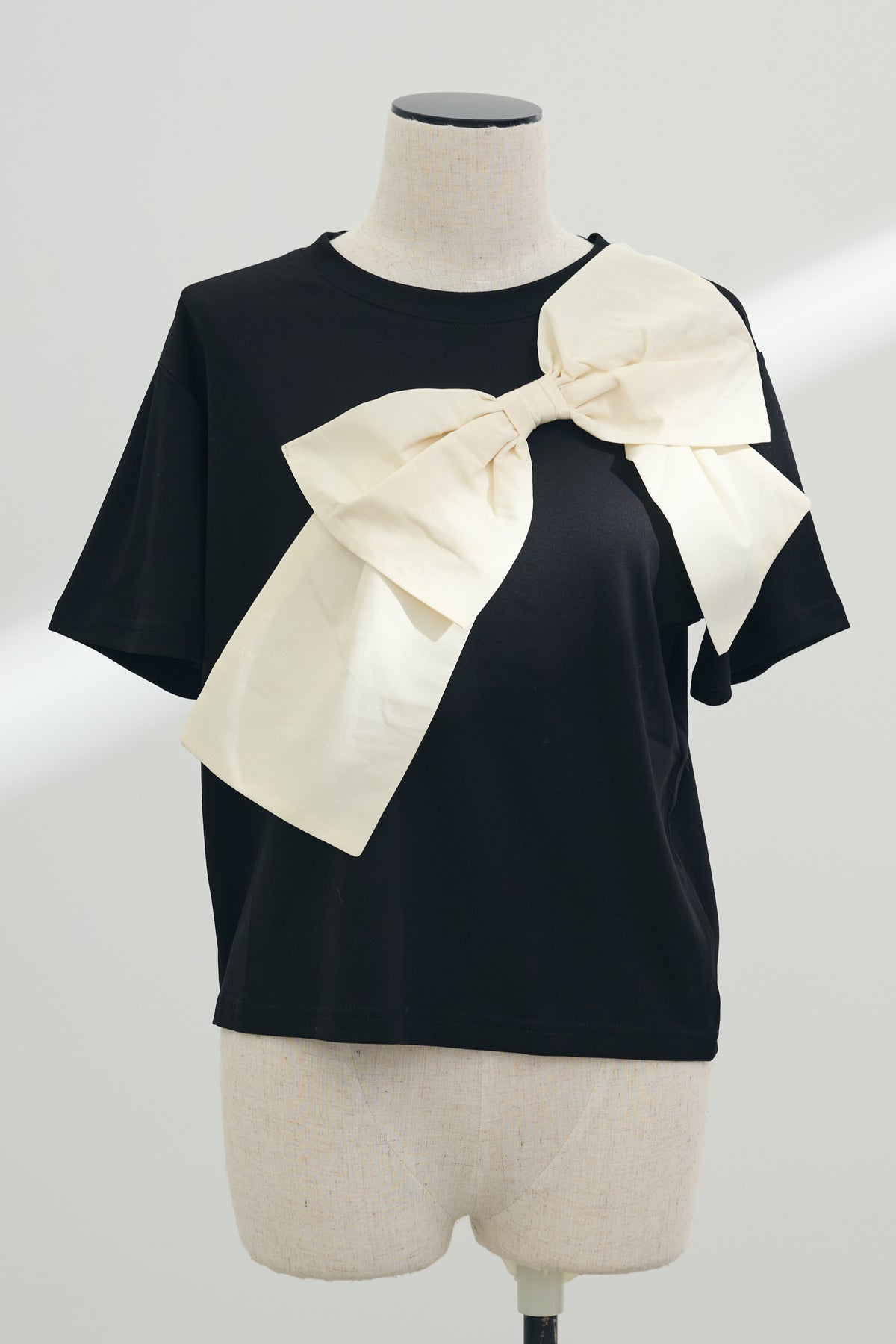 肩周りにあしらわれた存在感たっぷりのビッグリボンが目を惹く、華やかなデザイントップス。 コントラストが効いたブラックと柔らかなワントーンのホワイトが、洗練された大人の表情を演出します。 カジュアルになりがちなTシャツスタイルも、立体的なリボンのアクセントで一気に顔周りが華やぐのが魅力。 定番のデニムに合わせて程よく甘さを抑えたり、タイトスカートを合わせたレディな装いにも幅広く活躍します。