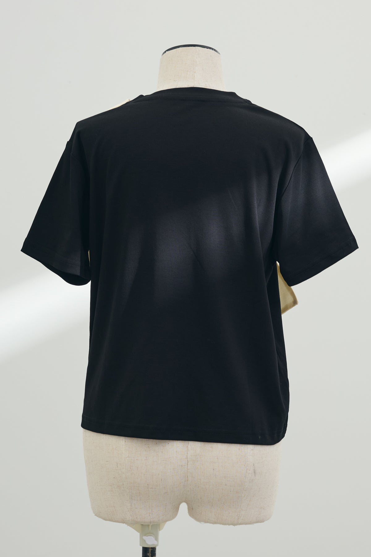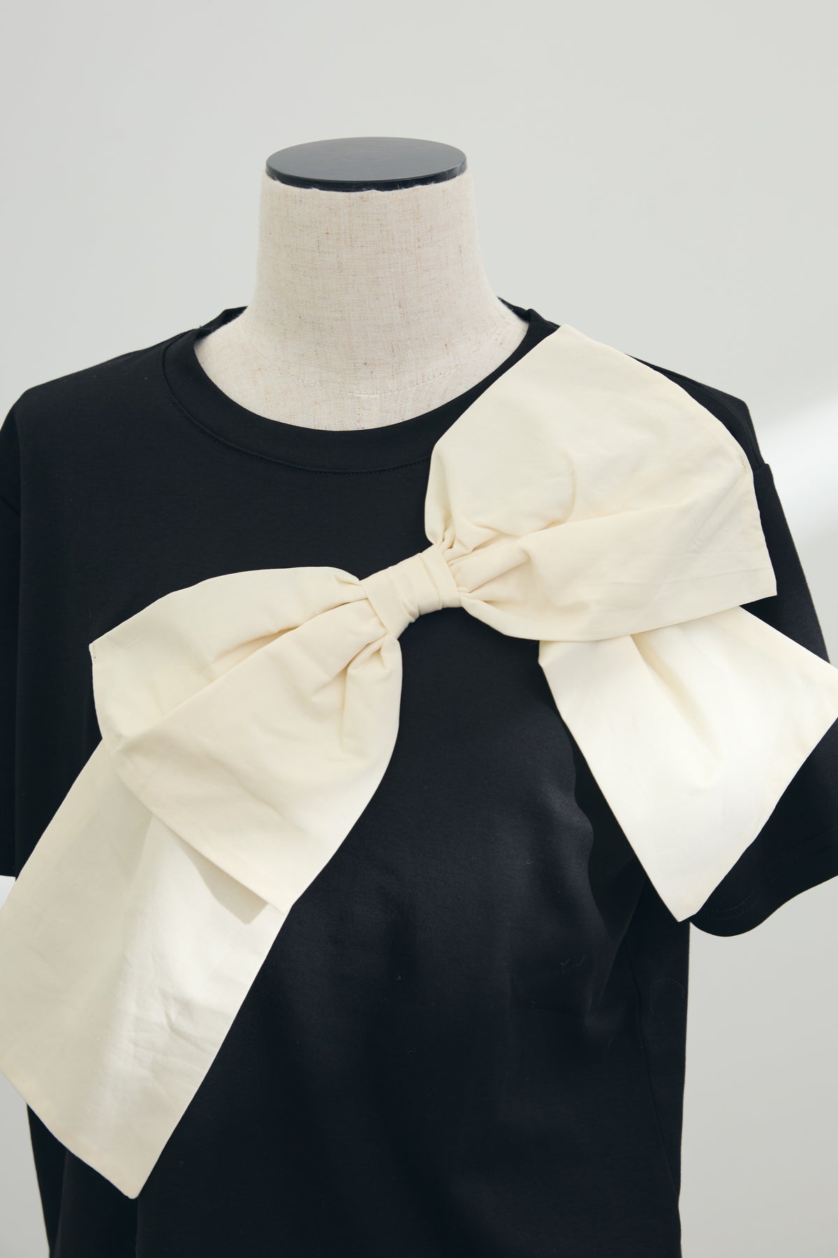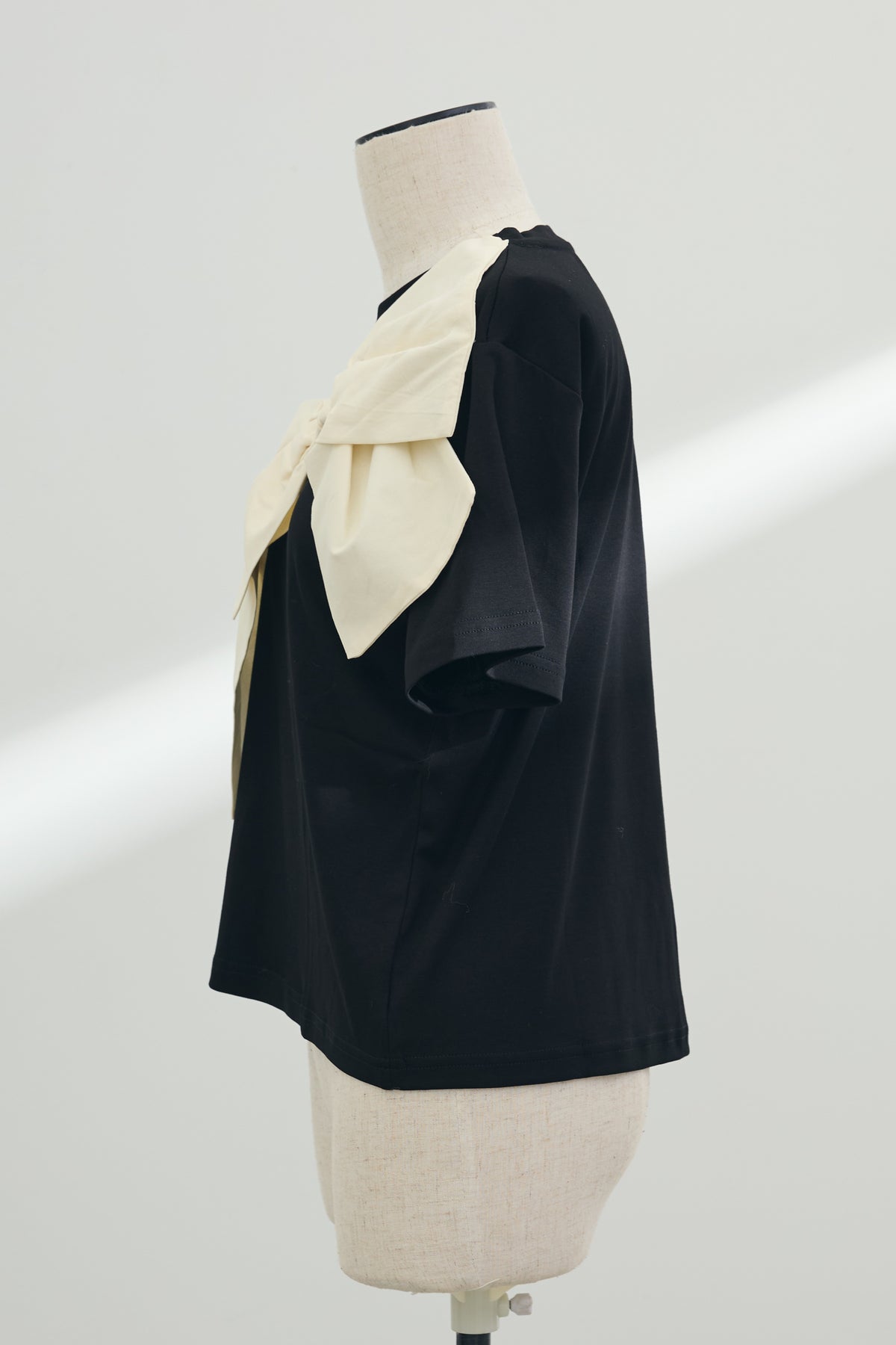 肩周りにあしらわれた存在感たっぷりのビッグリボンが目を惹く、華やかなデザイントップス。 コントラストが効いたブラックと柔らかなワントーンのホワイトが、洗練された大人の表情を演出します。 カジュアルになりがちなTシャツスタイルも、立体的なリボンのアクセントで一気に顔周りが華やぐのが魅力。 定番のデニムに合わせて程よく甘さを抑えたり、タイトスカートを合わせたレディな装いにも幅広く活躍します。
