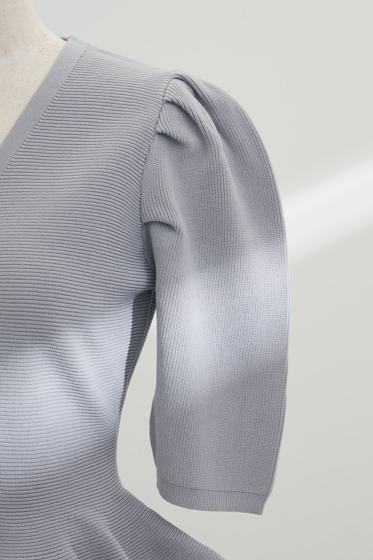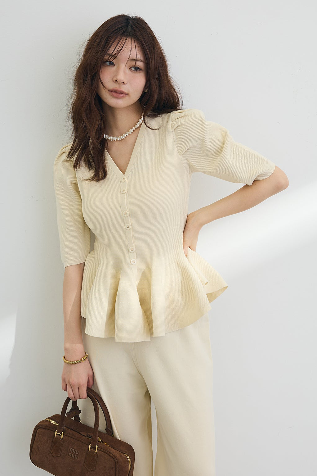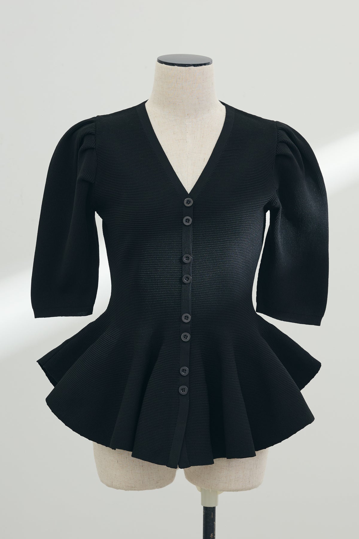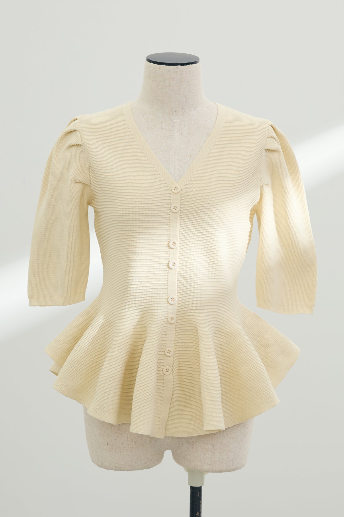 ふんわりと広がる裾のペプラムデザインが、女性らしい美しいシルエットを叶えるハーフスリーブニット。 立体的なふんわりとした袖が気になる二の腕を優しくカバーし、すっきりとしたVネックがデコルテを美しく引き立てます。 上半身に程よくフィットする編み地がメリハリを生み出し、着るだけで自然なスタイルアップを実現する優秀な一枚。 ゆったりとしたワイドパンツを合わせたエレガントな装いや、細身のパンツを合わせたメリハリのあるきれいめコーディネートにも大活躍します。