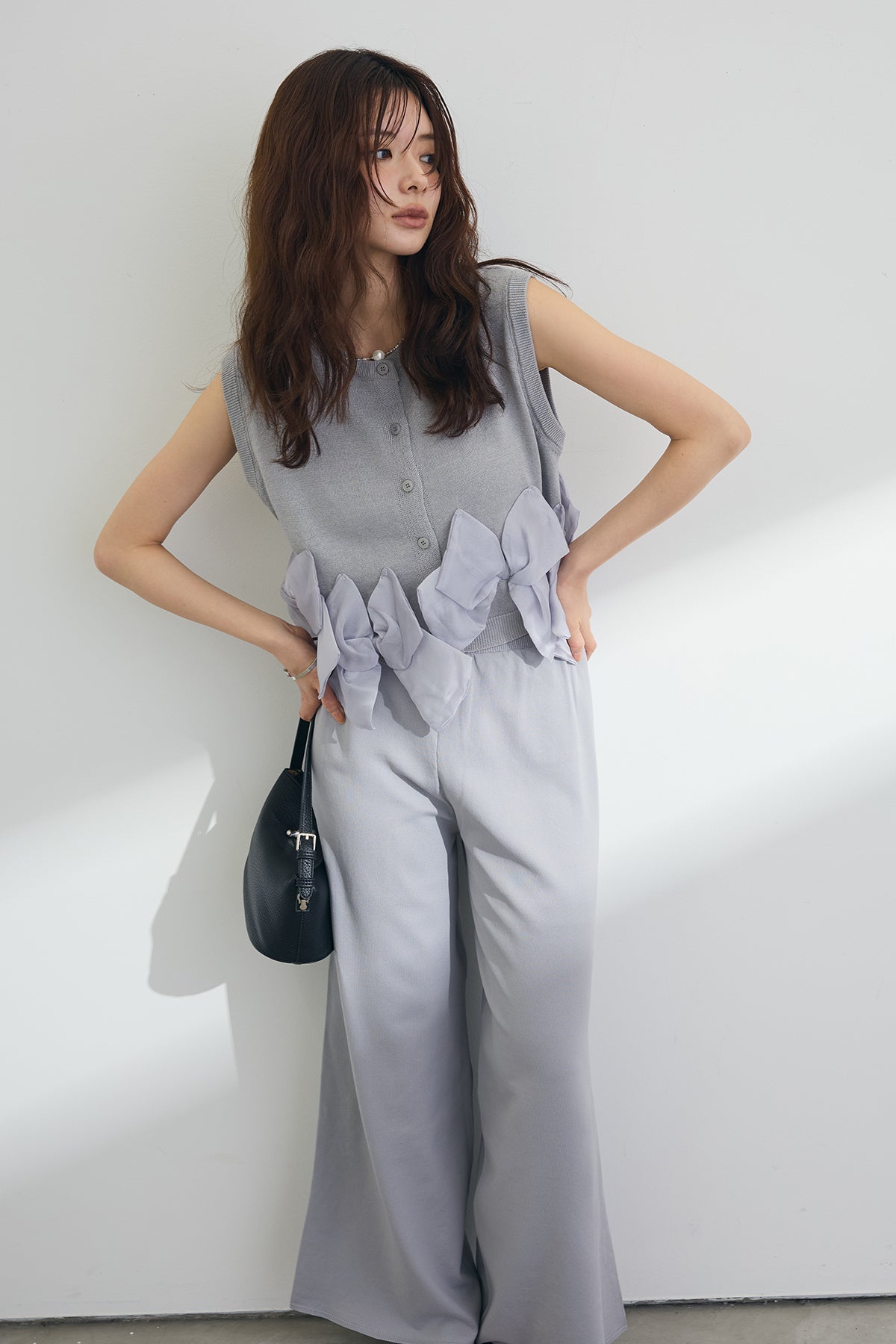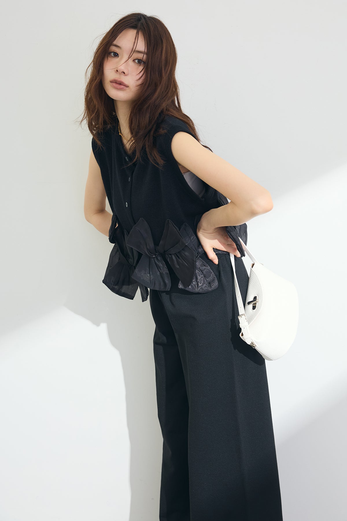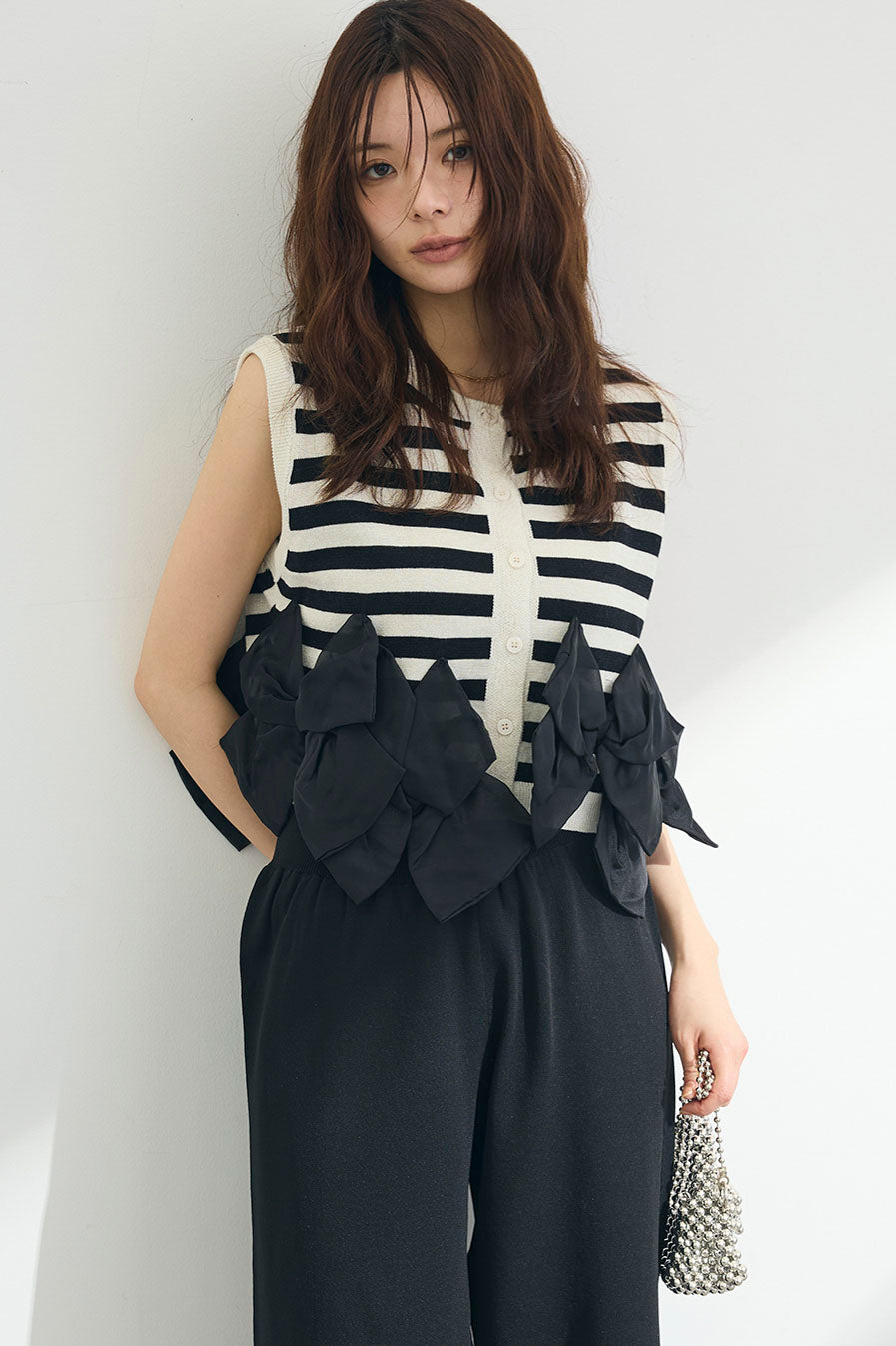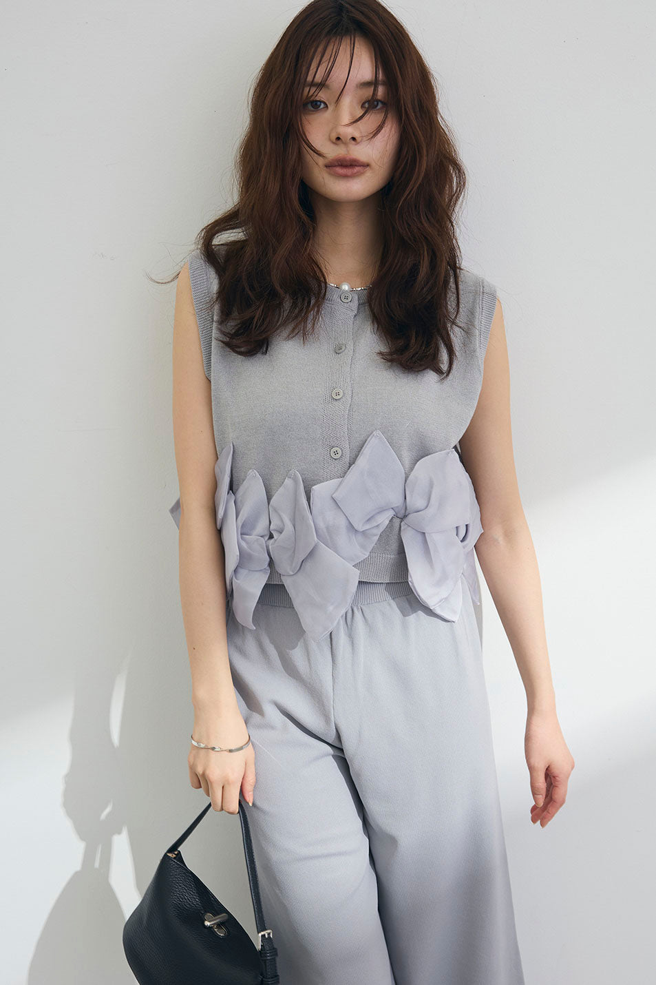 裾にあしらわれたオーガンジー素材の立体的なリボンが、大人の可愛らしさを引き立てるスリーブレスニット。 首元がすっきりと見えるクルーネックと、コンパクトな丈感が、上半身を華奢に見せてくれます。 シンプルなボトムスに合わせるだけで、パッと華やぐ主役級のデザインが魅力です。 ワイドパンツを合わせて甘さを抑えたスタイリングや、ふんわりとしたスカートを合わせたフェミニンなコーディネートにもぴったりです。