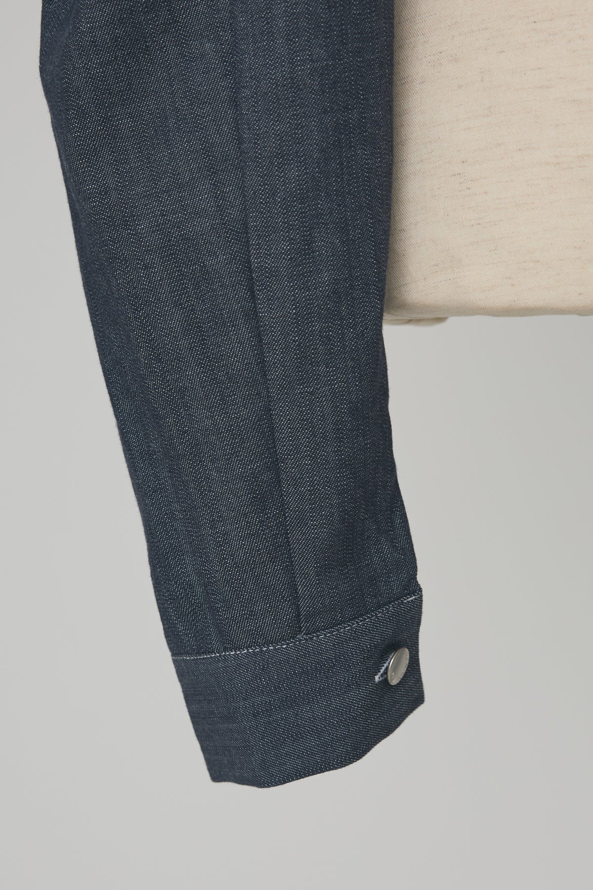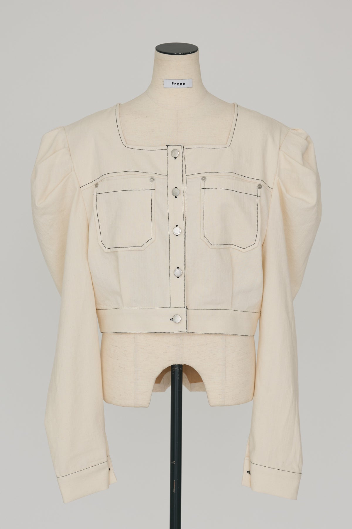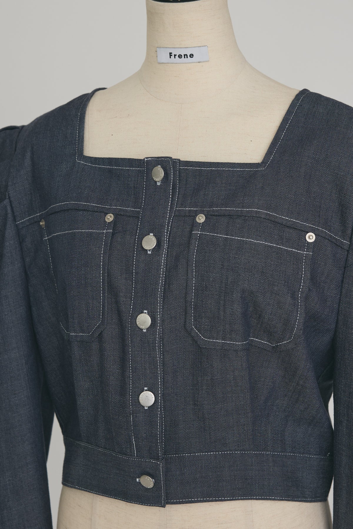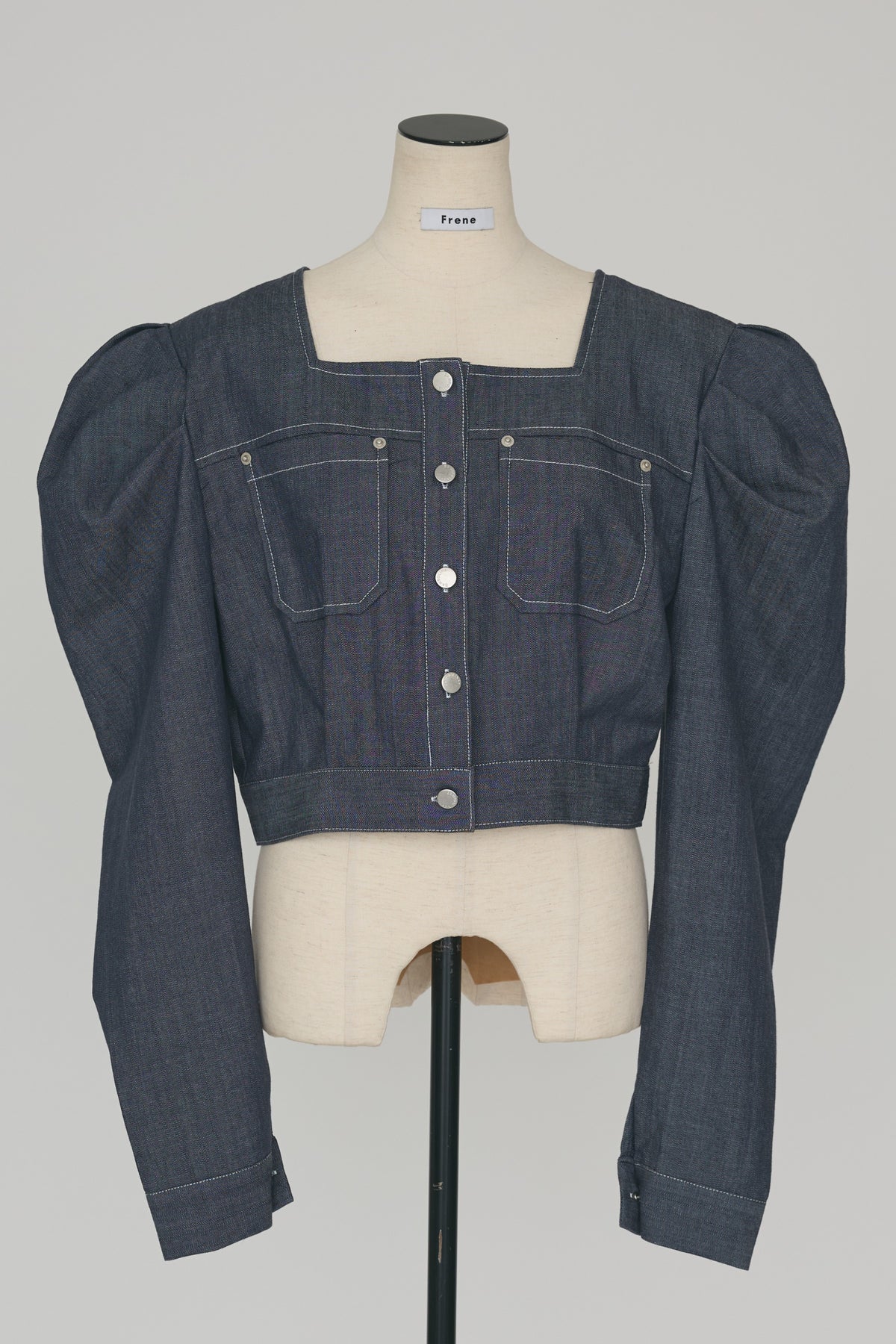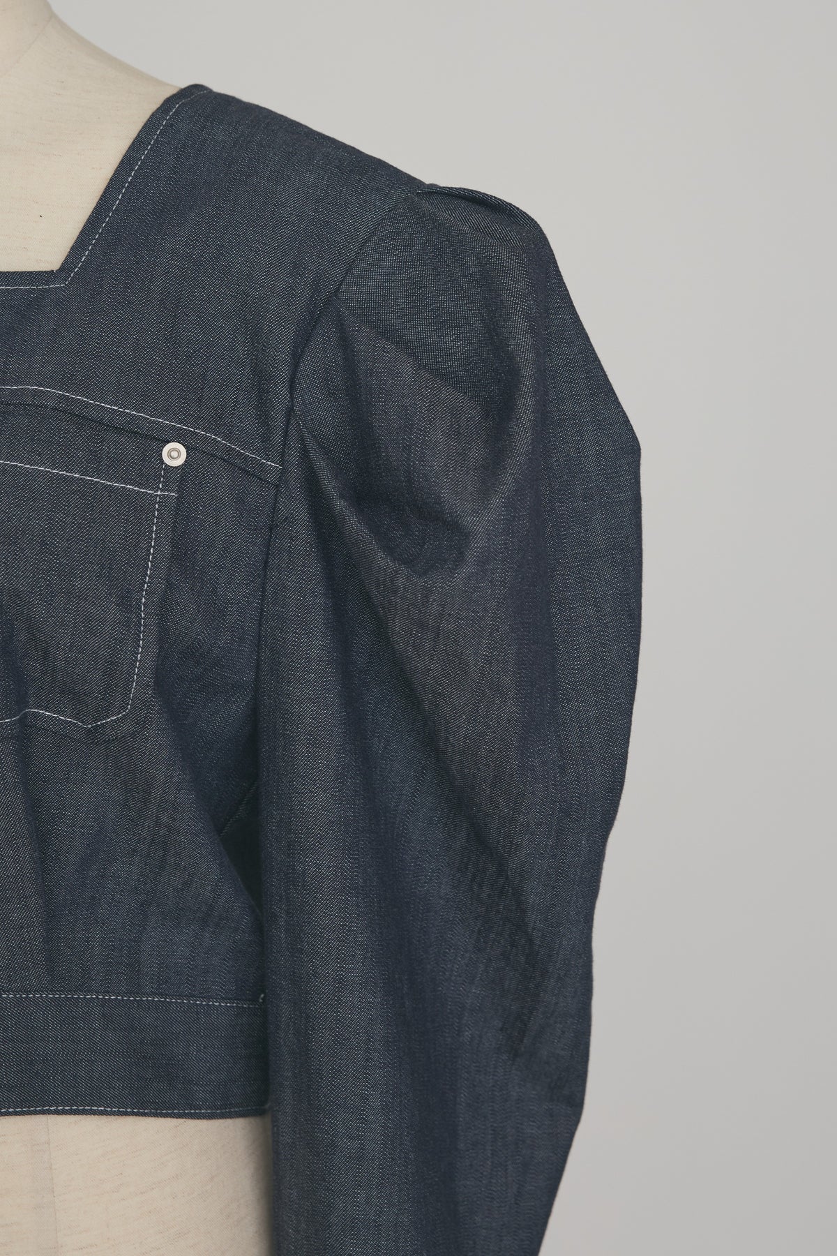 深みのあるインディゴには白ステッチ、クリーンなホワイトには黒ステッチをあしらった、配色デザインが目を惹く短丈ジャケット。 大胆なパフスリーブとすっきりとしたクロップド丈の絶妙なバランスが、自然なスタイルアップを叶えます。 デコルテを綺麗に見せるスクエアネックと存在感のあるダブルポケットが、クラシカルで洗練された大人の雰囲気を演出。 ハイウエストのワイドパンツやスカートと合わせるだけで、メリハリのある旬なスタイリングが完成する便利な一枚です。