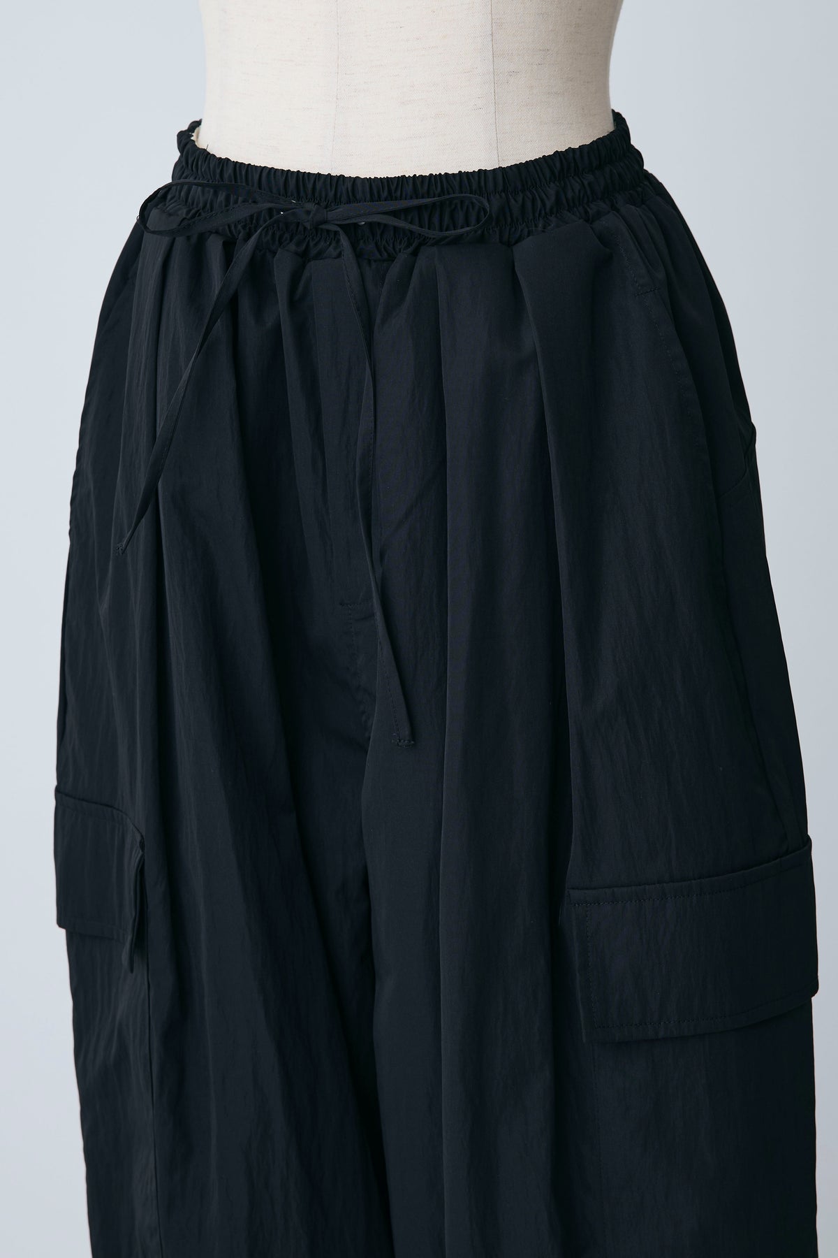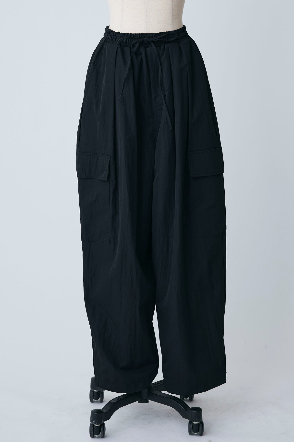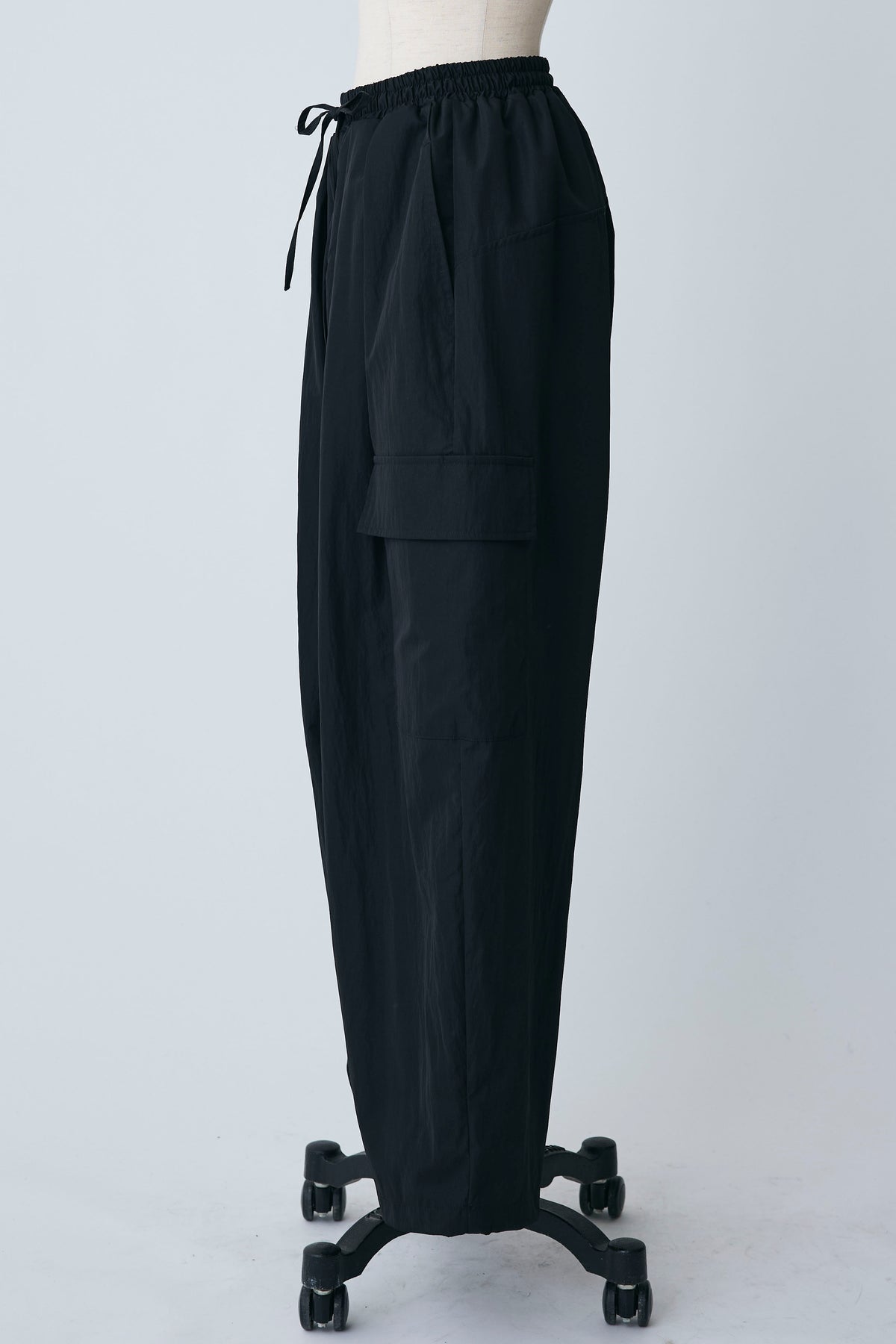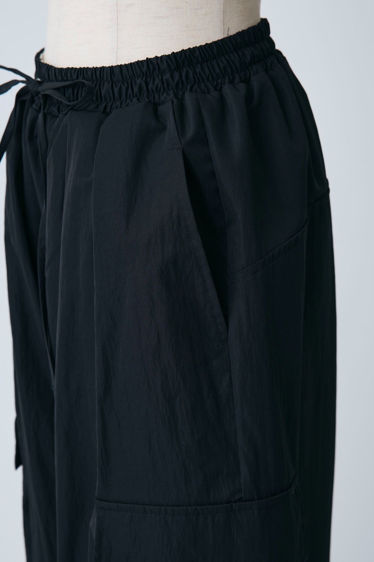 急な雨にも安心な撥水加工生地を使用し、両サイドの大きめなポケットがアクセントになったリラクシーなパンツ。 裾のドローストリングをきゅっと絞ってジョガーパンツ風にしたり、緩めてワイドシルエットにしたりと2通りの着こなしを楽しめます。 ゆったりとしたフォルムが脚のラインをすっぽりと覆い、ウエストのゴム仕様と相まってストレスフリーな穿き心地を叶えます。 カジュアルなTシャツはもちろん、フェミニンなブラウスなどを合わせたミックススタイルにもすんなりと馴染む優秀な一着です。