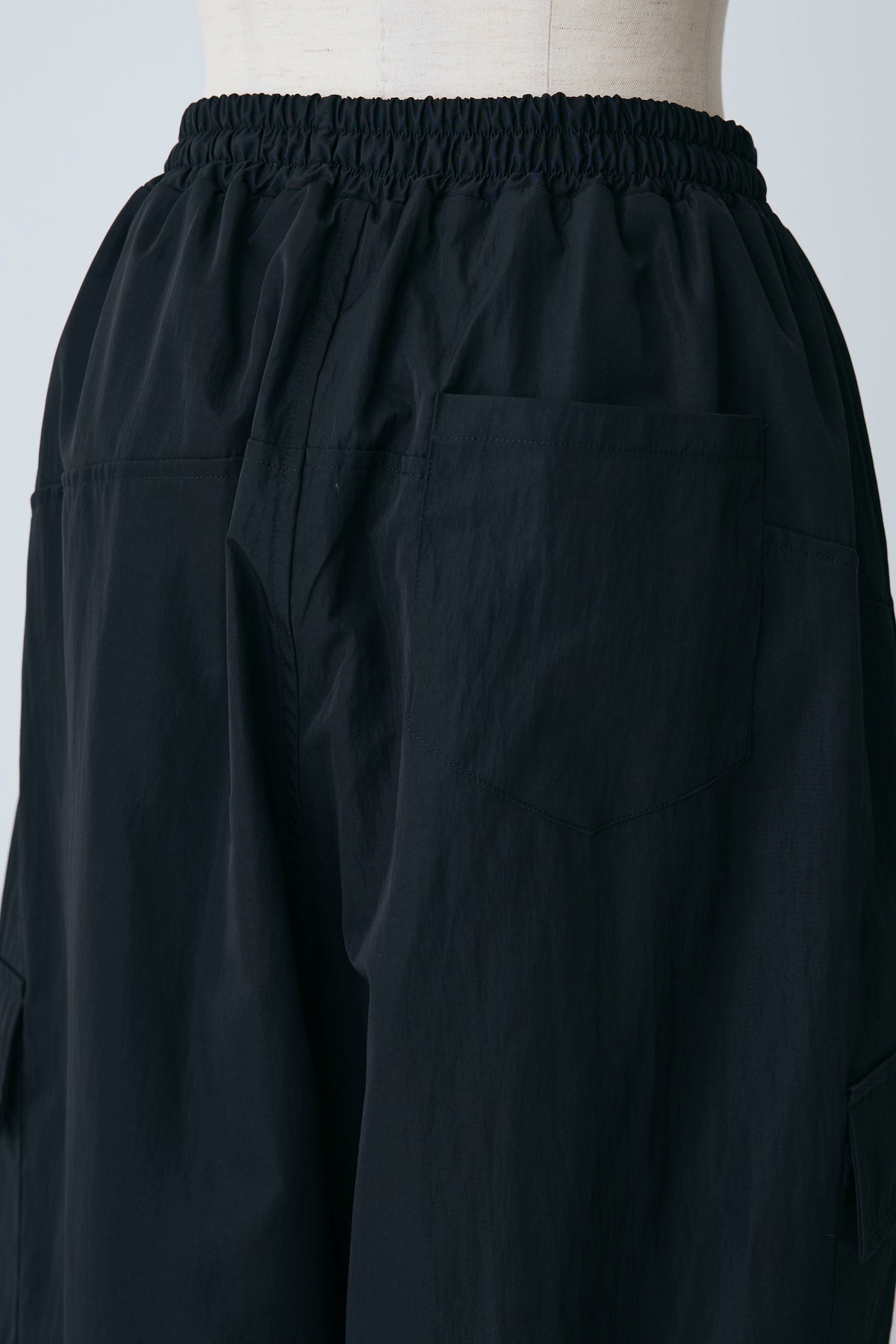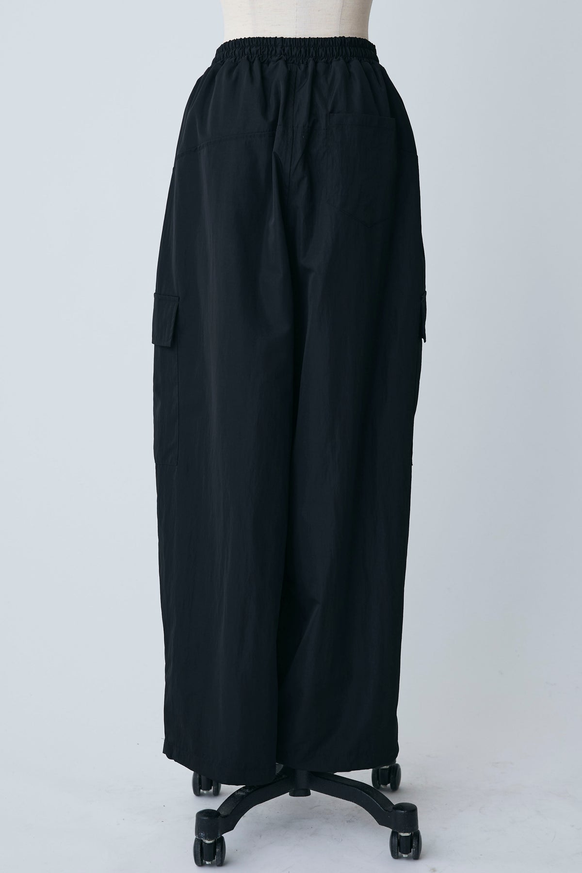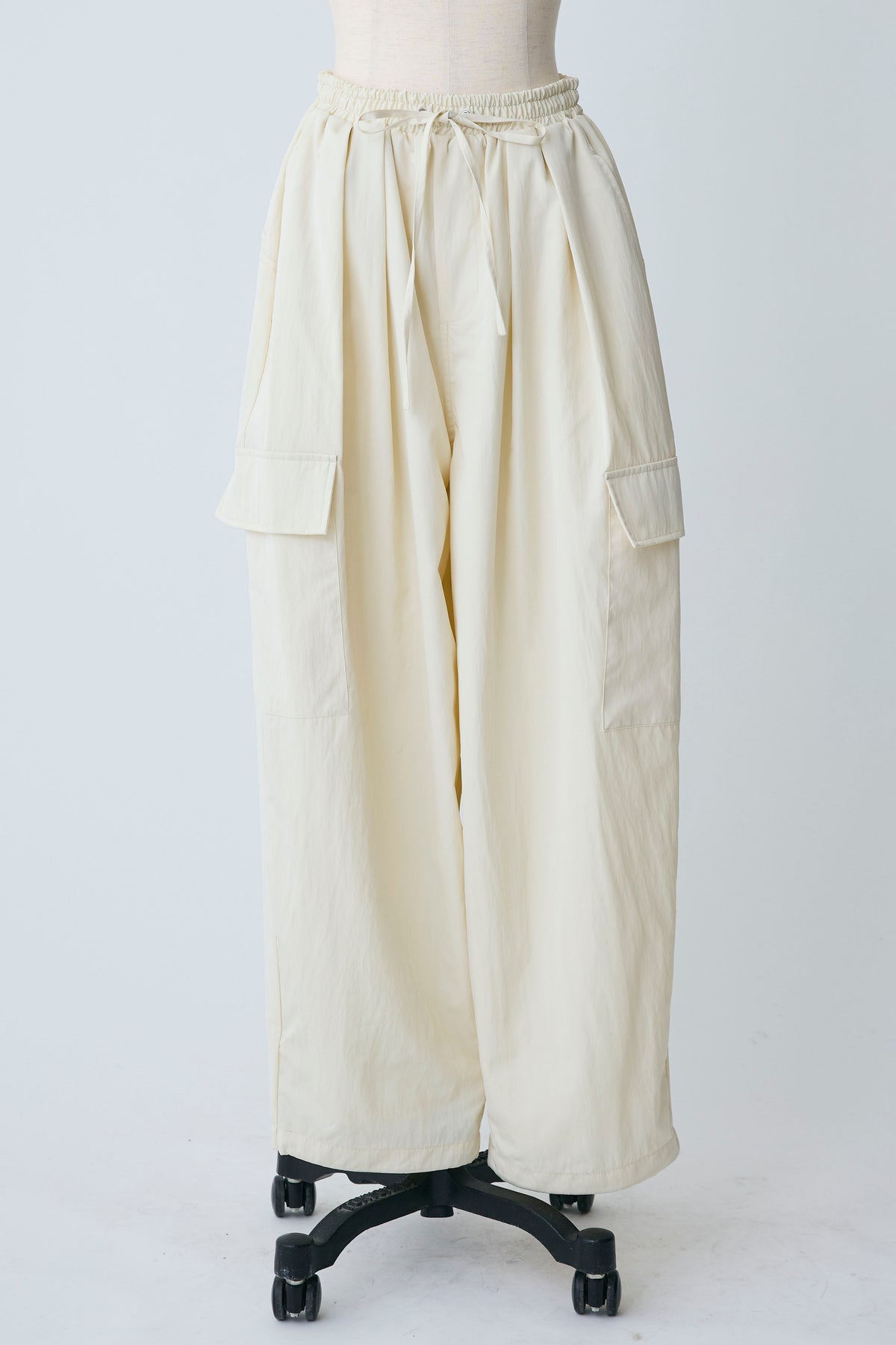 急な雨にも安心な撥水加工生地を使用し、両サイドの大きめなポケットがアクセントになったリラクシーなパンツ。 裾のドローストリングをきゅっと絞ってジョガーパンツ風にしたり、緩めてワイドシルエットにしたりと2通りの着こなしを楽しめます。 ゆったりとしたフォルムが脚のラインをすっぽりと覆い、ウエストのゴム仕様と相まってストレスフリーな穿き心地を叶えます。 カジュアルなTシャツはもちろん、フェミニンなブラウスなどを合わせたミックススタイルにもすんなりと馴染む優秀な一着です。