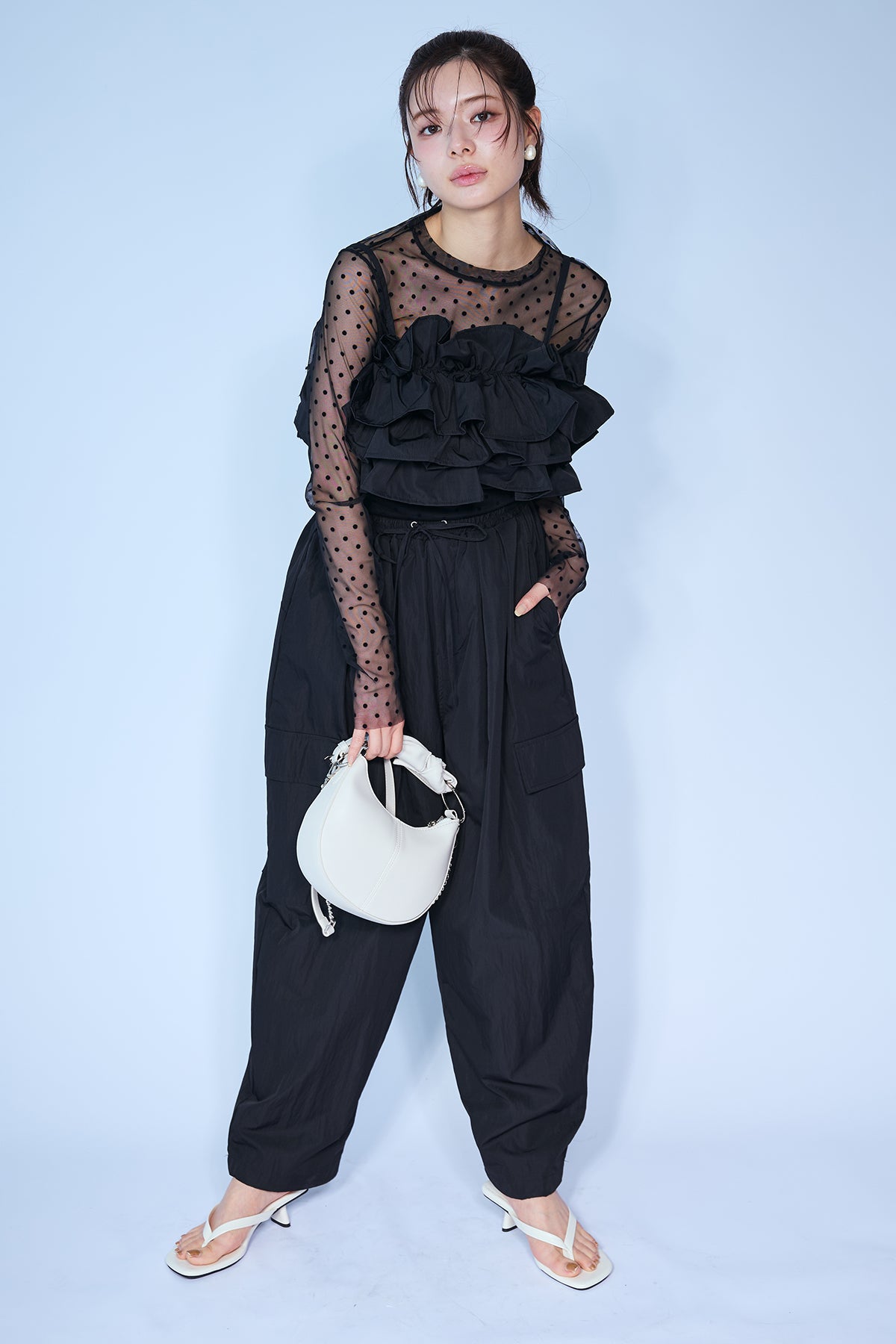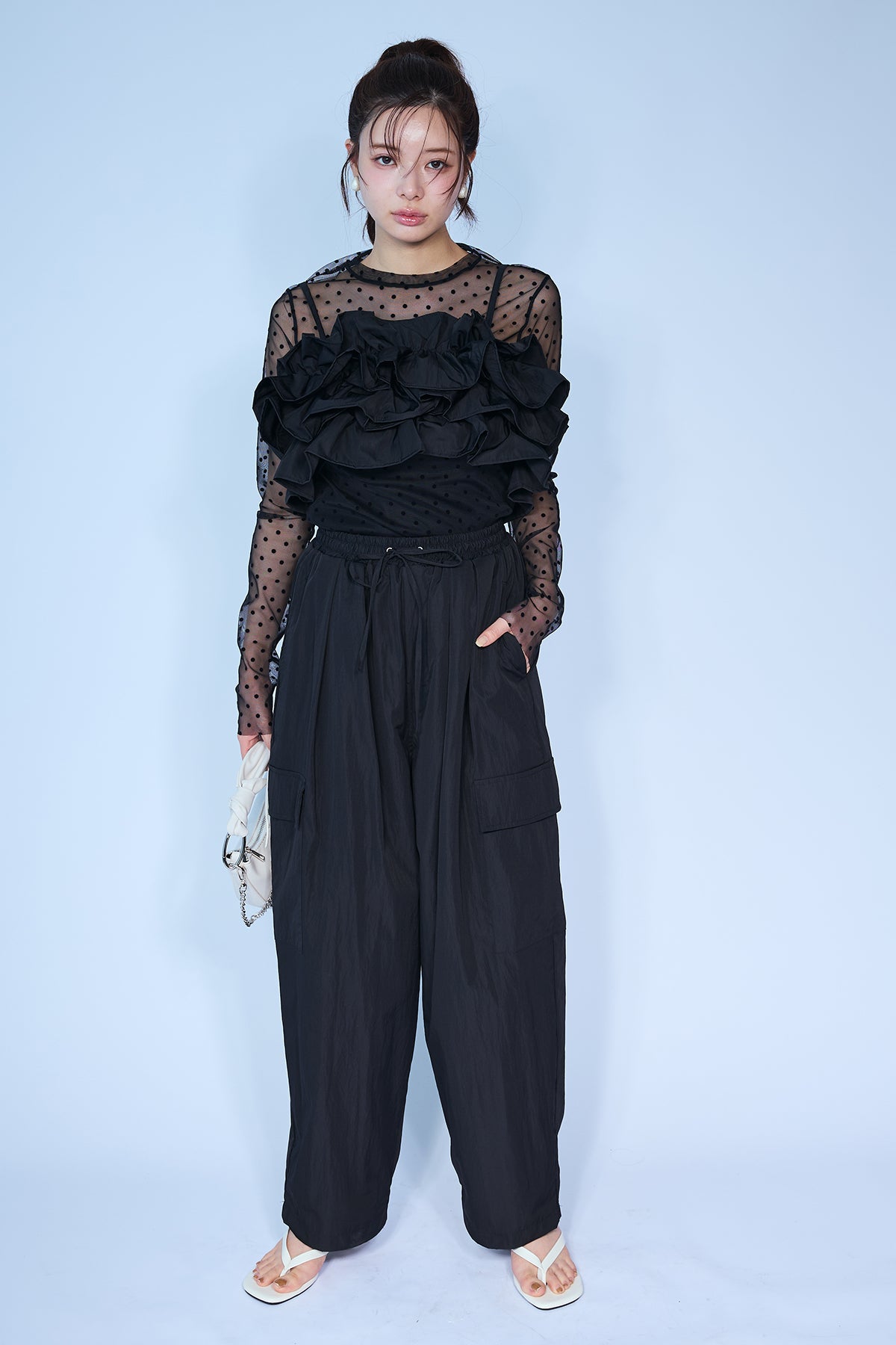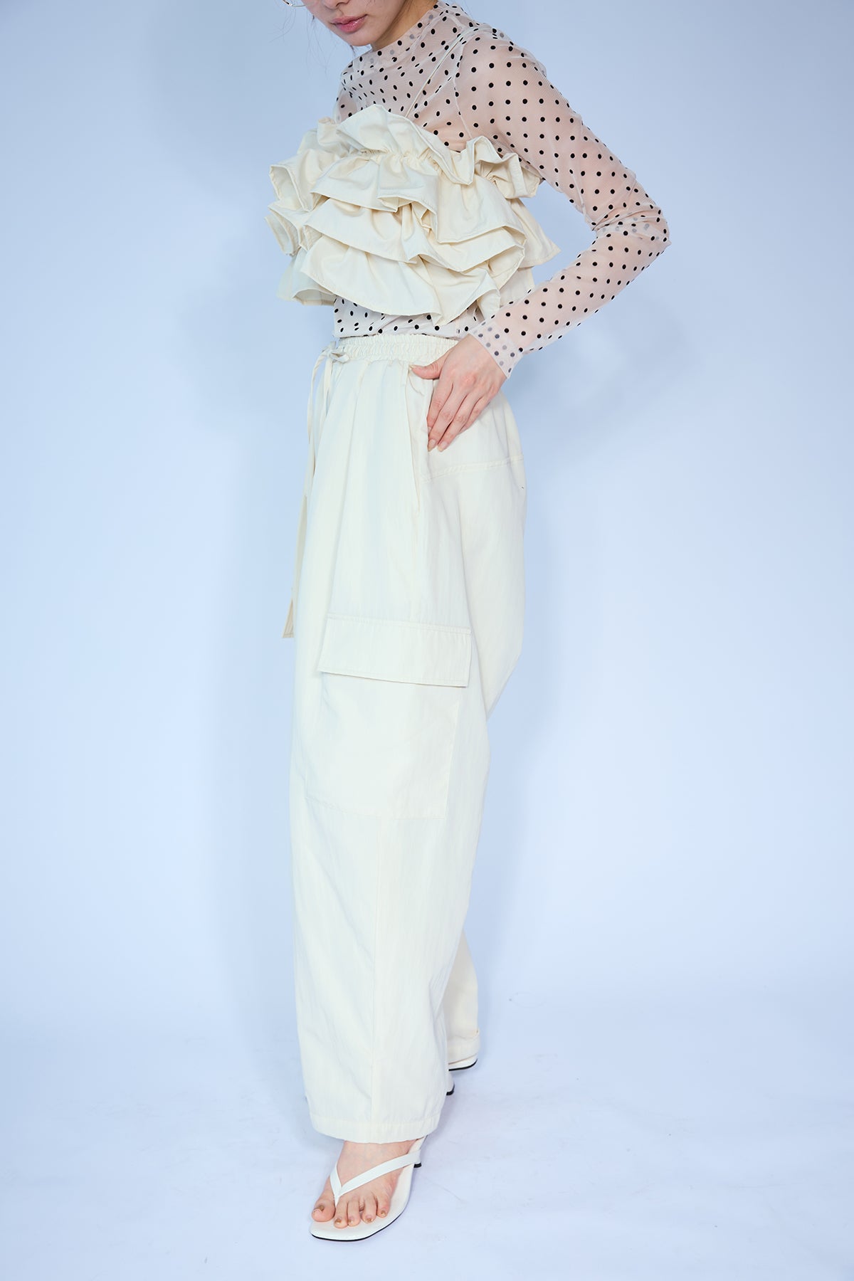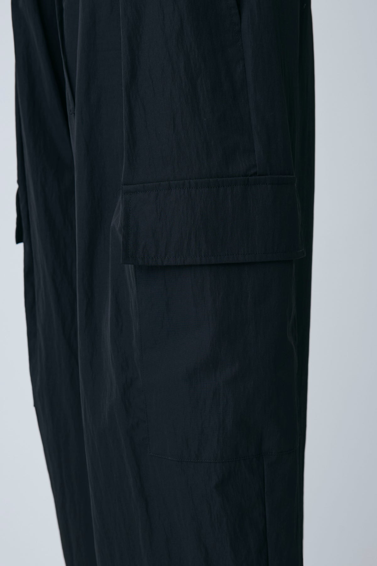 急な雨にも安心な撥水加工生地を使用し、両サイドの大きめなポケットがアクセントになったリラクシーなパンツ。 裾のドローストリングをきゅっと絞ってジョガーパンツ風にしたり、緩めてワイドシルエットにしたりと2通りの着こなしを楽しめます。 ゆったりとしたフォルムが脚のラインをすっぽりと覆い、ウエストのゴム仕様と相まってストレスフリーな穿き心地を叶えます。 カジュアルなTシャツはもちろん、フェミニンなブラウスなどを合わせたミックススタイルにもすんなりと馴染む優秀な一着です。
