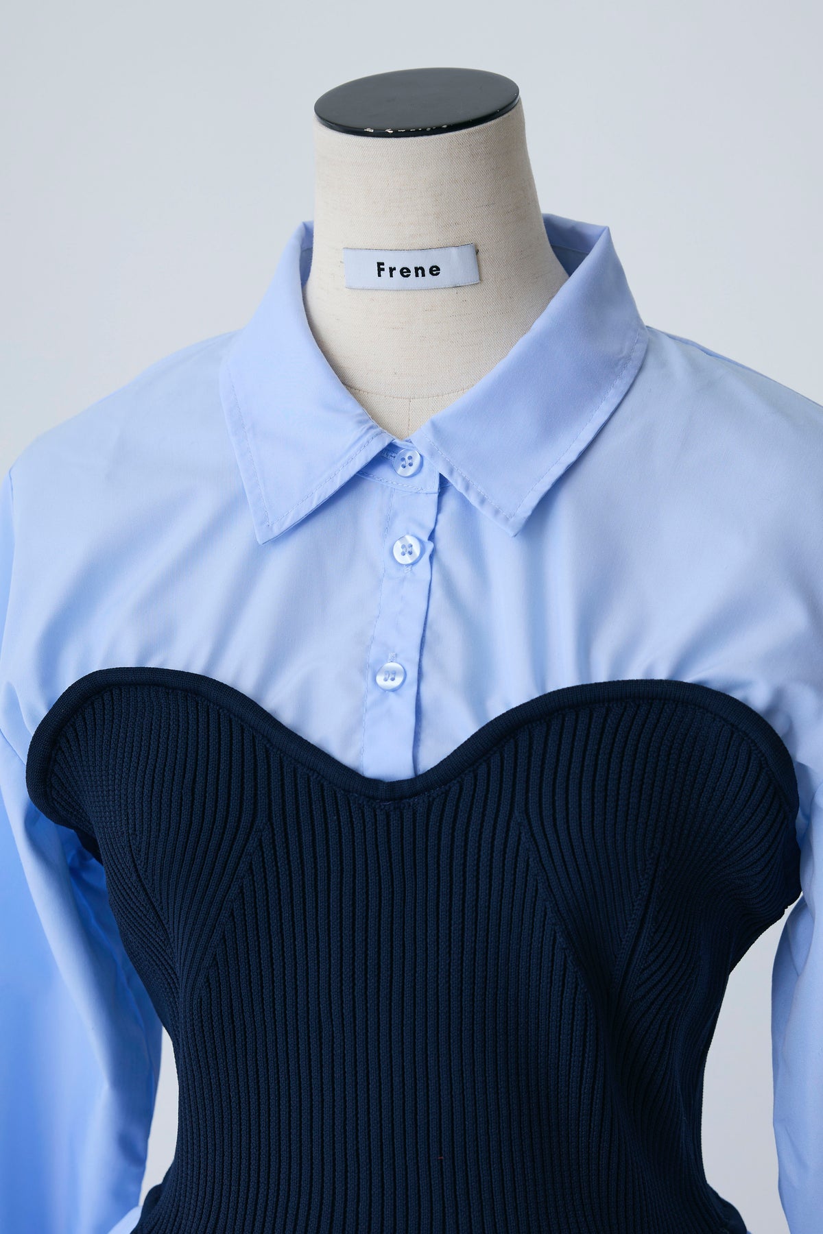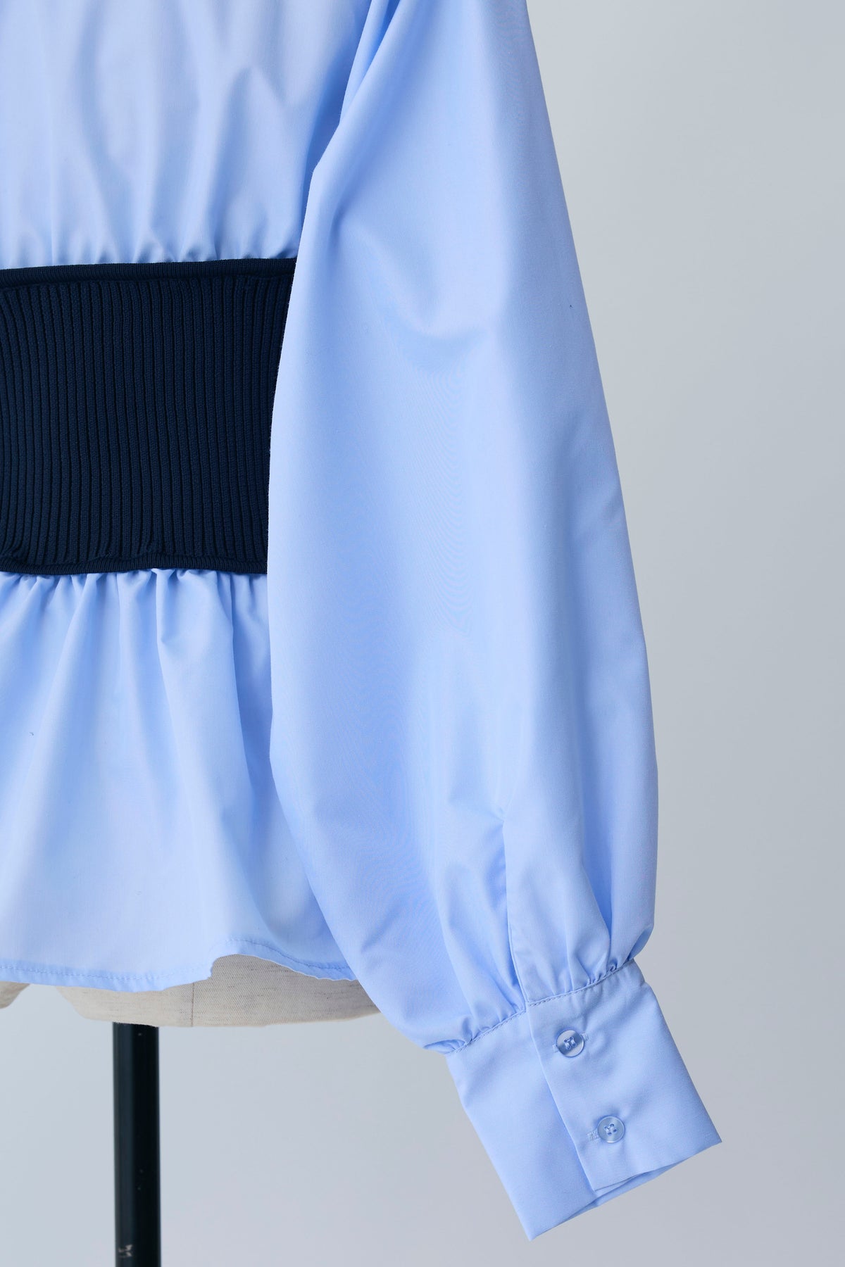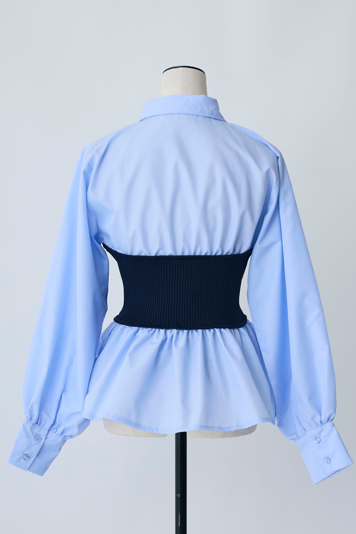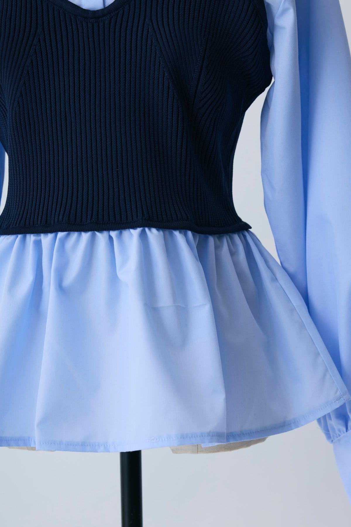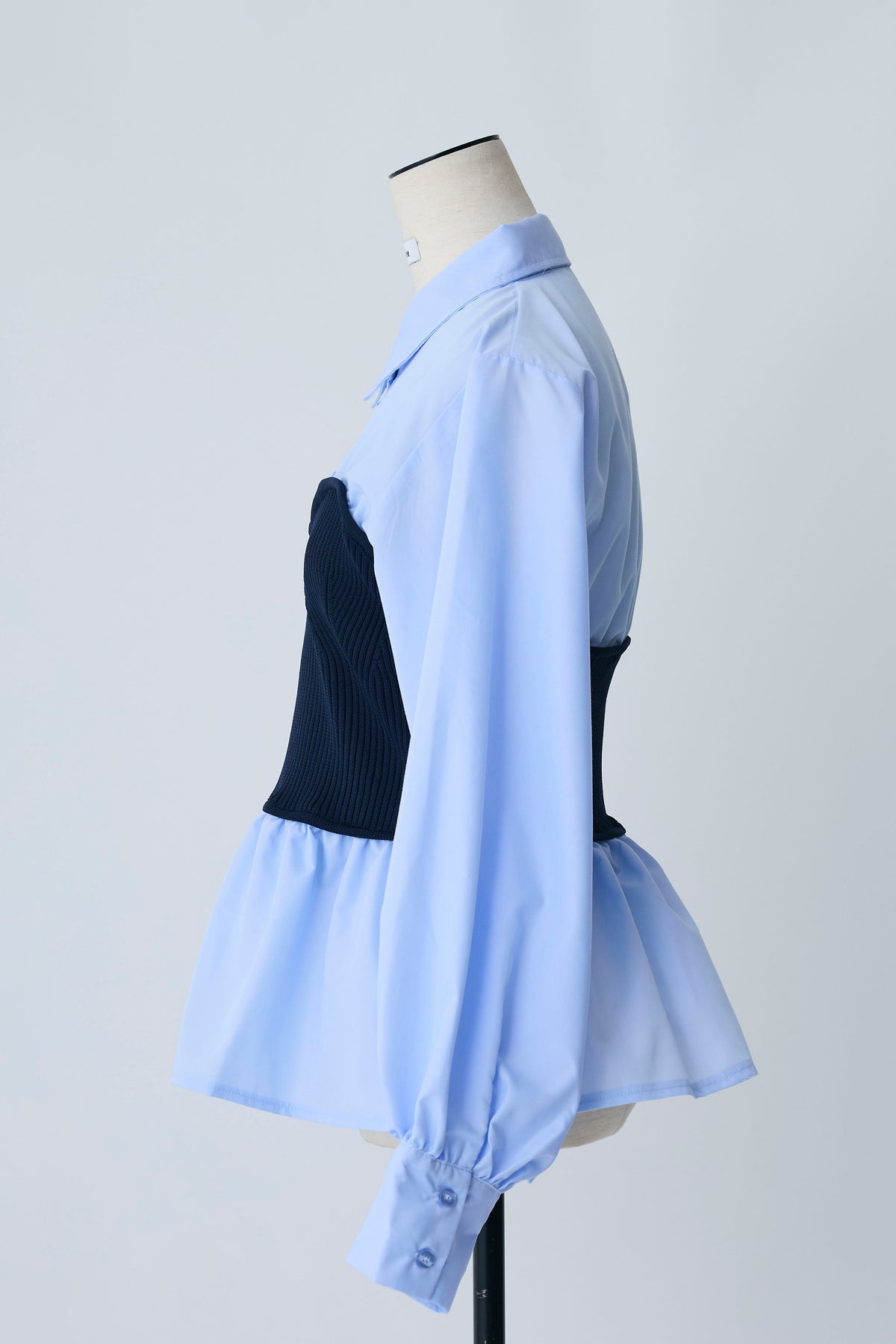 トレンドのニットビスチェをレイヤードしたようなデザインが目を惹く、一枚で主役になるドッキングブラウス。 胸下からふんわりと広がるペプラムシルエットが女性らしさを引き立てつつ、気になる腰周りを自然にカバーします。 きちんと感のあるシャツにボリューム袖とリブニットを組み合わせた異素材使いで、上半身にメリハリのある華やかさをプラス。 すっきりとした細身のパンツからリラクシーなワイドボトムまで、合わせるアイテムを選ばず幅広いスタイリングを楽しめる一着です。