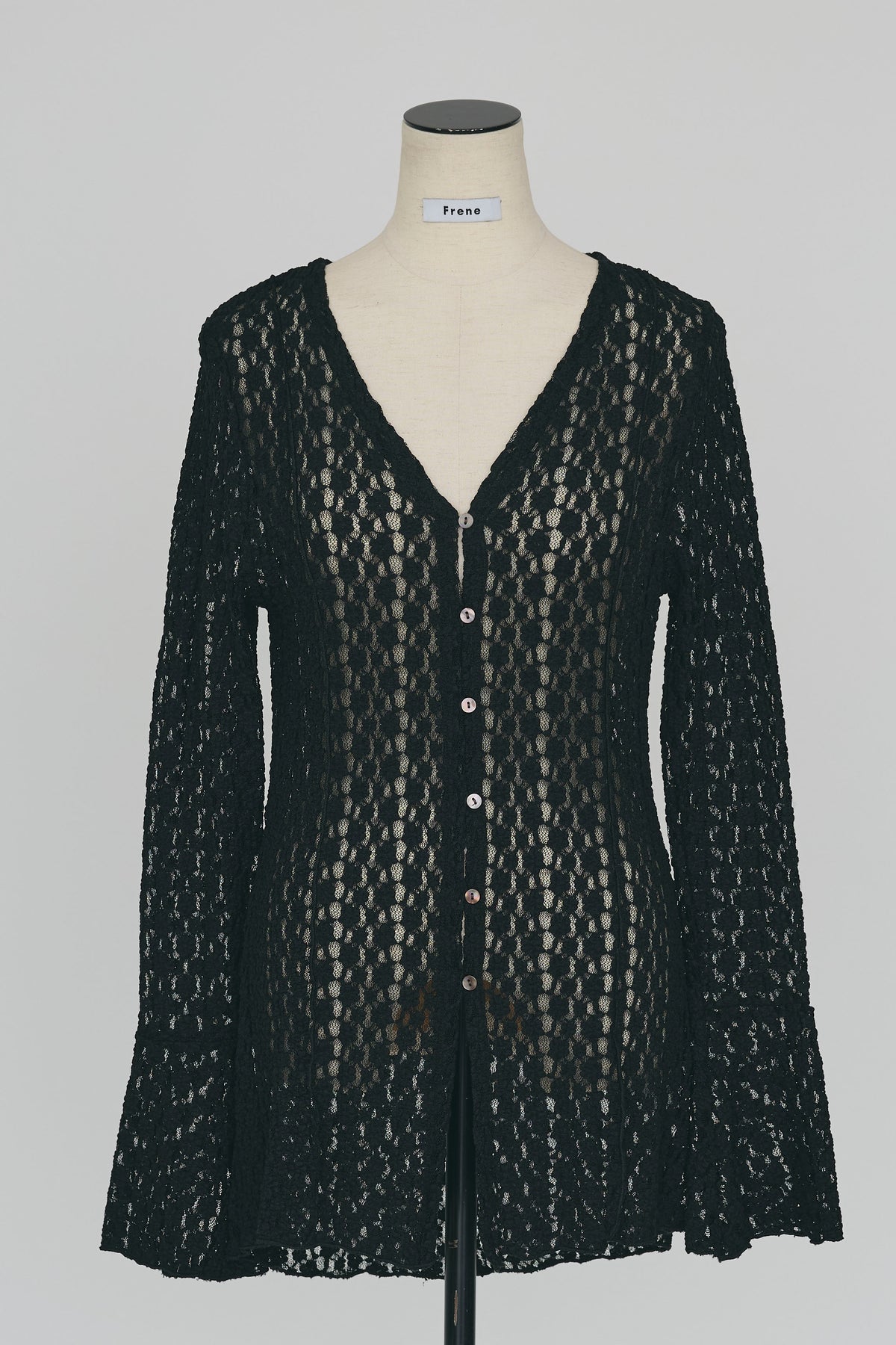 素肌がほんのりと透ける繊細なフラワー柄のカットレース生地を使用したフェミニンな一枚。 デコルテを美しく見せる深めのVネックと手元に向かって広がるフレア袖が女性らしい抜け感を演出します。 フロントに並んだ華奢なボタンがさりげないアクセントとなり縦のラインをすっきりと見せてくれるデザイン。 キャミソールなどのインナーに重ねてきれいめなスラックスや定番のデニムを合わせるだけで洗練されたスタイルが完成します。