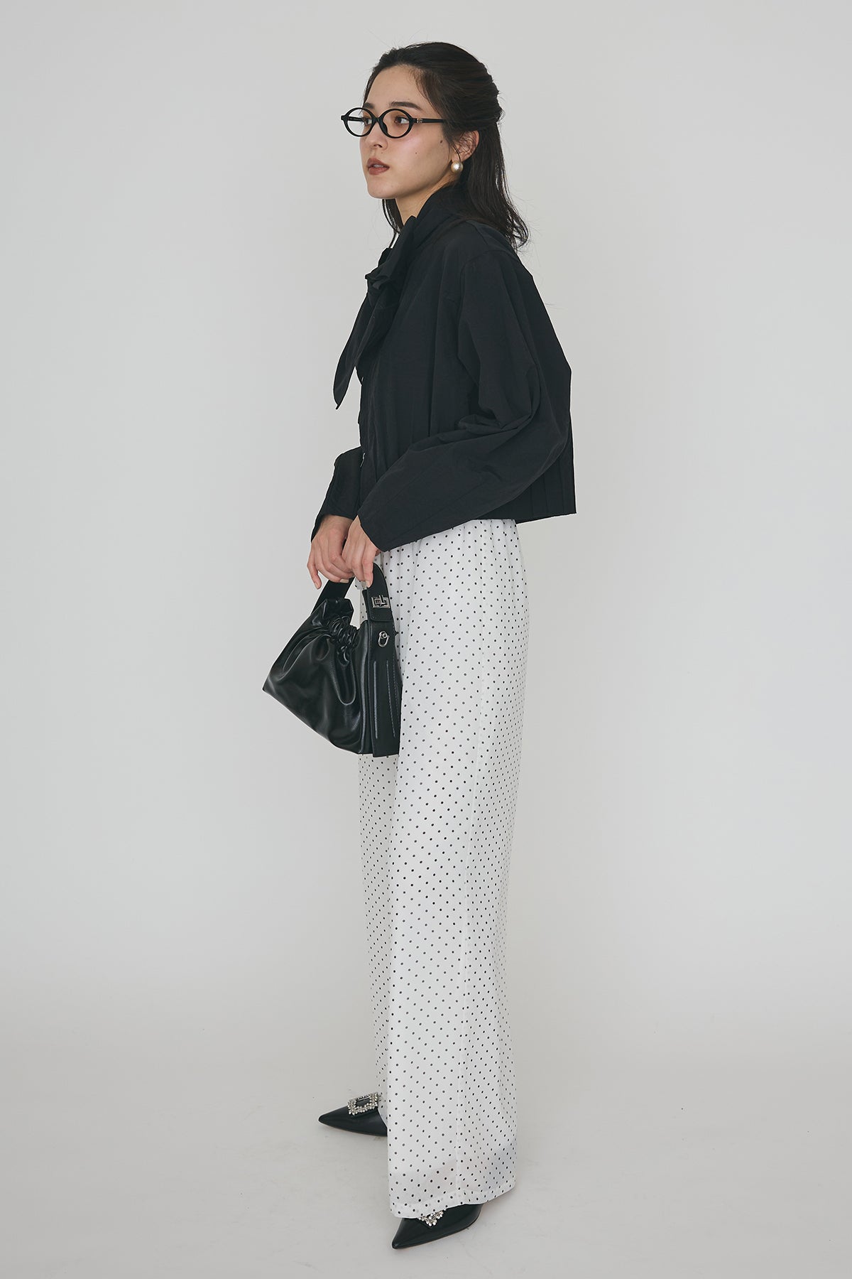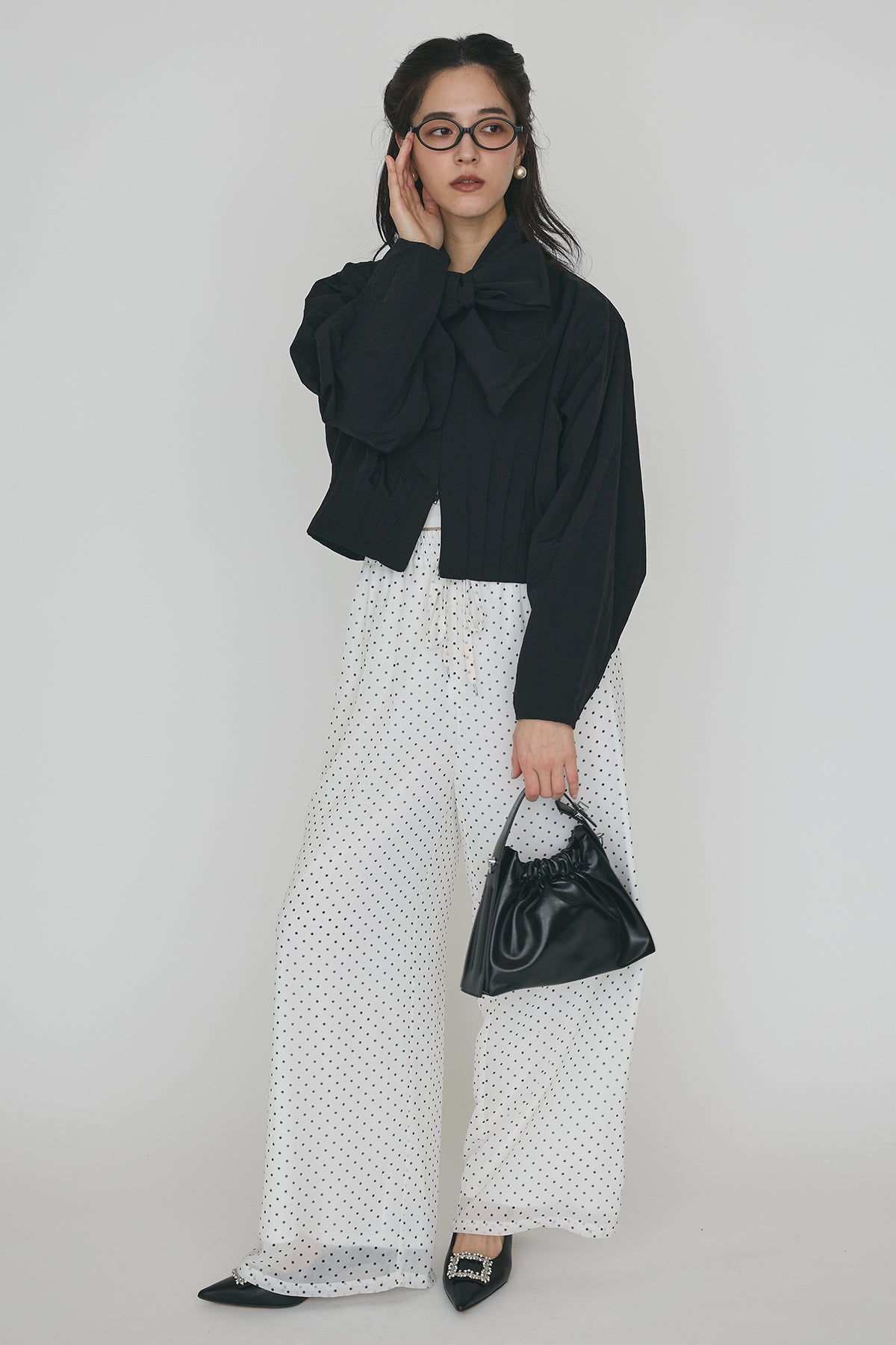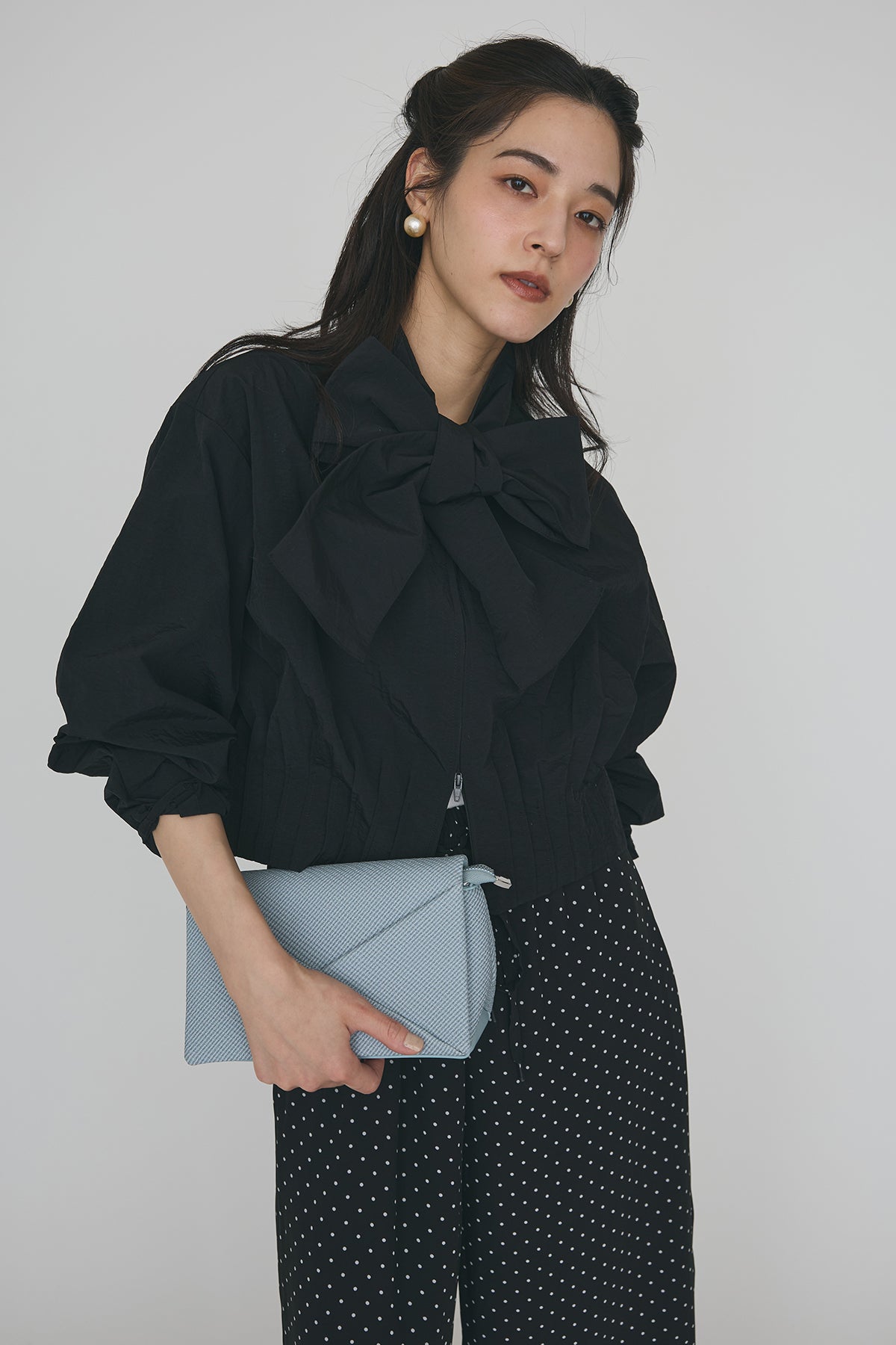 [予約]フロントファスナーヘムタックボウタイブラウスを含んだコーデセット商品を探す↓