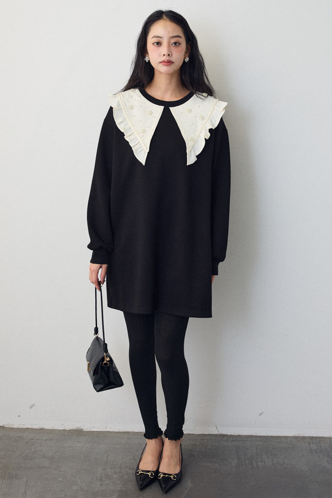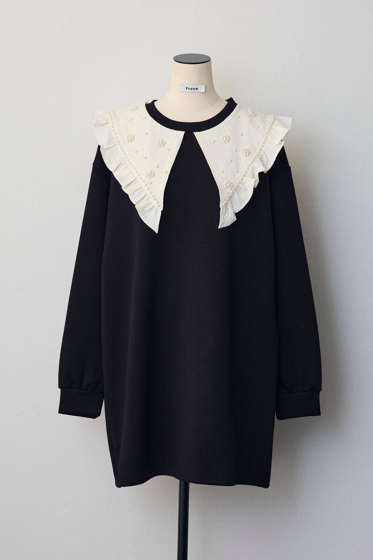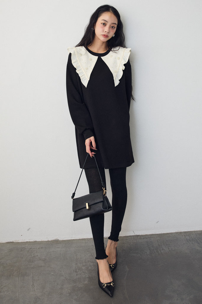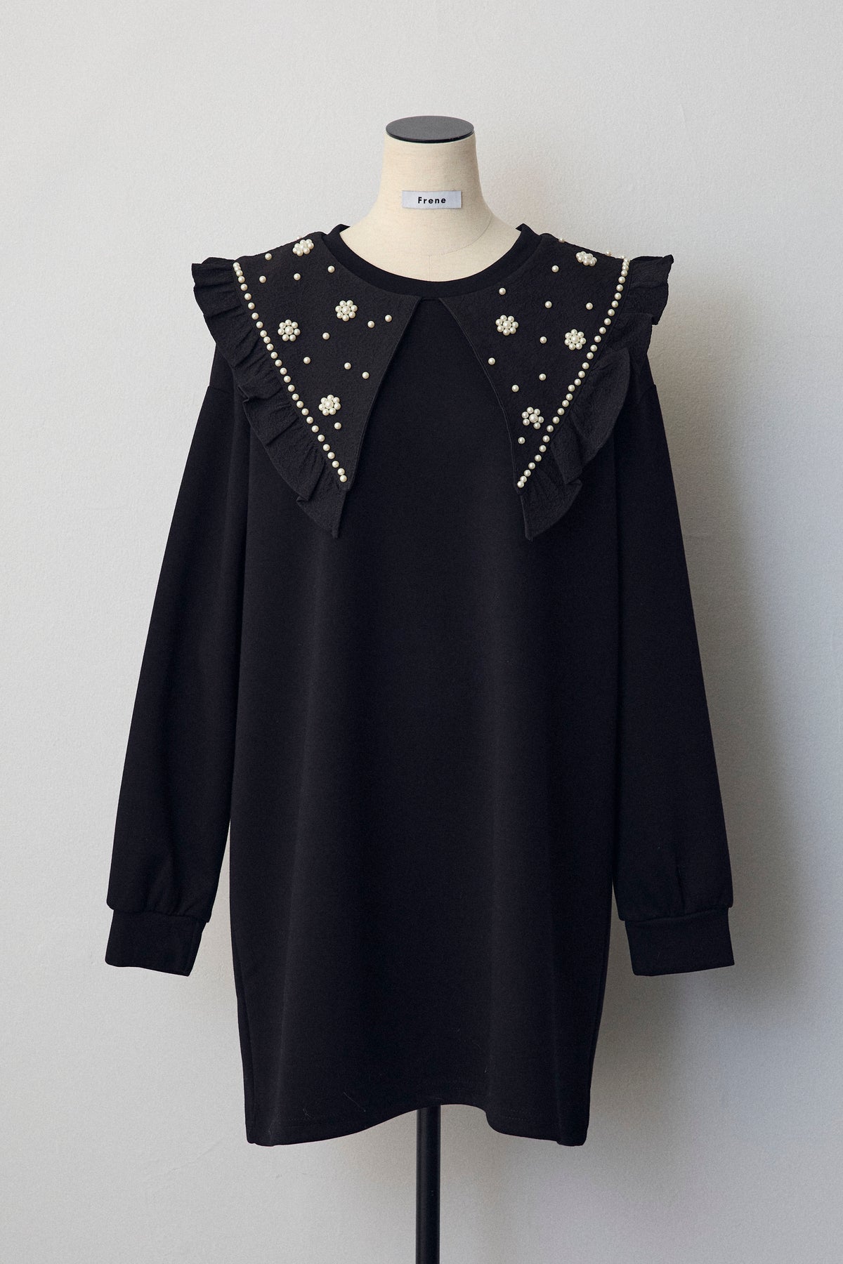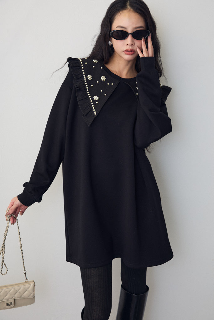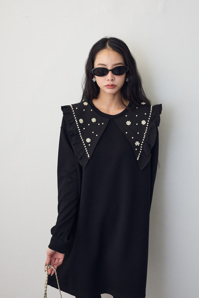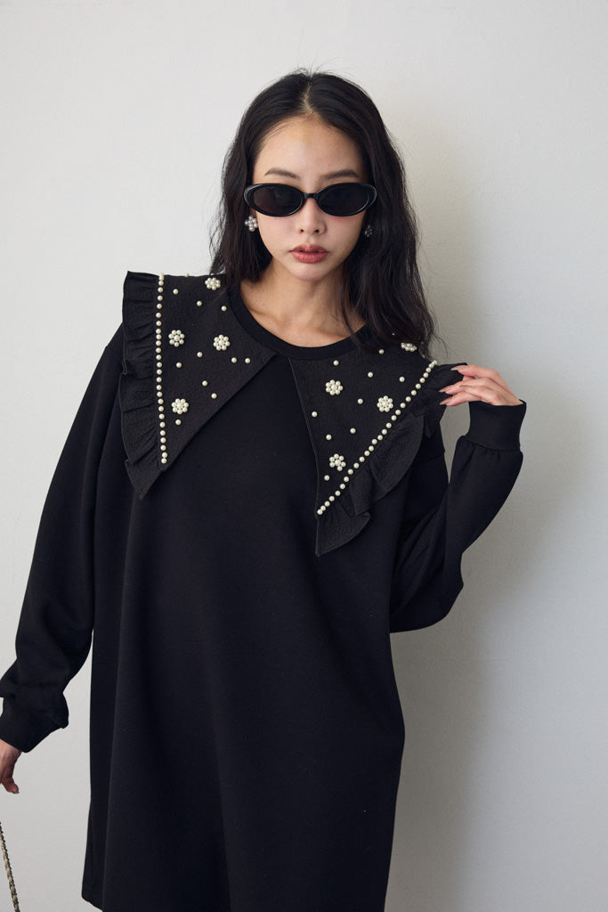 立体的なパール刺繍が施された大きめの襟が目を惹くスウェットワンピース。 フリルをあしらったBIGカラーが顔まわりを華やかに引き立て、シンプルなシルエットにフェミニンな印象をプラスします。 柔らかなスウェット素材で着心地も良く、デイリーからお出かけまで幅広く活躍する一枚です。