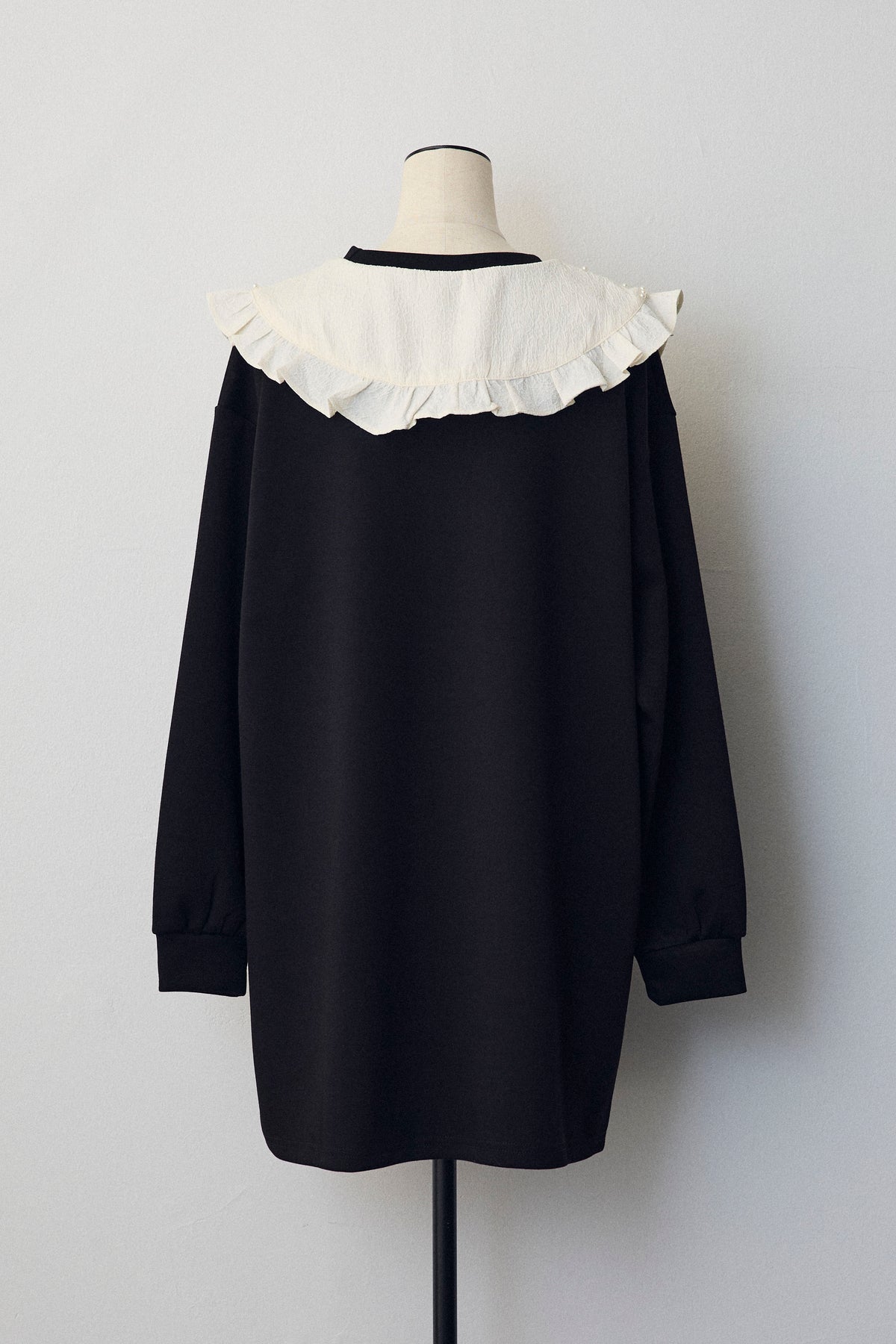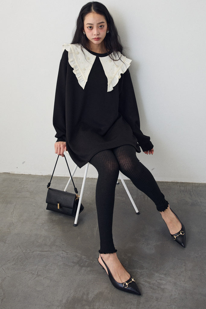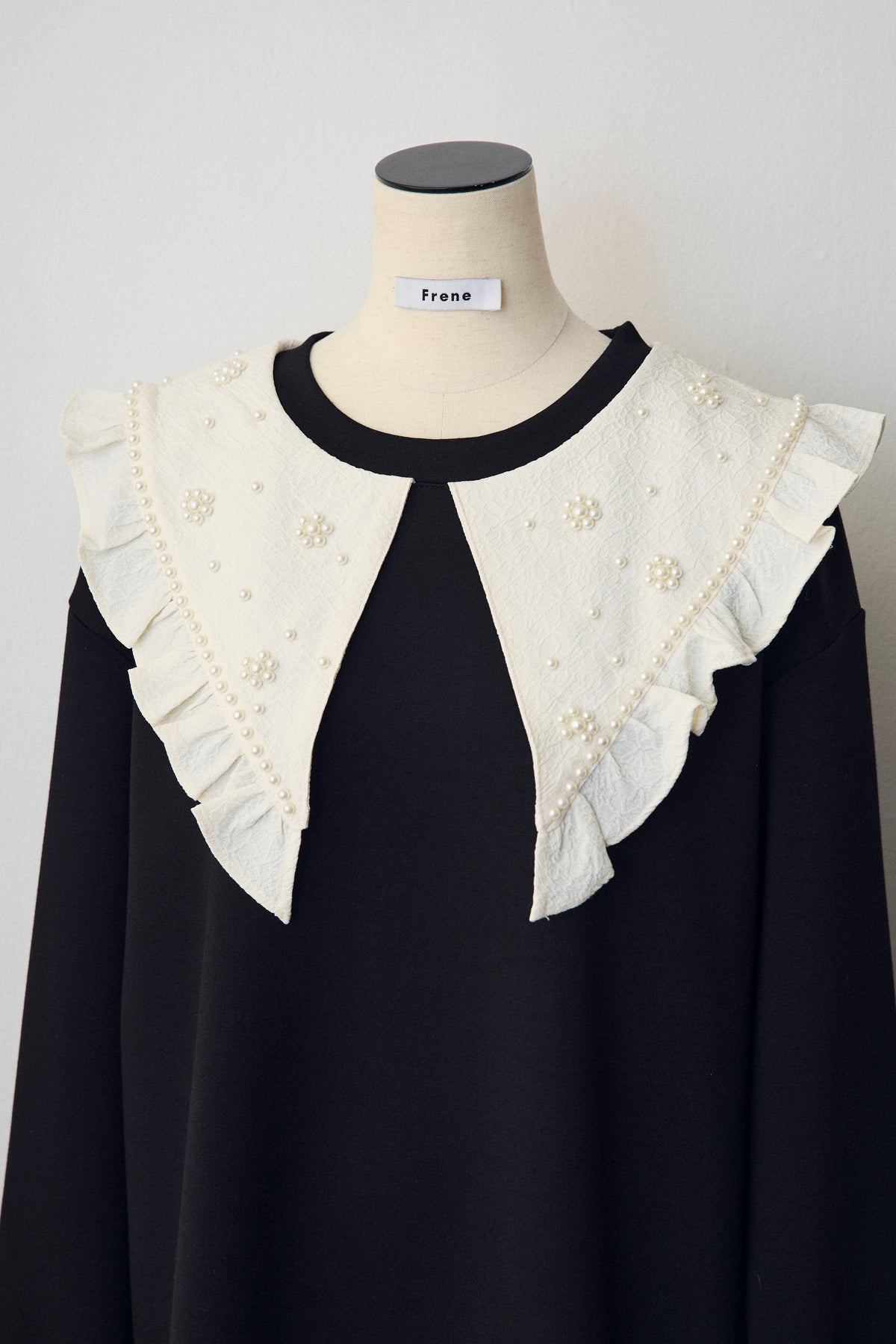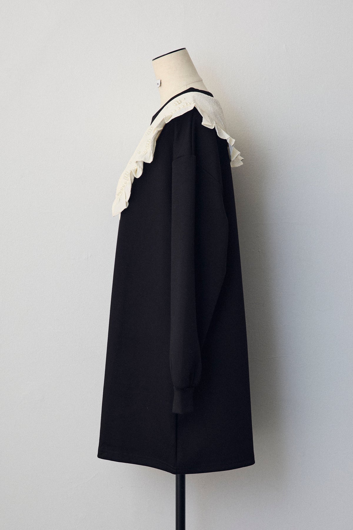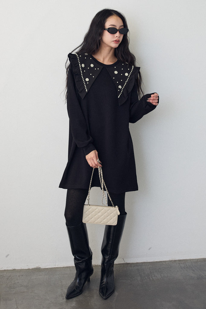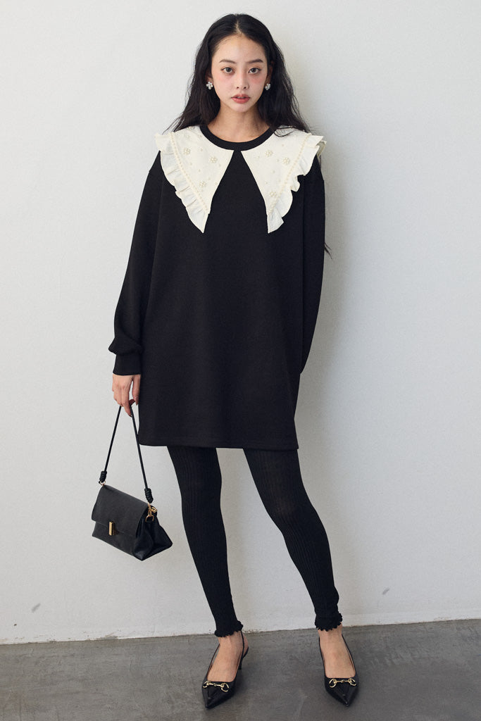 立体的なパール刺繍が施された大きめの襟が目を惹くスウェットワンピース。 フリルをあしらったBIGカラーが顔まわりを華やかに引き立て、シンプルなシルエットにフェミニンな印象をプラスします。 柔らかなスウェット素材で着心地も良く、デイリーからお出かけまで幅広く活躍する一枚です。