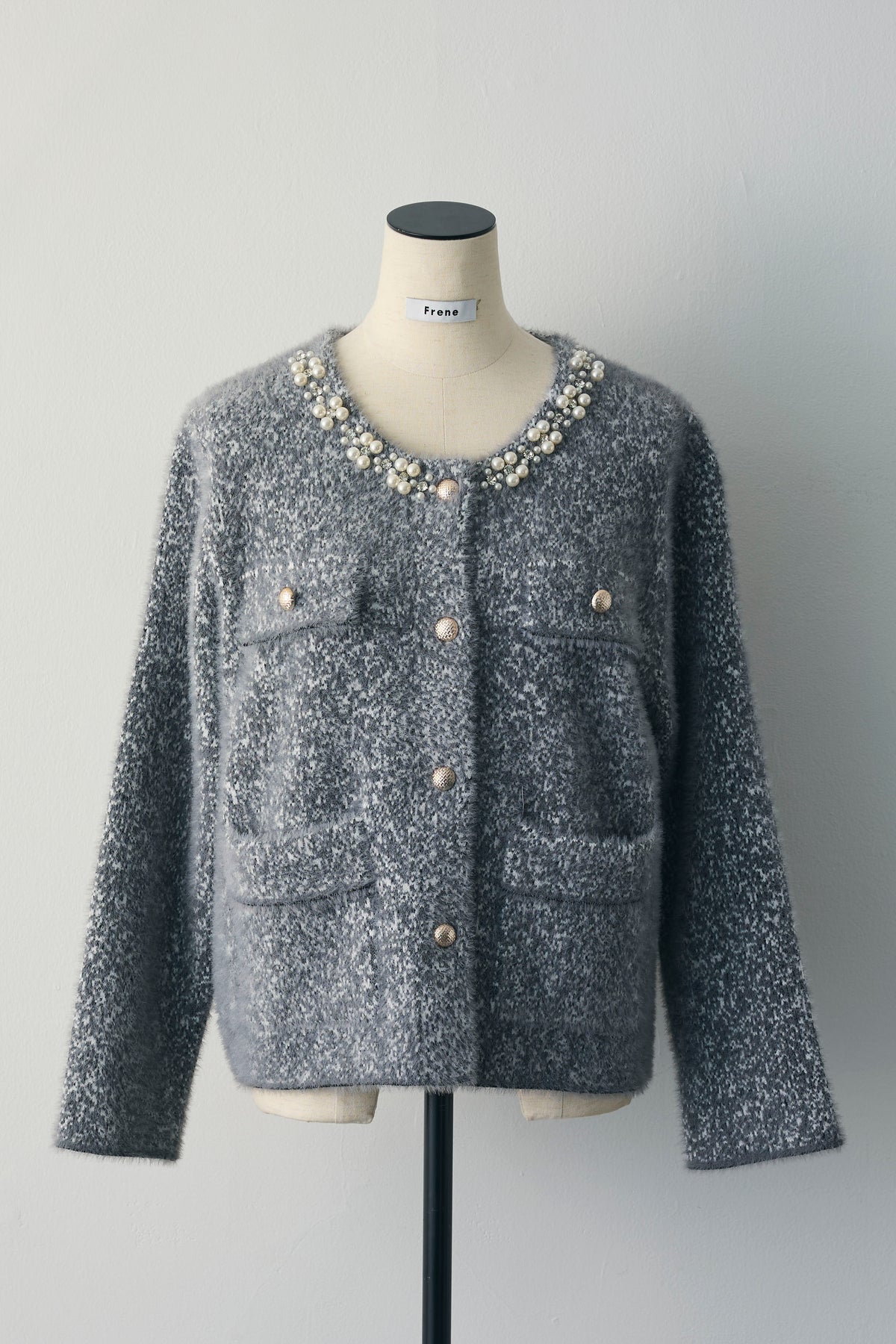 襟ぐりに大小のパールとビジューを贅沢にあしらった、主役級のニットジャケット。ふわっと起毛した表面感で季節感たっぷり。フロントとポケットのメタル調ボタンが、きちんと感を添えます。 やや短め丈×ボックス寄りシルエットで、ワイドパンツやボリュームスカートとも好バランス。Tシャツに羽織ってデイリーに、ワンピースに重ねてオケージョン寄りにも。1枚でコーデが決まる存在感あるアイテムです。