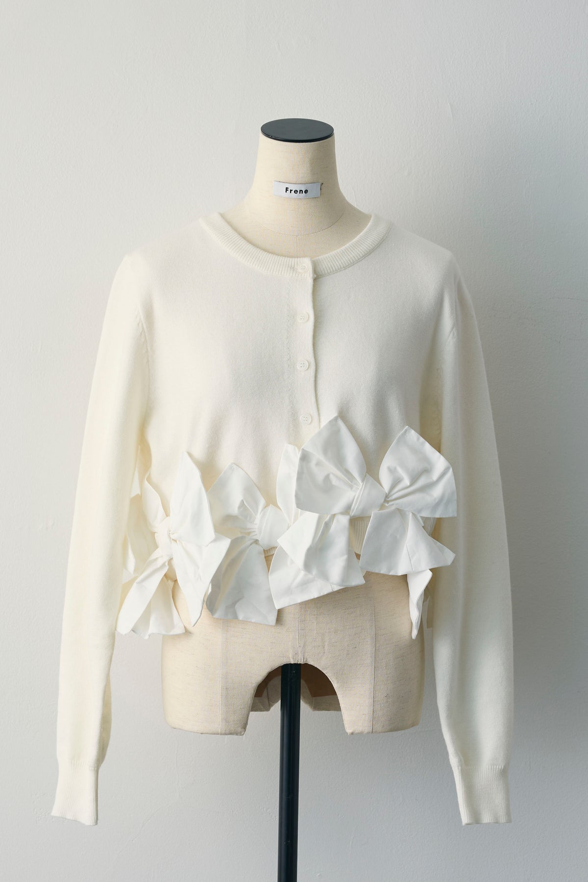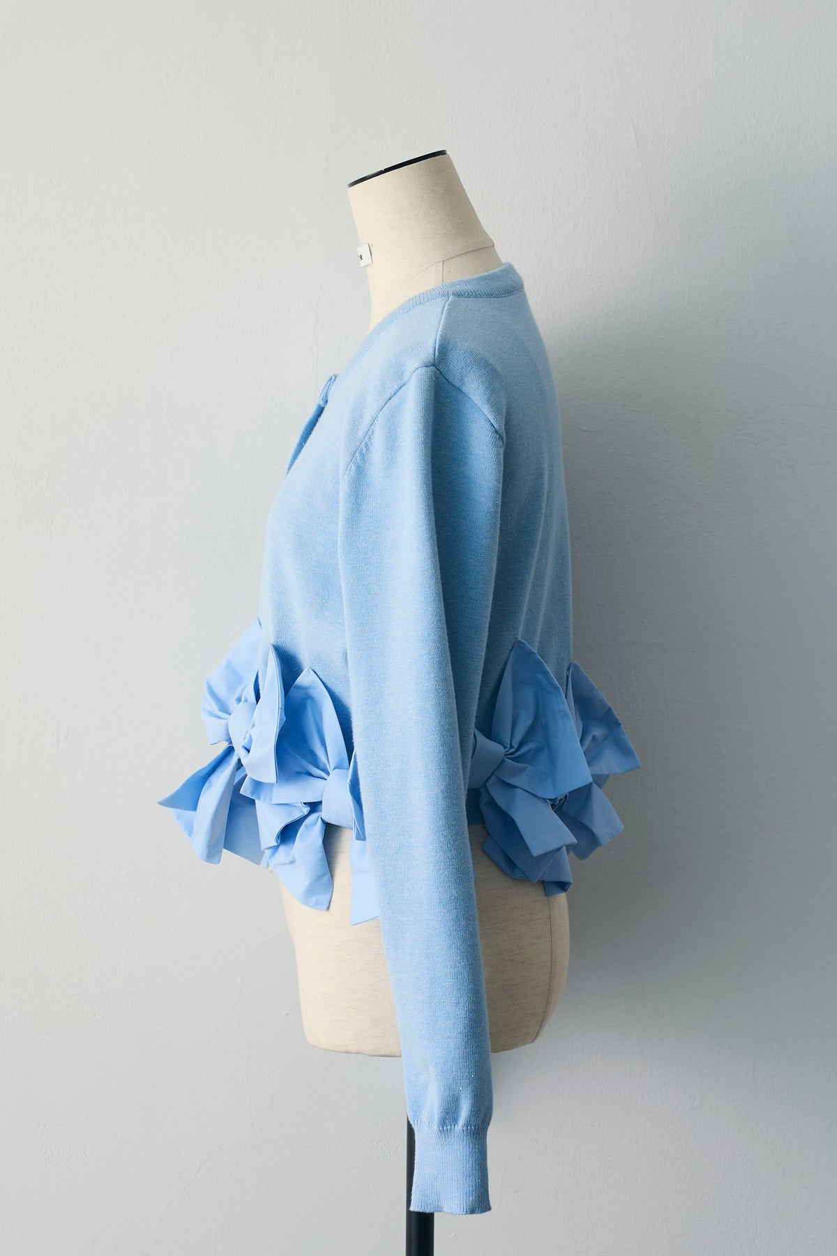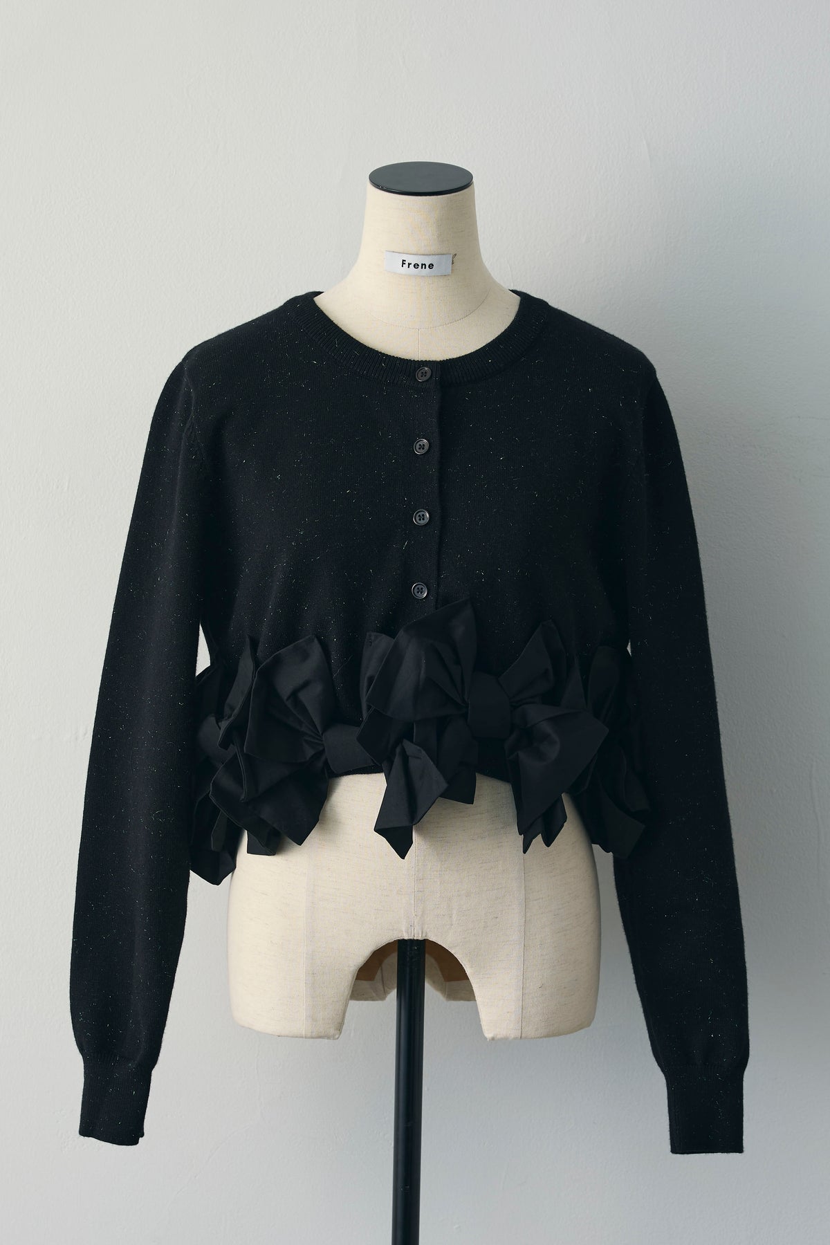 裾まわりに立体リボンをぐるりと配した、着映え主役のショートカーデ。ほどよい厚みのニットにハリのある布リボンをミックスし、甘さはありながらも大人に着られるコントラストに仕上げました。前立ては同色ボタンのすっきり仕様。ウエスト丈のコンパクトバランスで、脚長効果も狙えます。