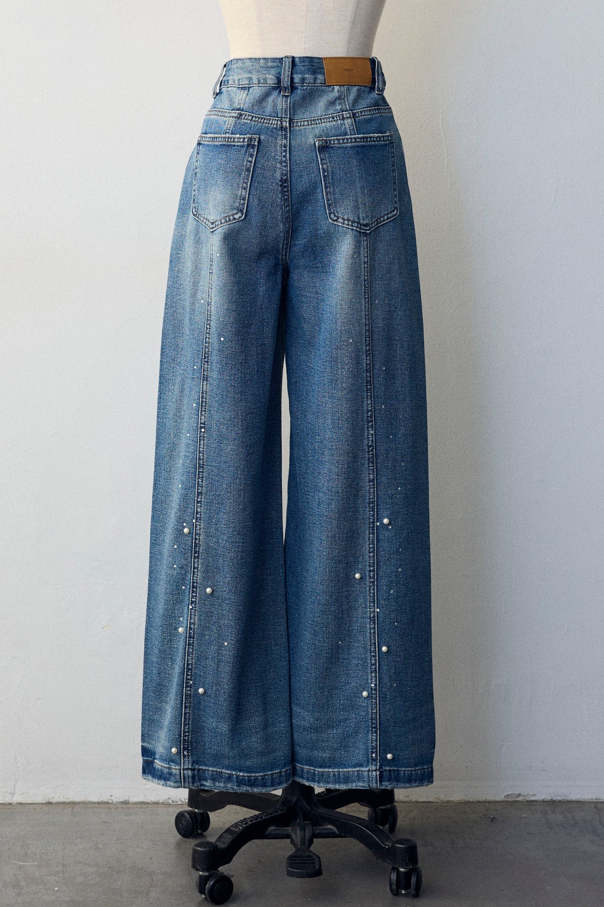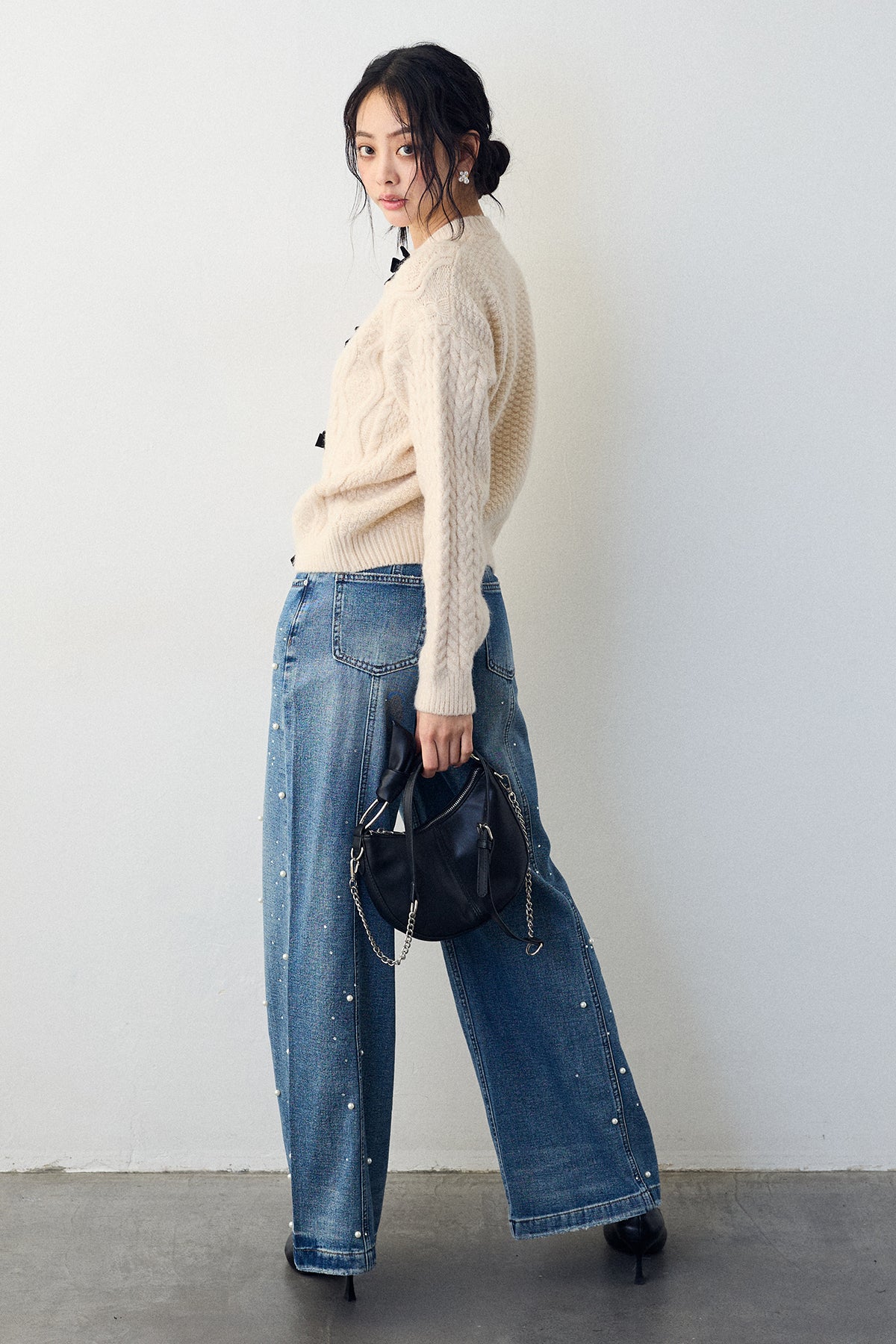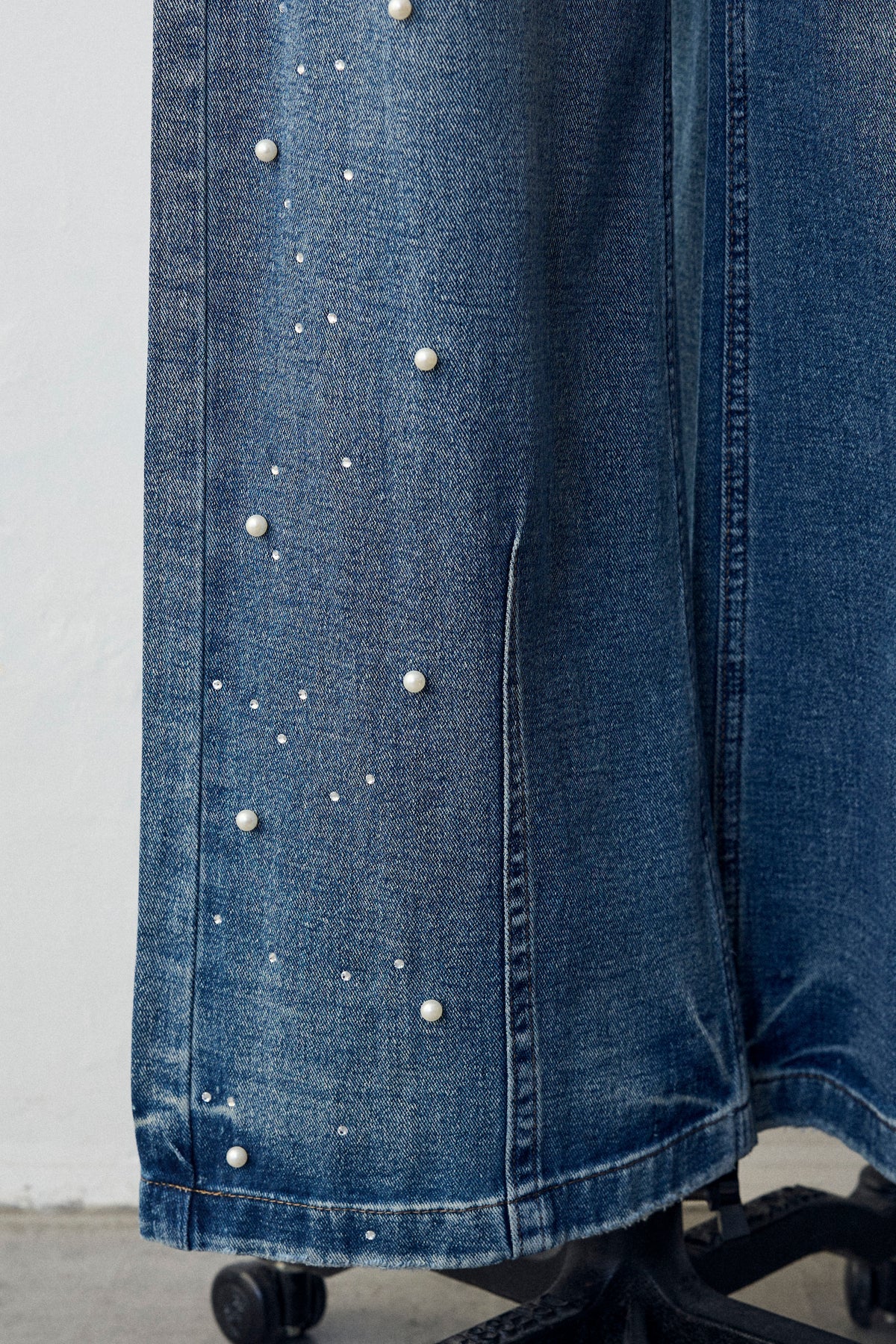 カジュアルなデニムに、パールとラインストーンを贅沢に散りばめた主役級のハイウエストパンツ。 歩くたびにきらめく装飾がジュエリーのようなアクセントになり、いつものデニムスタイルを華やかにクラスアップさせます。 腰位置を高く見せるハイウエストと、脚のラインを拾わない絶妙なワイドシルエットで、履くだけでスタイルアップ効果は抜群。 シンプルなトップスと合わせるだけで様になり、甘めのブラウスやニットと合わせれば、大人ならではのフェミニンカジュアルが完成します。