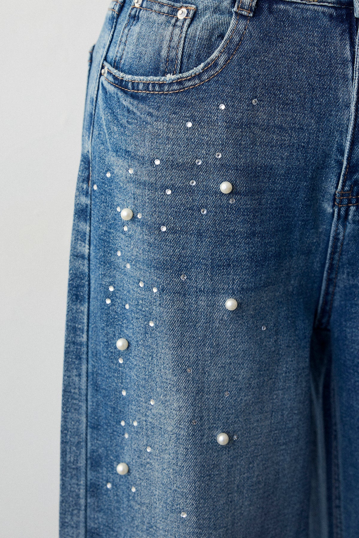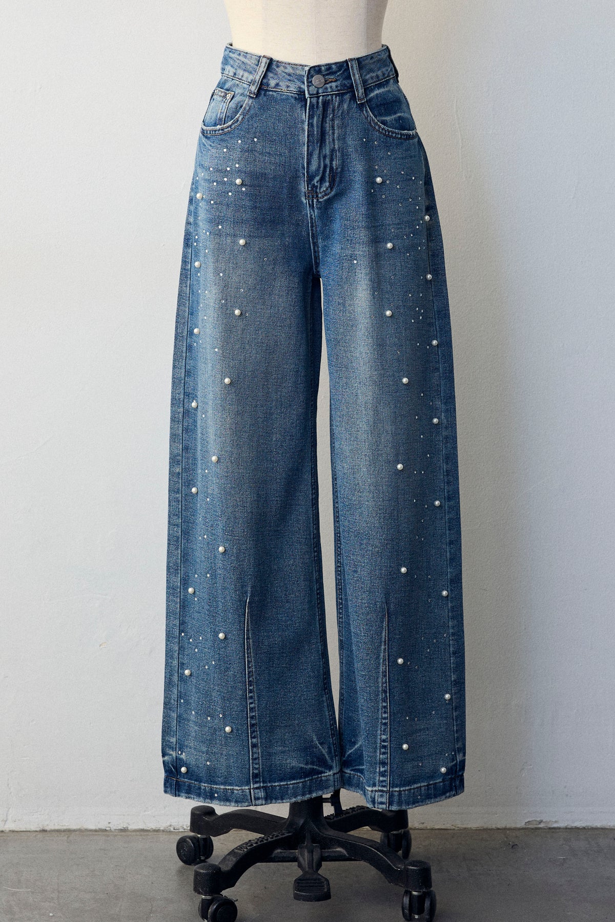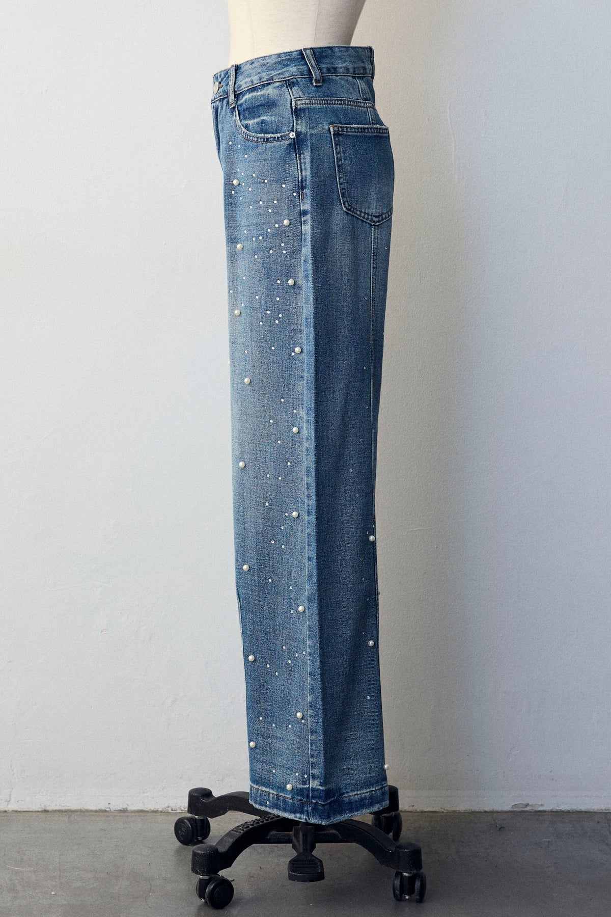 カジュアルなデニムに、パールとラインストーンを贅沢に散りばめた主役級のハイウエストパンツ。 歩くたびにきらめく装飾がジュエリーのようなアクセントになり、いつものデニムスタイルを華やかにクラスアップさせます。 腰位置を高く見せるハイウエストと、脚のラインを拾わない絶妙なワイドシルエットで、履くだけでスタイルアップ効果は抜群。 シンプルなトップスと合わせるだけで様になり、甘めのブラウスやニットと合わせれば、大人ならではのフェミニンカジュアルが完成します。