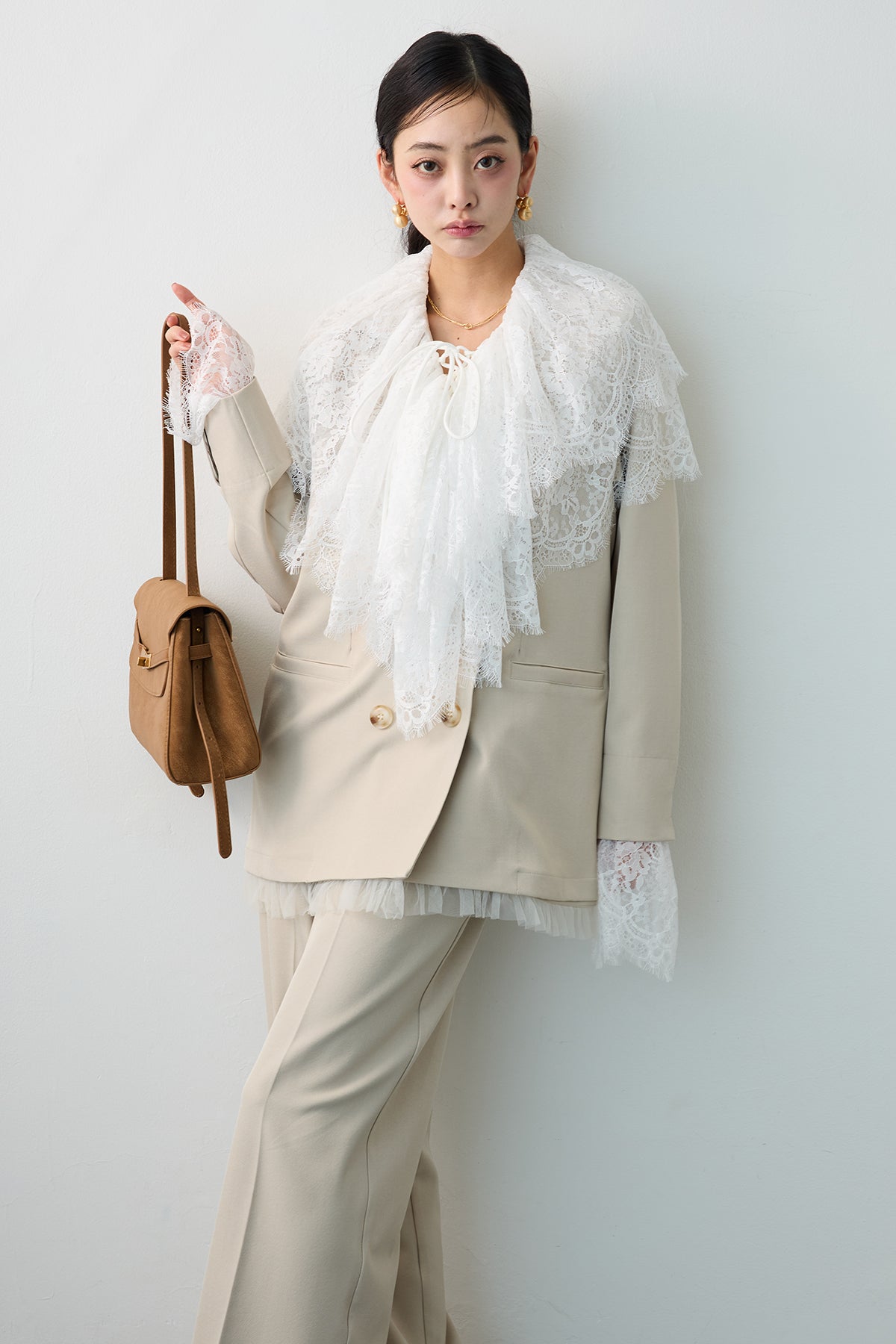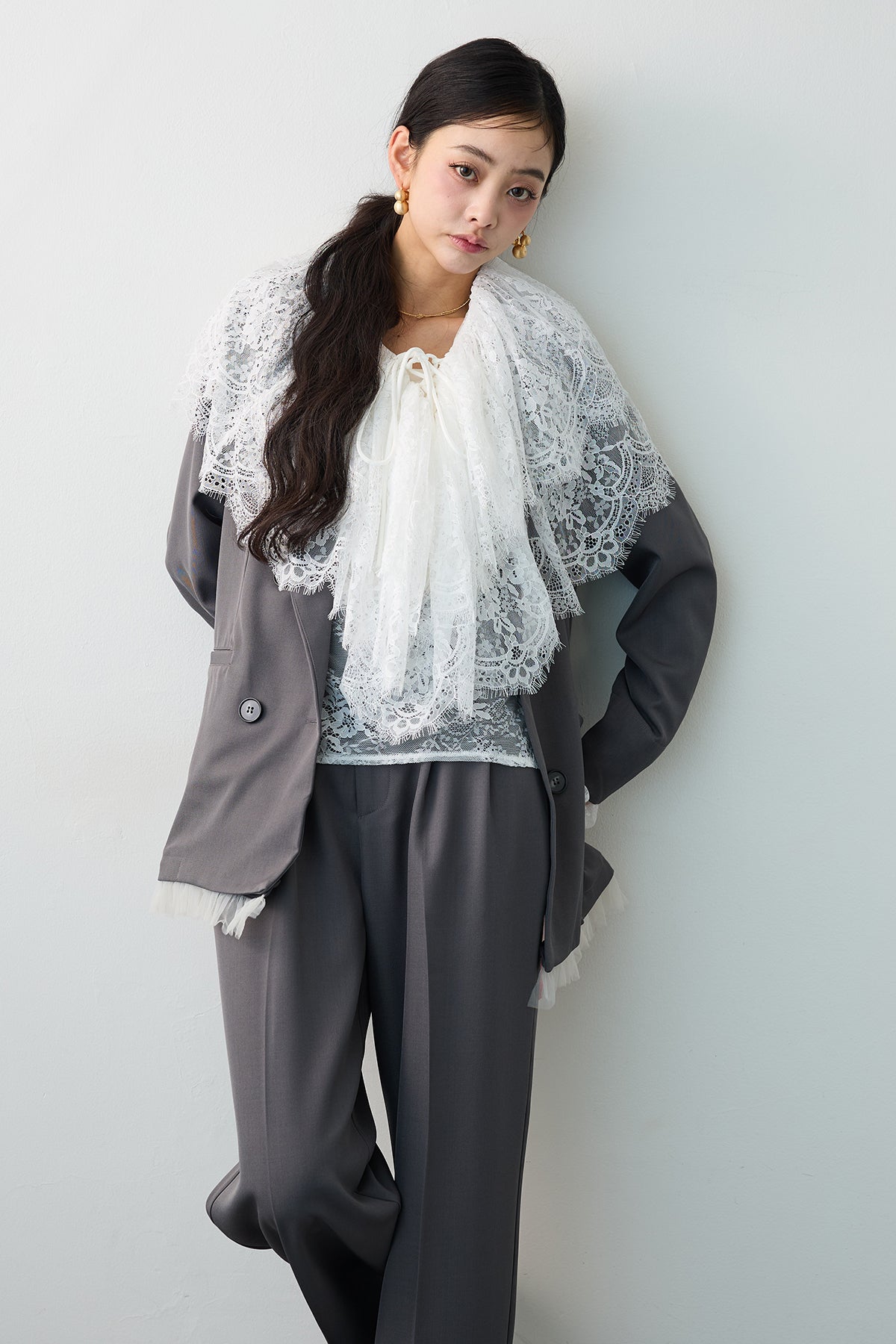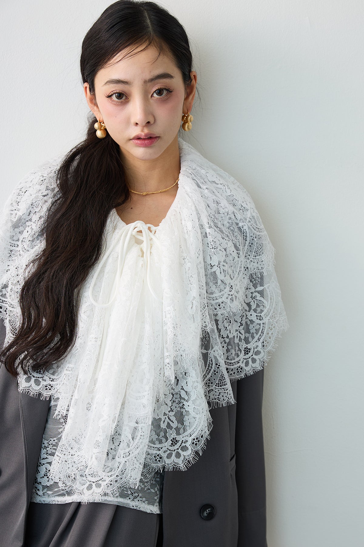 繊細なレースを贅沢に使用し、クラシカルな甘さを表現したフリルブラウス。 胸元のレースアップデザインと、幾重にも重なるボリューミーなフリルが、顔周りをドラマティックに演出します。 一枚で着るのはもちろん、ジャケットやカーディガンのインナーとして合わせ、大きな襟や袖口のレースを大胆に覗かせるスタイリングがおすすめ。 いつものコーディネートにプラスするだけで、トレンド感のある華やかな装いへと格上げしてくれる主役級アイテムです。