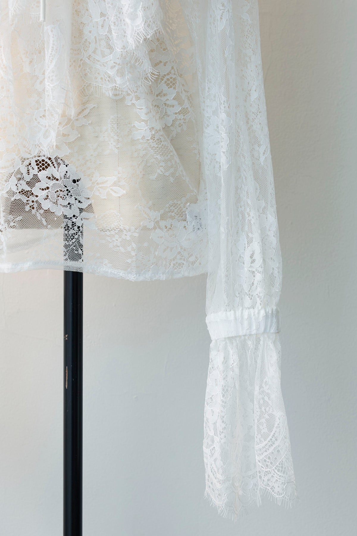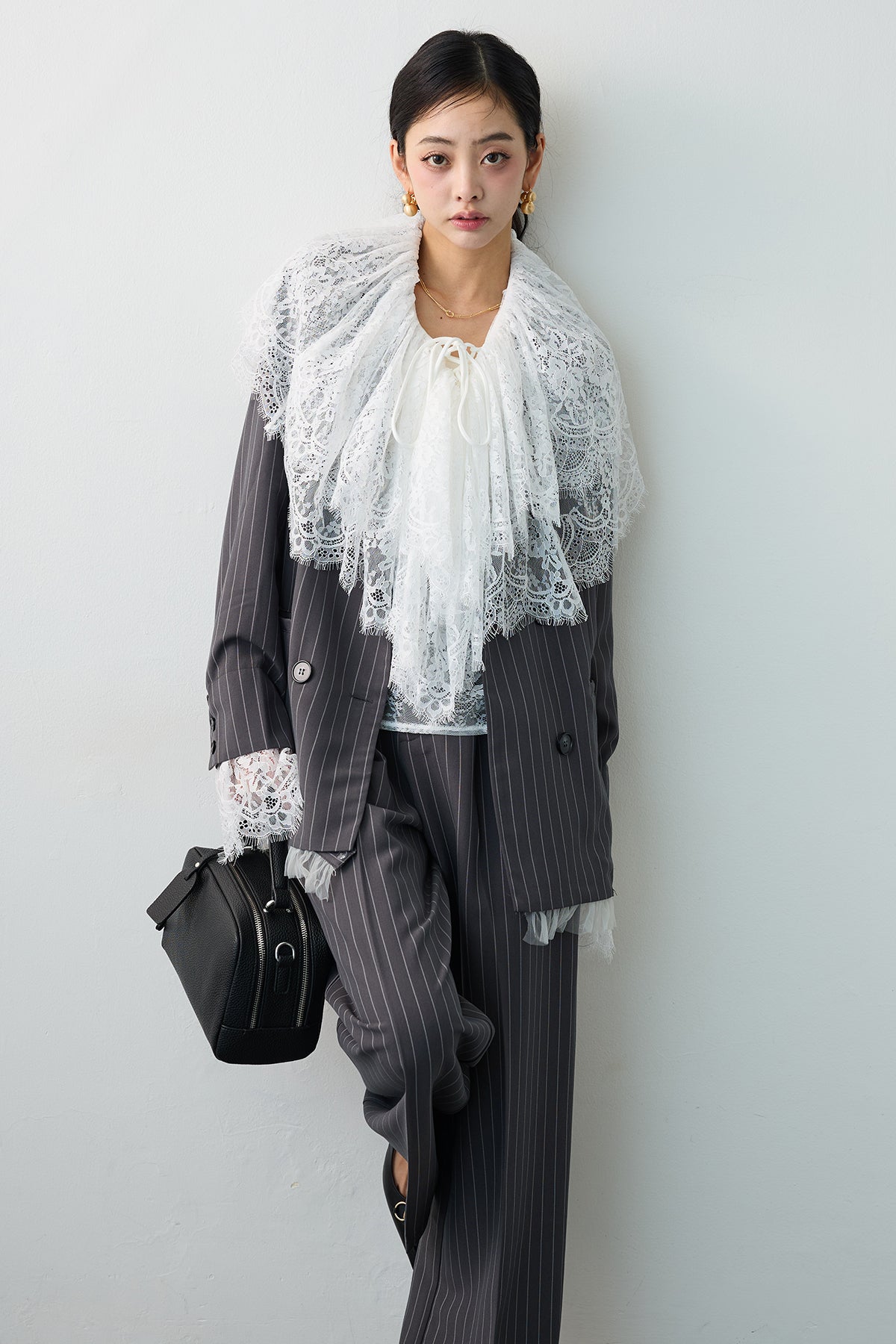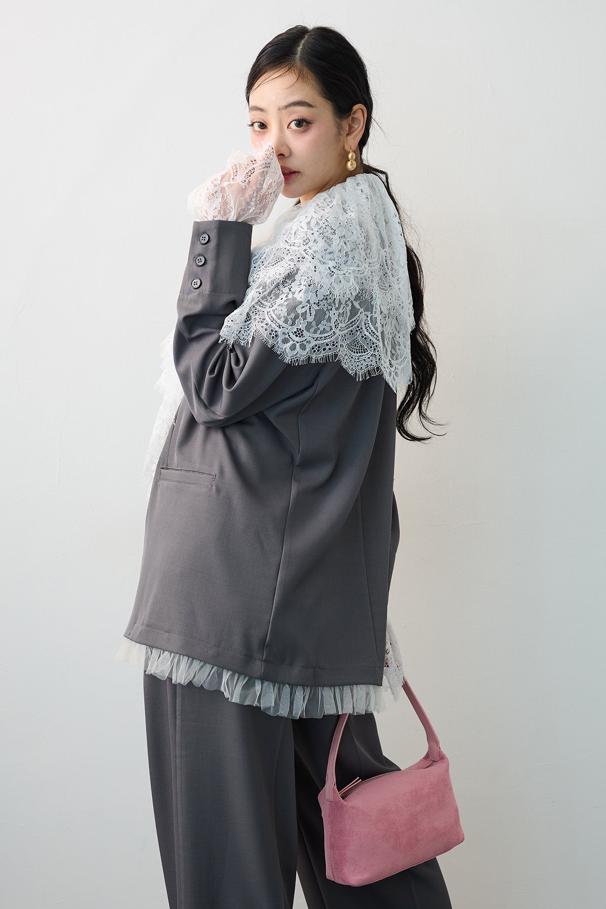 繊細なレースを贅沢に使用し、クラシカルな甘さを表現したフリルブラウス。 胸元のレースアップデザインと、幾重にも重なるボリューミーなフリルが、顔周りをドラマティックに演出します。 一枚で着るのはもちろん、ジャケットやカーディガンのインナーとして合わせ、大きな襟や袖口のレースを大胆に覗かせるスタイリングがおすすめ。 いつものコーディネートにプラスするだけで、トレンド感のある華やかな装いへと格上げしてくれる主役級アイテムです。