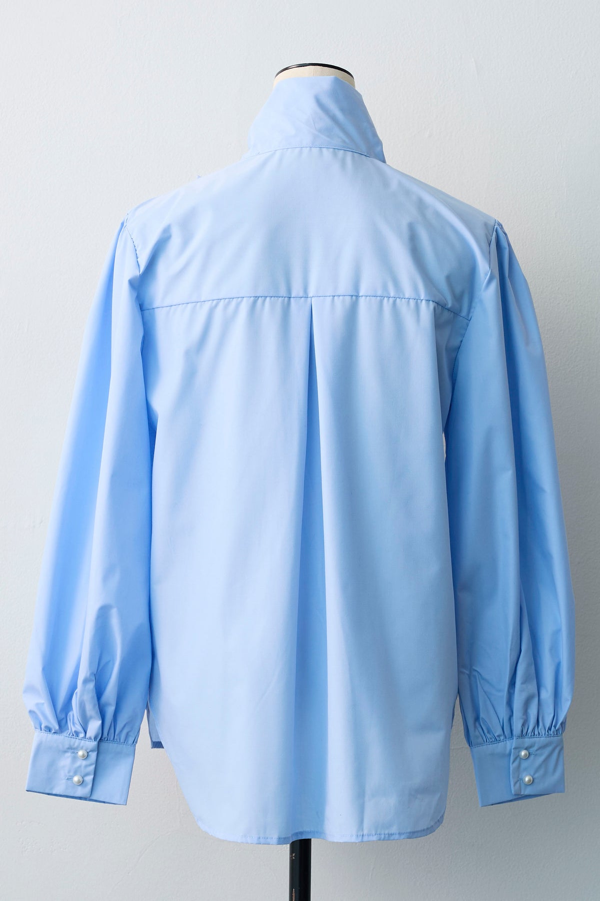 顔周りを華やかに彩る、大きなボウタイリボンが主役のブラウス。 ハリのある素材が立体的なリボンを作り、ジャケット等のインナーとしても抜群の存在感を放ちます。 リボンは結び方でボリューム調整ができ、クラシカルからフェミニンまで幅広いスタイルに対応。 ギャザーを寄せたふんわり袖のカフスにはパールボタンをあしらい、手元にさりげない可愛らしさをプラスしました。 デイリーからオフィス、セレモニーまで活躍する、一枚は持っておきたい万能アイテムです。