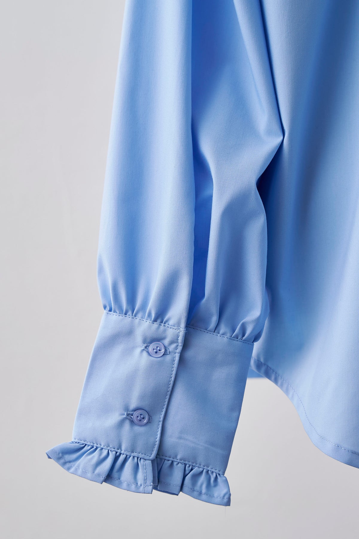 首元と袖口に施された愛らしいミニフリルが、顔周りと手元を華やかに彩るブラウス。 ふんわりとしたボリュームスリーブと、長めのカフスデザインが、クラシカルで女性らしいシルエットを演出します。一枚で着映えするのはもちろん、ジャケットやワンピースのインナーとして着用し、襟や袖口からフリルを覗かせるレイヤードスタイルもおすすめ。 甘すぎない「大人可愛い」バランスが絶妙で、オンオフ問わずコーディネートのアクセントとして活躍する万能アイテムです。