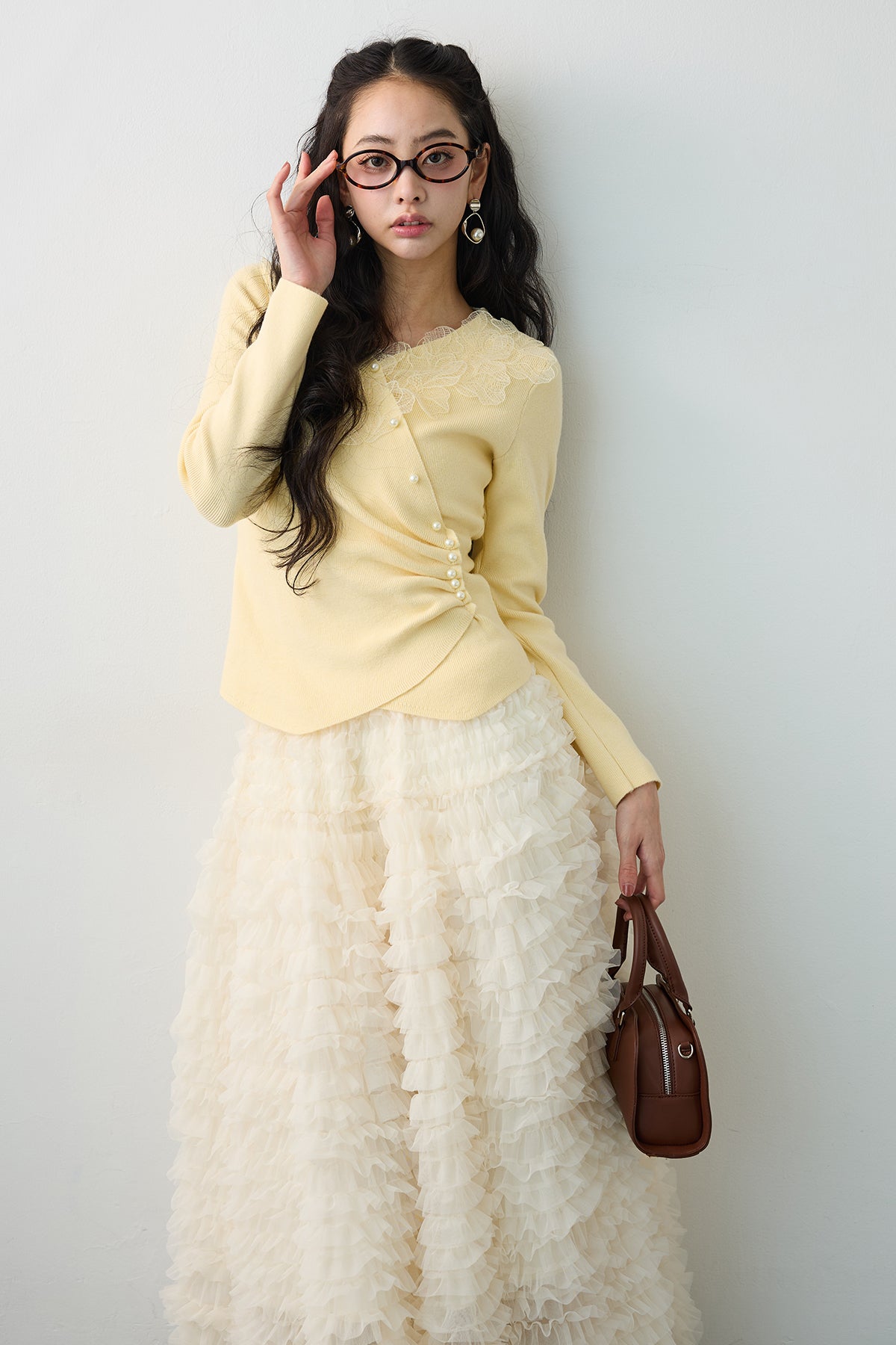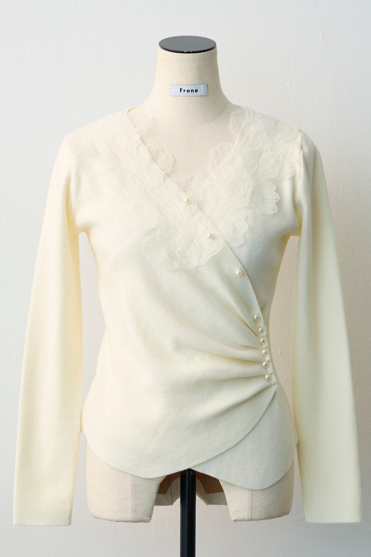 デコルテに施された繊細なレースと、斜めに配置されたパールボタンが、大人のエレガンスを引き立てるデザインニット。 ウエスト部分にタックを入れることで、自然なシェイプが生まれ、着るだけでスタイルアップが叶う美しいシルエットに。 クロスしたカシュクール風のデザインが、上半身をすっきりと見せつつ、女性らしい抜け感を演出します。 コンパクトな着丈なので、ボリュームのあるスカートやハイウエストのボトムスともバランスよく決まる一着です。