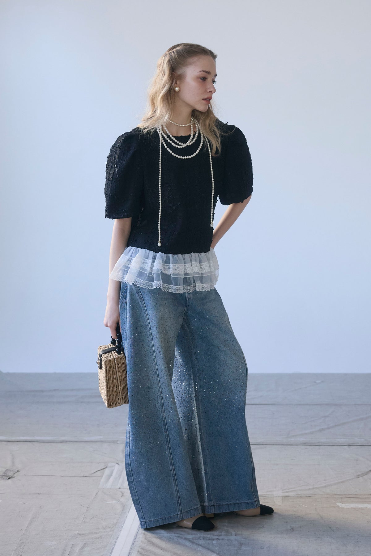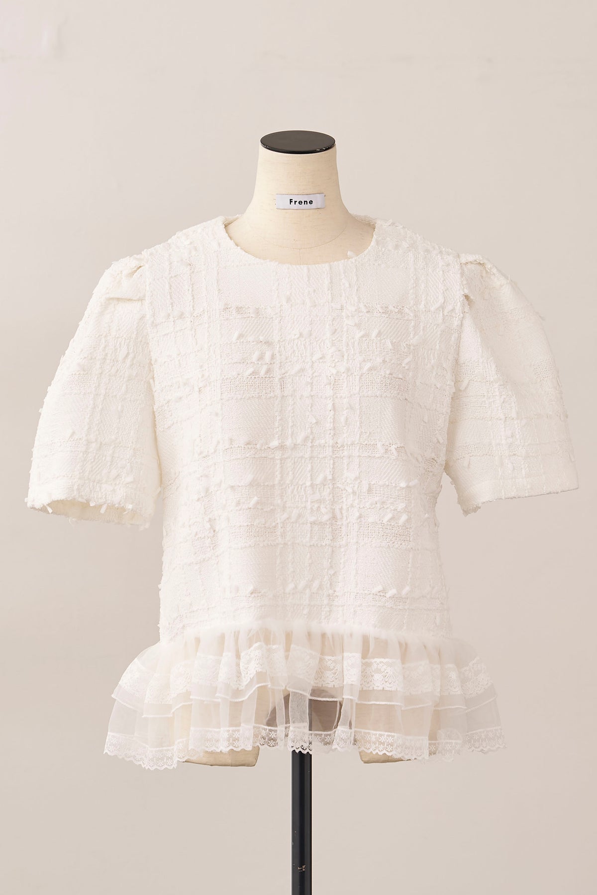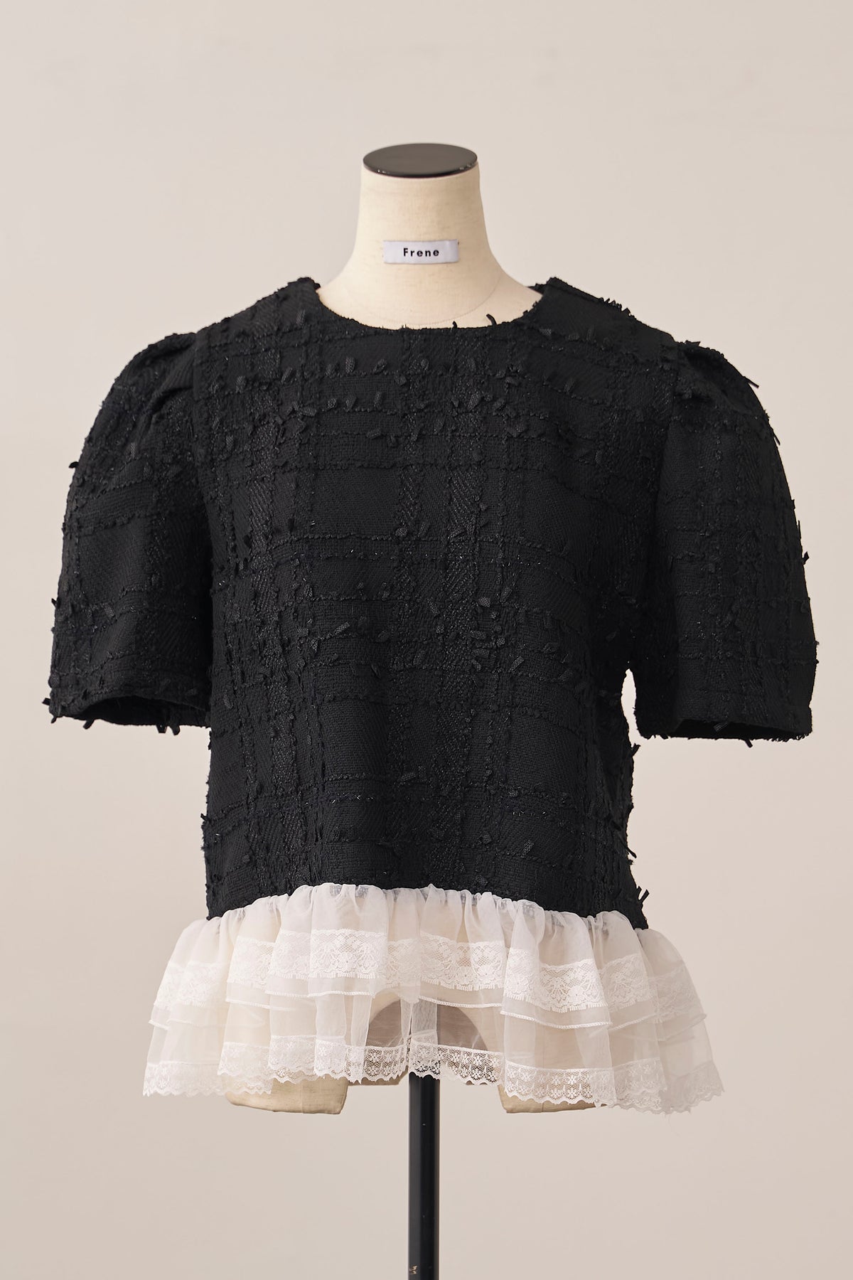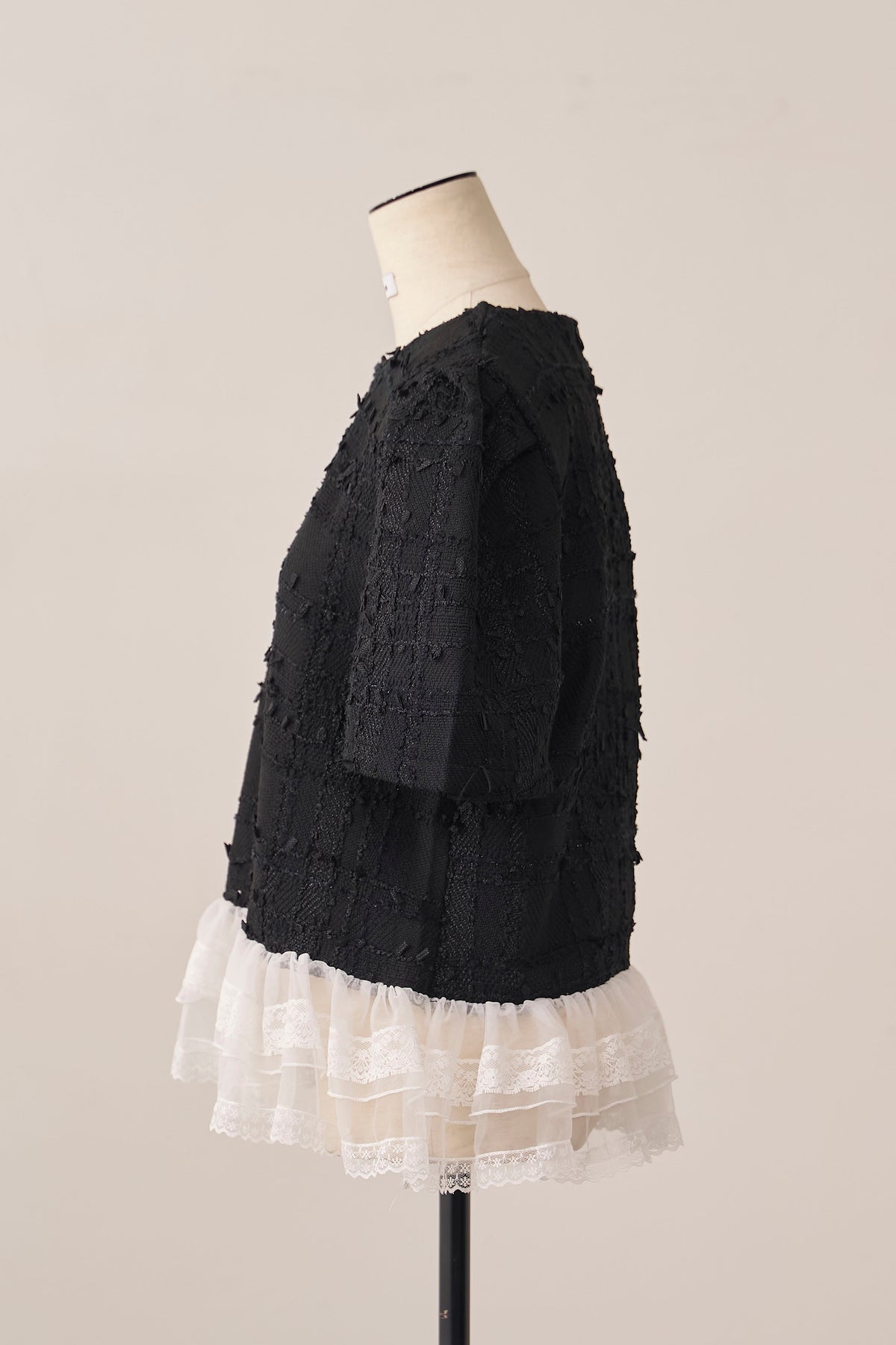 リッチなサマーツイードと、裾の繊細なレースが奏でるドッキングトップス。 一枚着るだけで、計算されたレイヤードスタイルが即完成します。 ふわりと広がる裾が腰回りをカバーしつつ、黒の装いに軽やかな甘さをプラス。 デニム合わせも上品に決まる、大人のための主役級アイテムです。