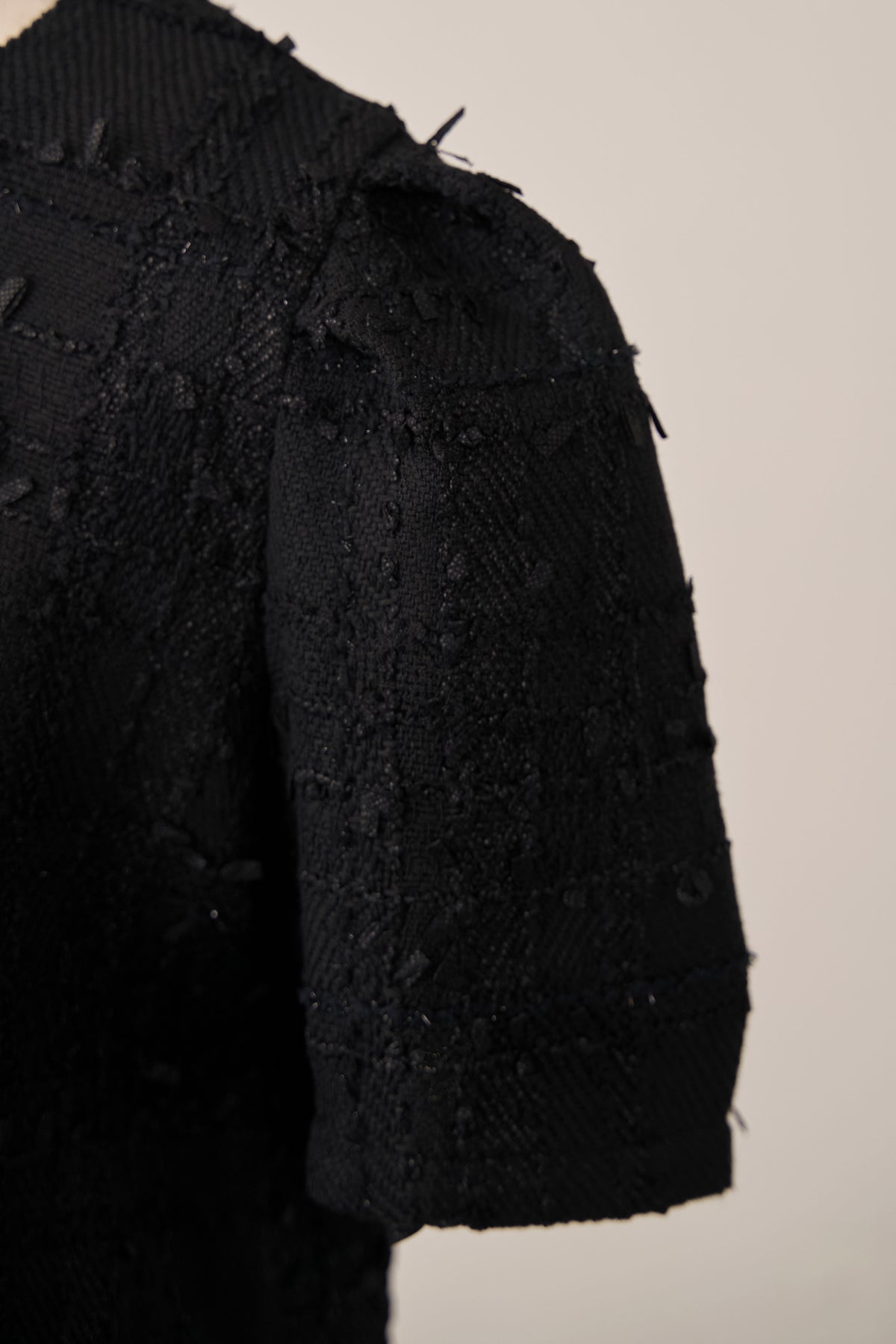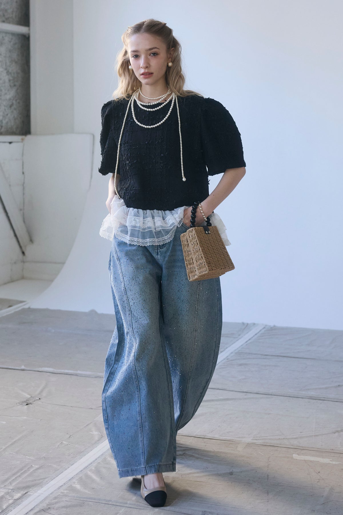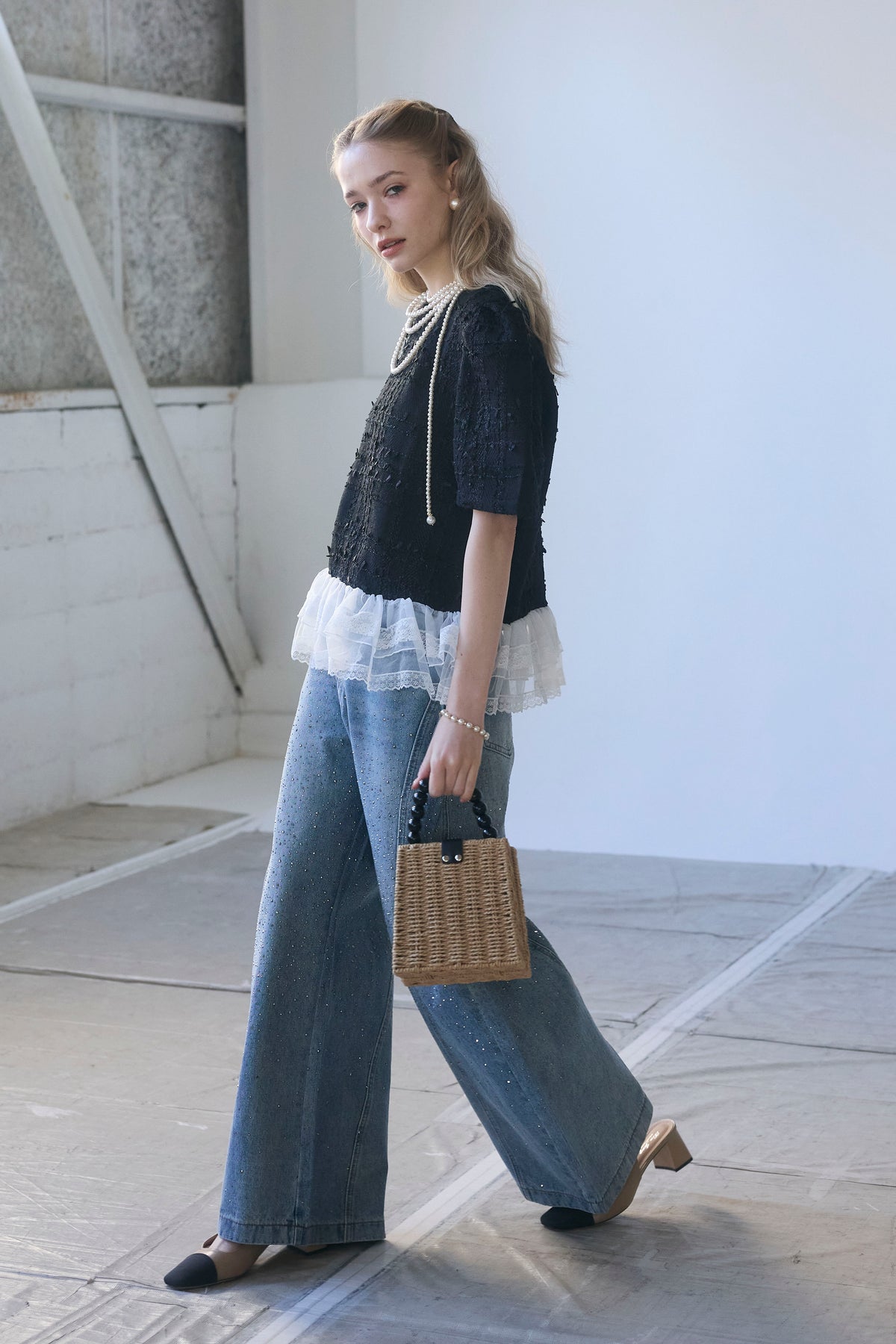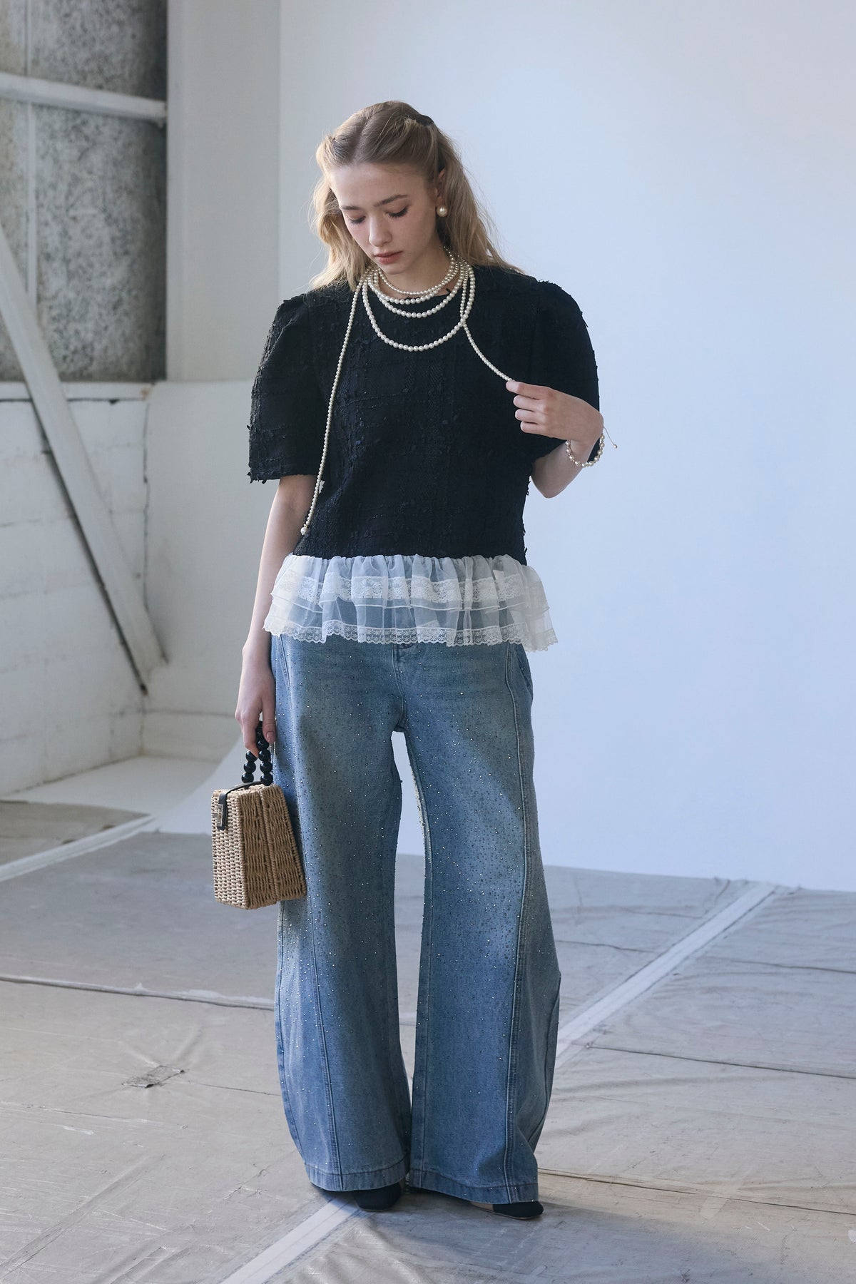 リッチなサマーツイードと、裾の繊細なレースが奏でるドッキングトップス。 一枚着るだけで、計算されたレイヤードスタイルが即完成します。 ふわりと広がる裾が腰回りをカバーしつつ、黒の装いに軽やかな甘さをプラス。 デニム合わせも上品に決まる、大人のための主役級アイテムです。