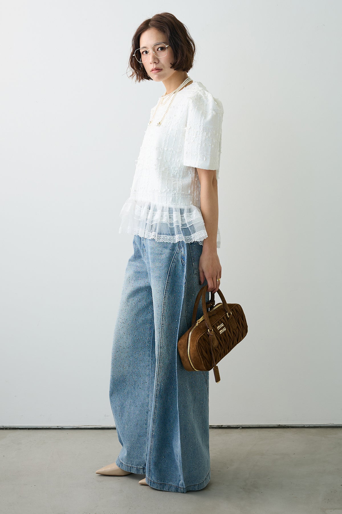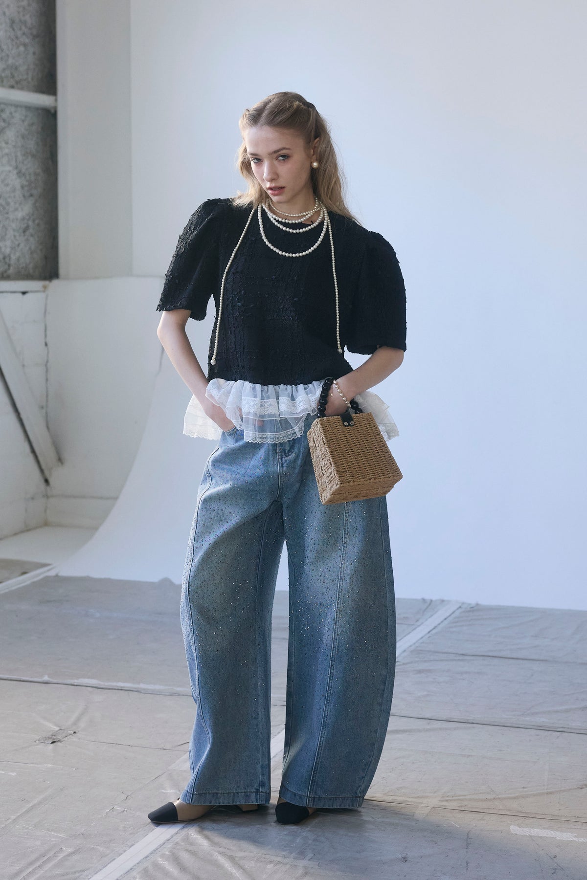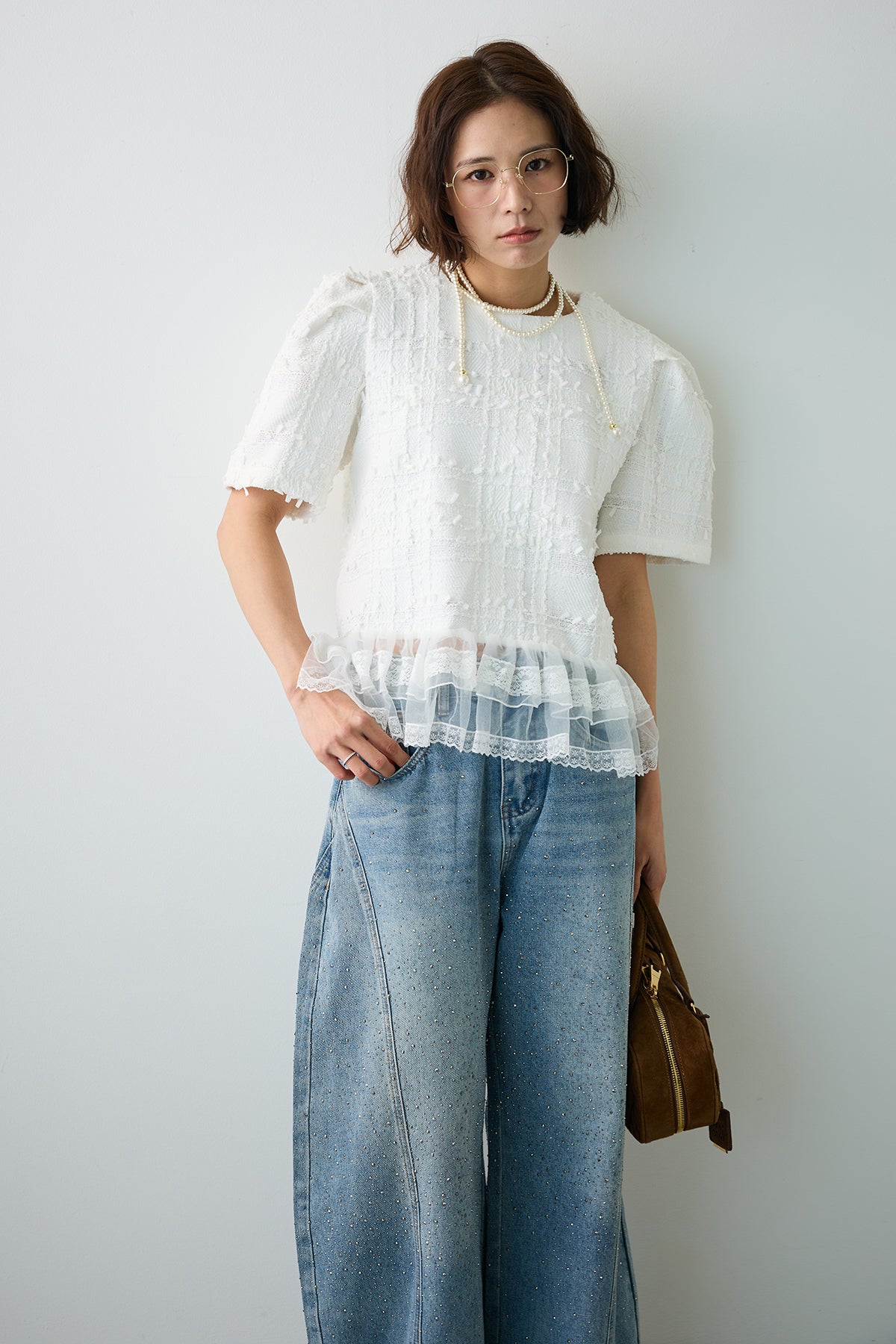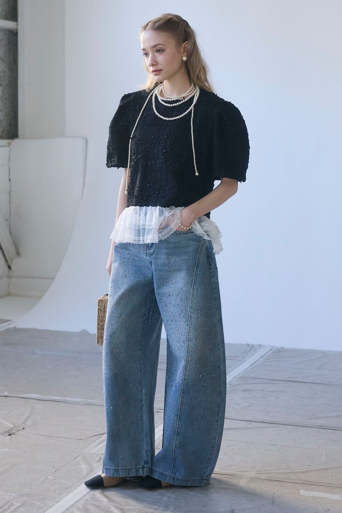 リッチなサマーツイードと、裾の繊細なレースが奏でるドッキングトップス。 一枚着るだけで、計算されたレイヤードスタイルが即完成します。 ふわりと広がる裾が腰回りをカバーしつつ、黒の装いに軽やかな甘さをプラス。 デニム合わせも上品に決まる、大人のための主役級アイテムです。