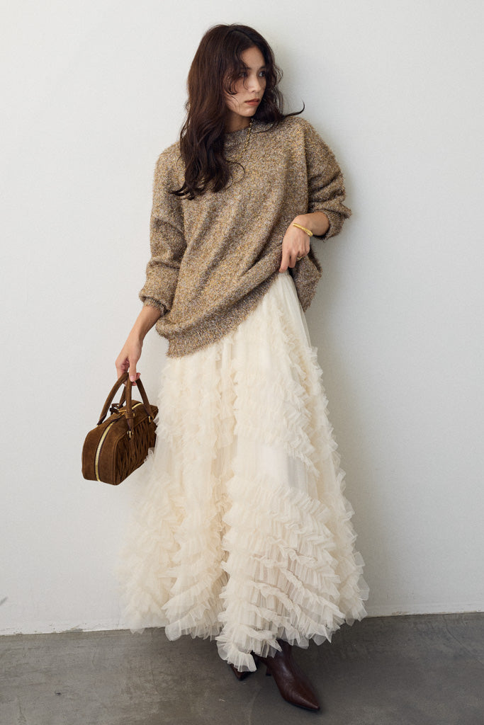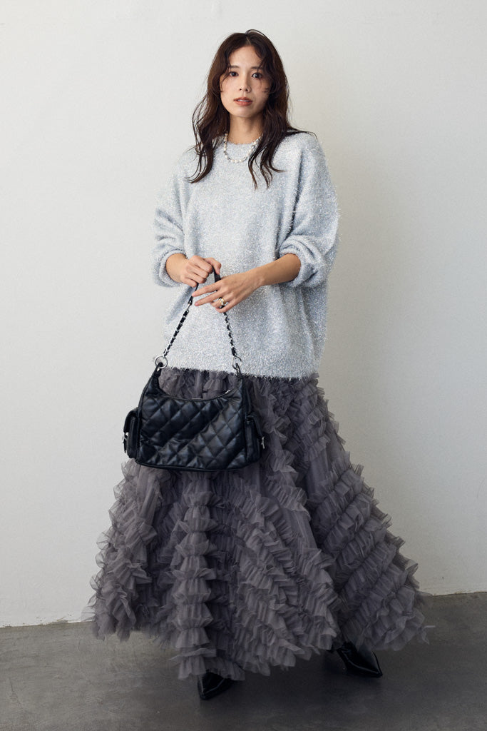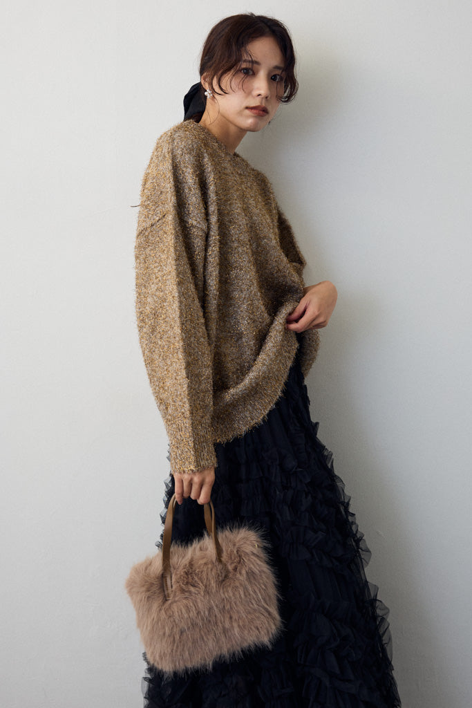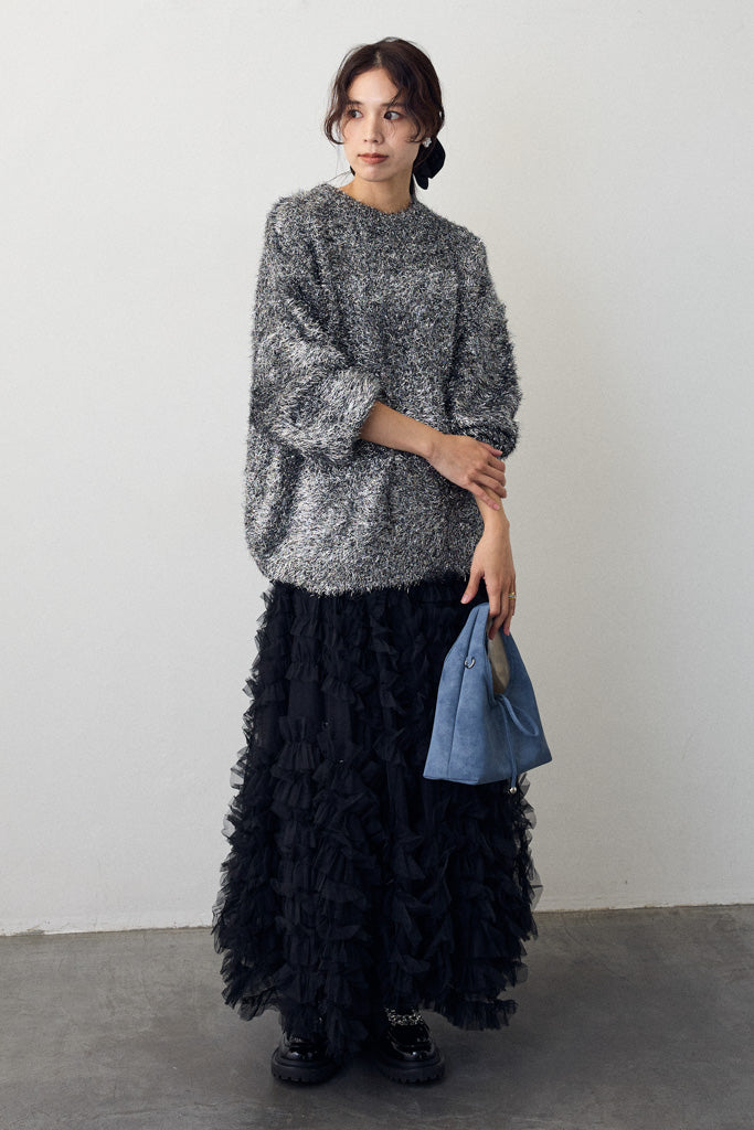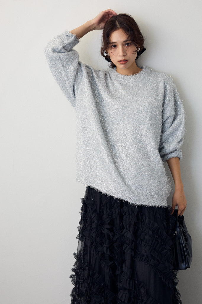 グリッターラメニットは、華やかなラメ糸を織り交ぜた素材で、上品な輝きを放つアイテムです。リラックス感のあるシルエットで、デイリーから特別なシーンまで幅広く活躍します。ほどよい厚みで、秋冬シーズンにぴったりの暖かさを提供します。柔らかい手触りと光沢感のある糸が、着心地の良さとスタイリッシュさを両立。ベーシックなデザインでありながらも、キラリとしたディテールが洗練された印象を与えます。