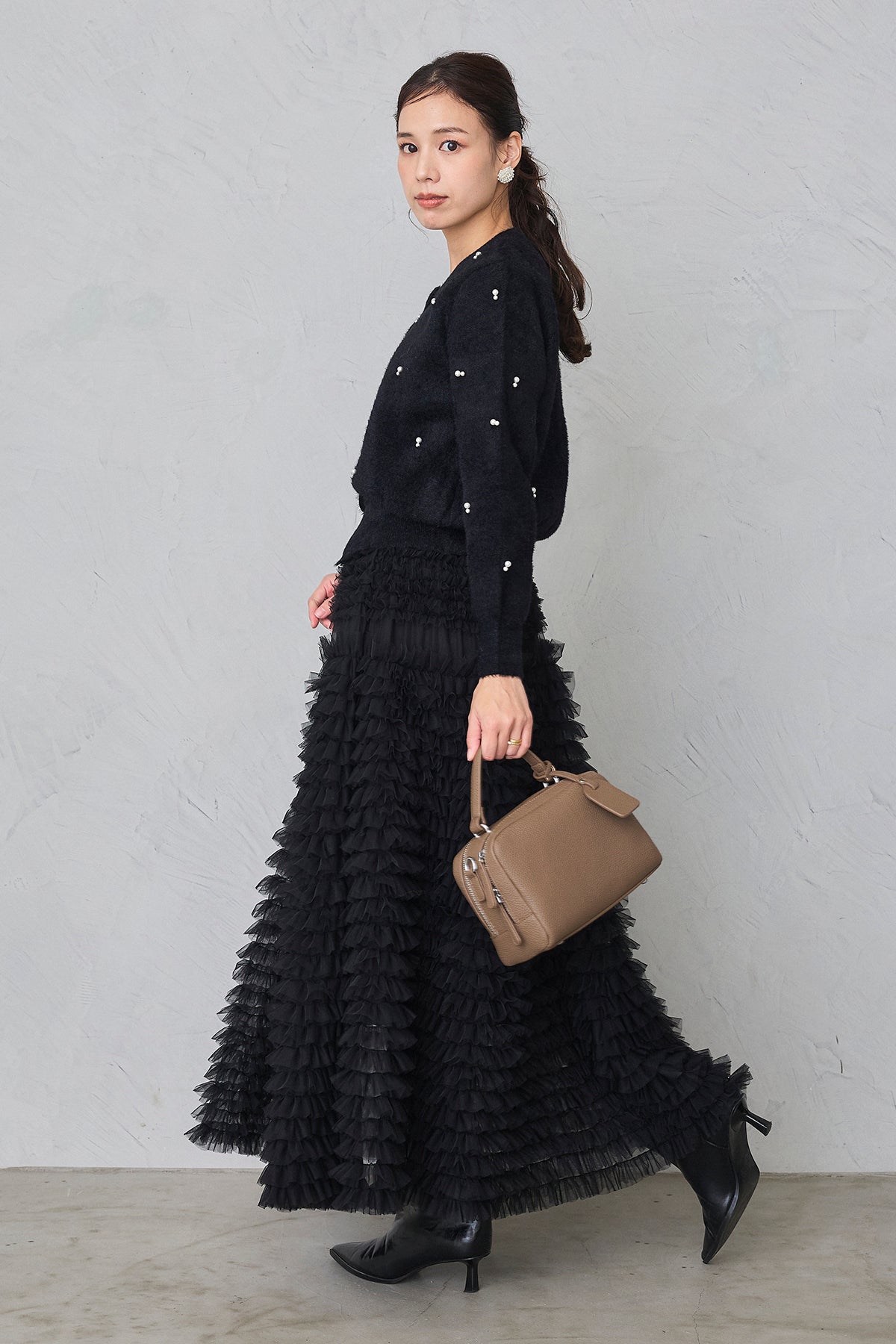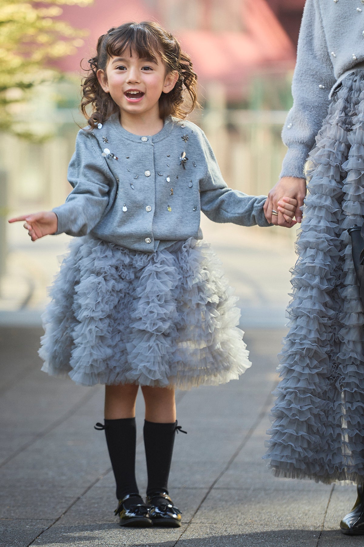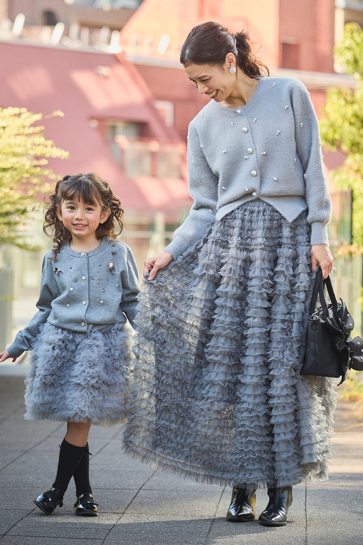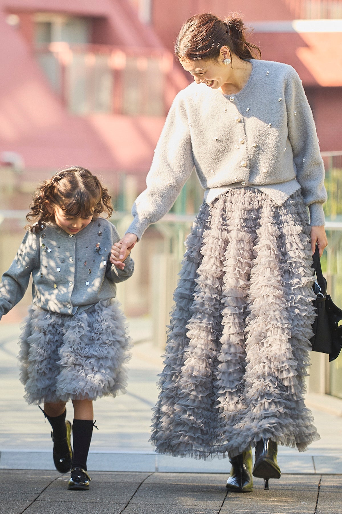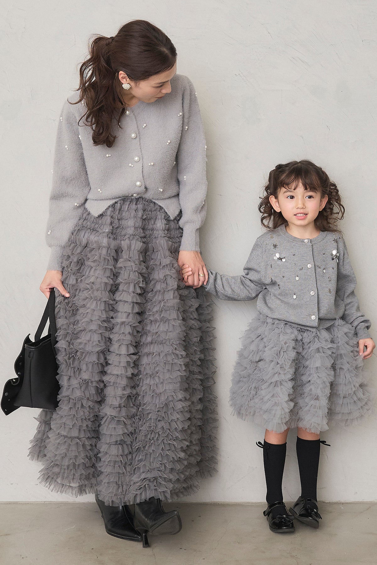 [予約/親子SET]ミックスパールシャギーコーディガン+ホイップチュールティアードスカート+[kids]刺繍ビースニットカーデ+ホイップチュールスカートセット(3set)