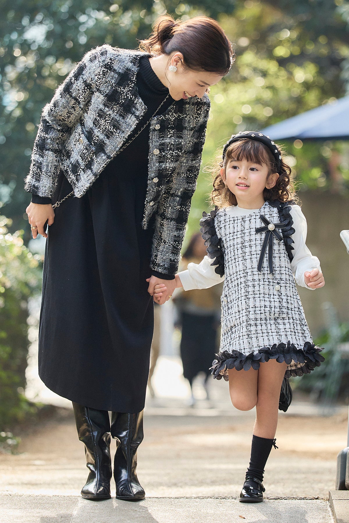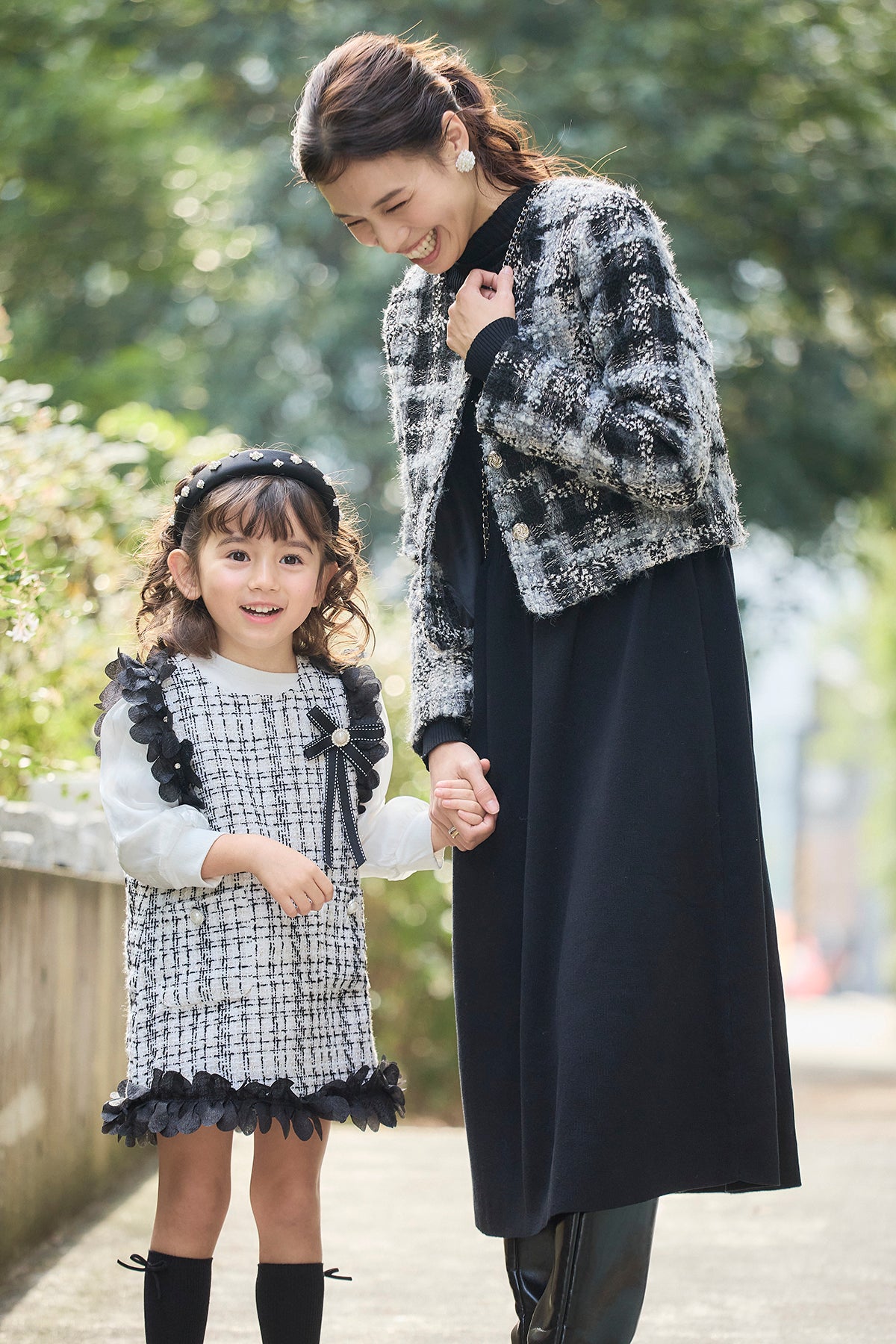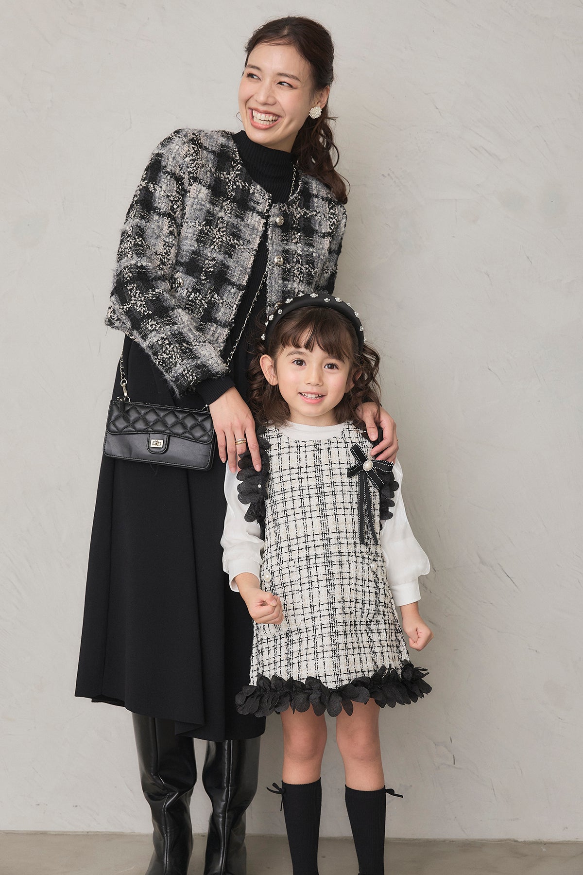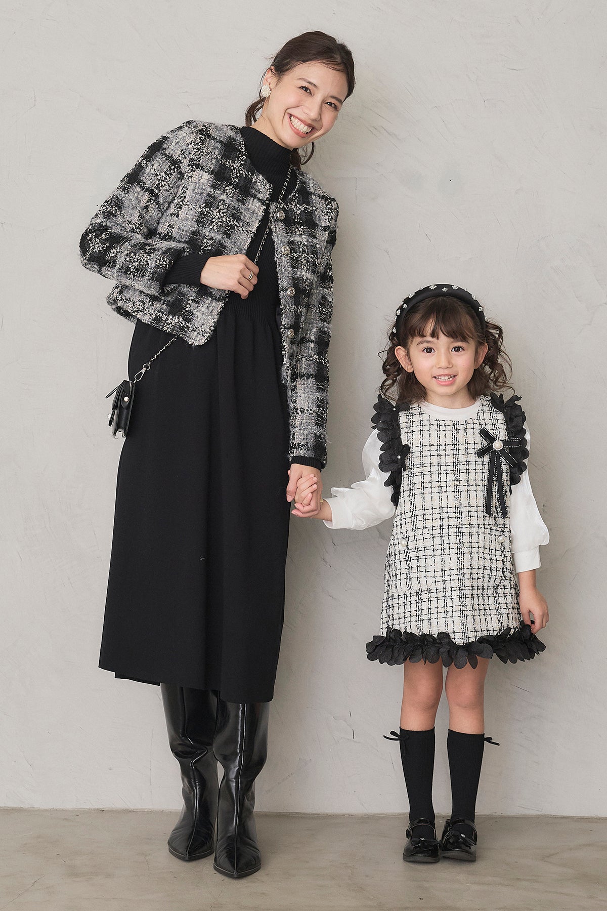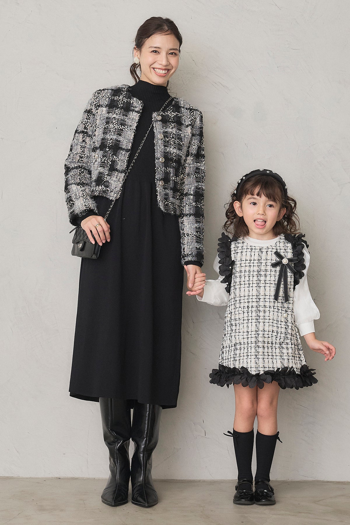 [予約/親子SET]ツイードチェッククロップドジャケット+リブセミフレアニットワンピース+[kids]フリルツイードワンピセット(3set)