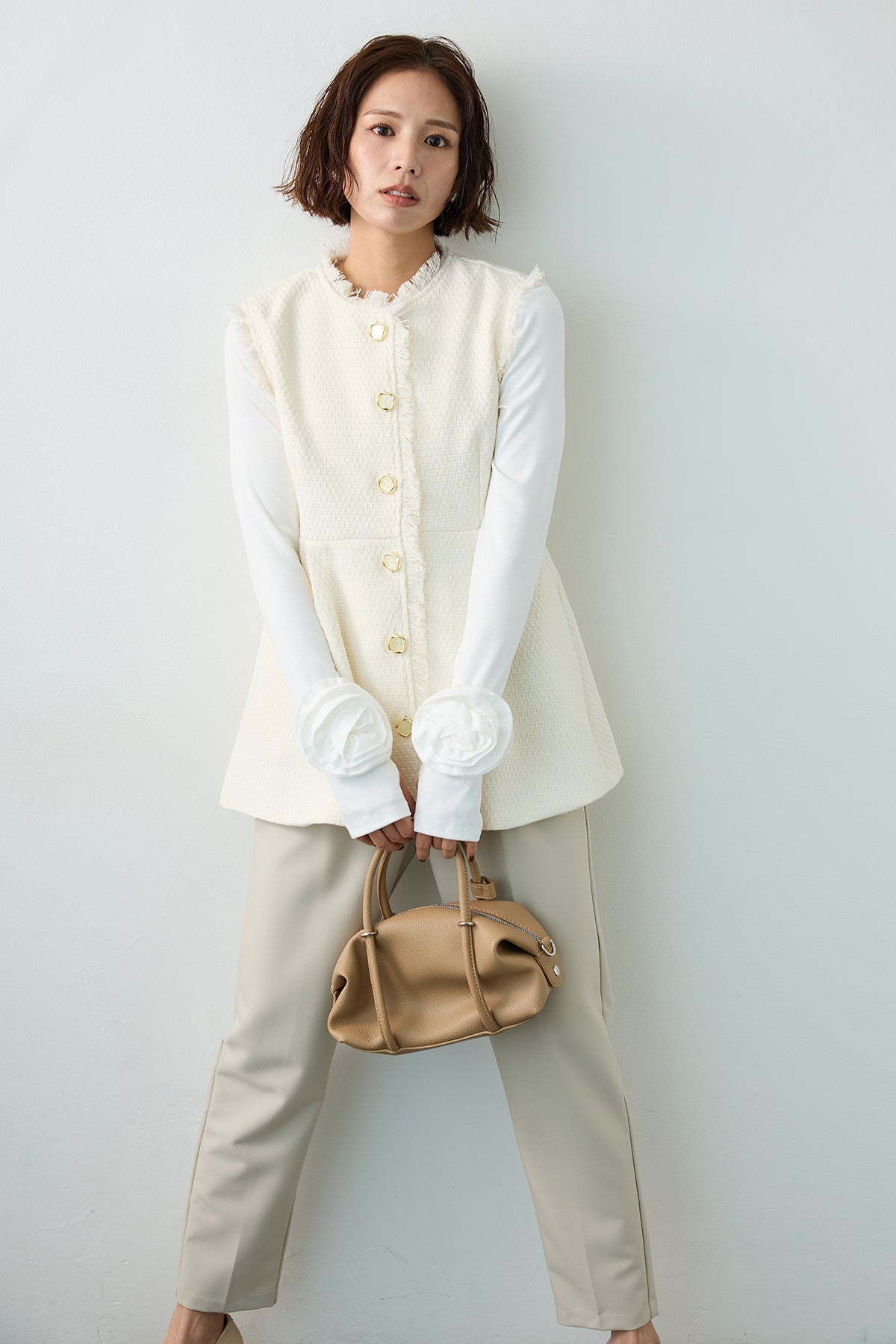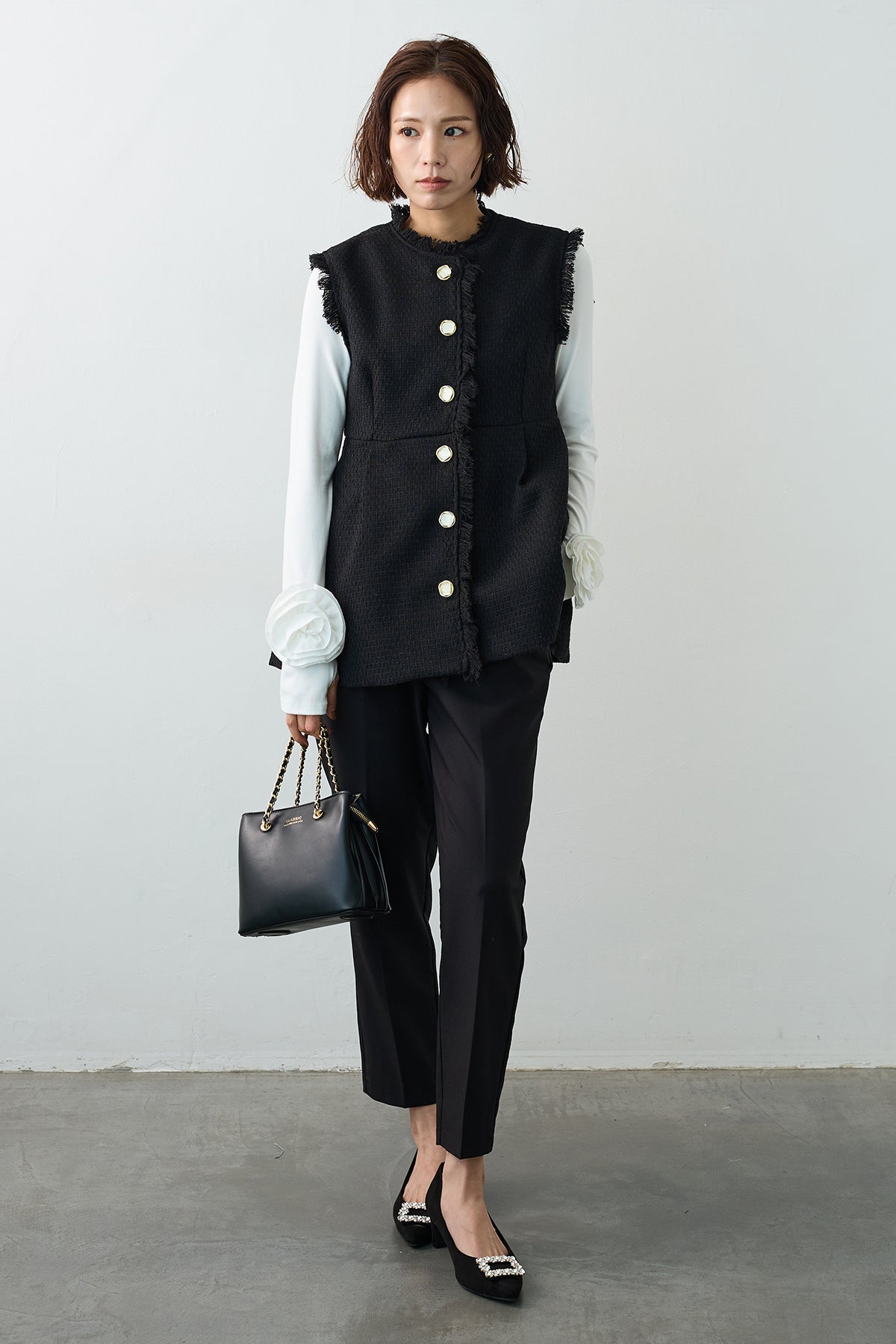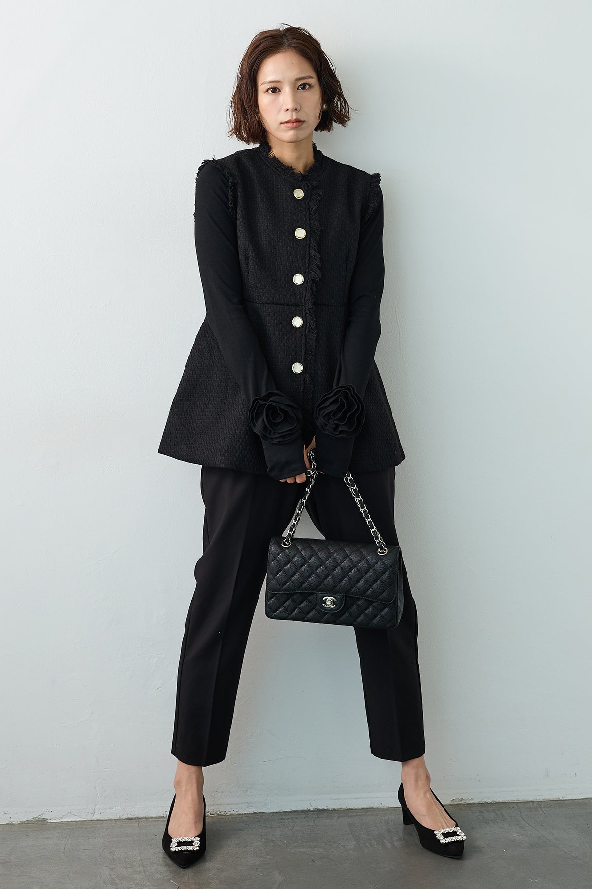 [予約/SET]フラワーモチーフポイントカットトップス+ツイードペプラム美フォルムジレ+タックテーパードパンツ(3set)