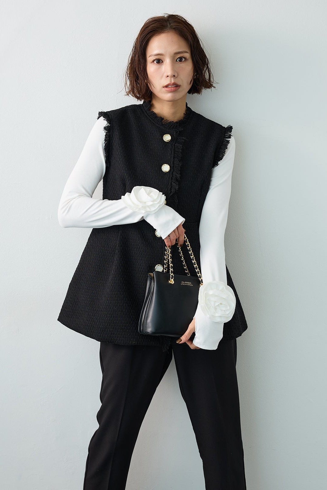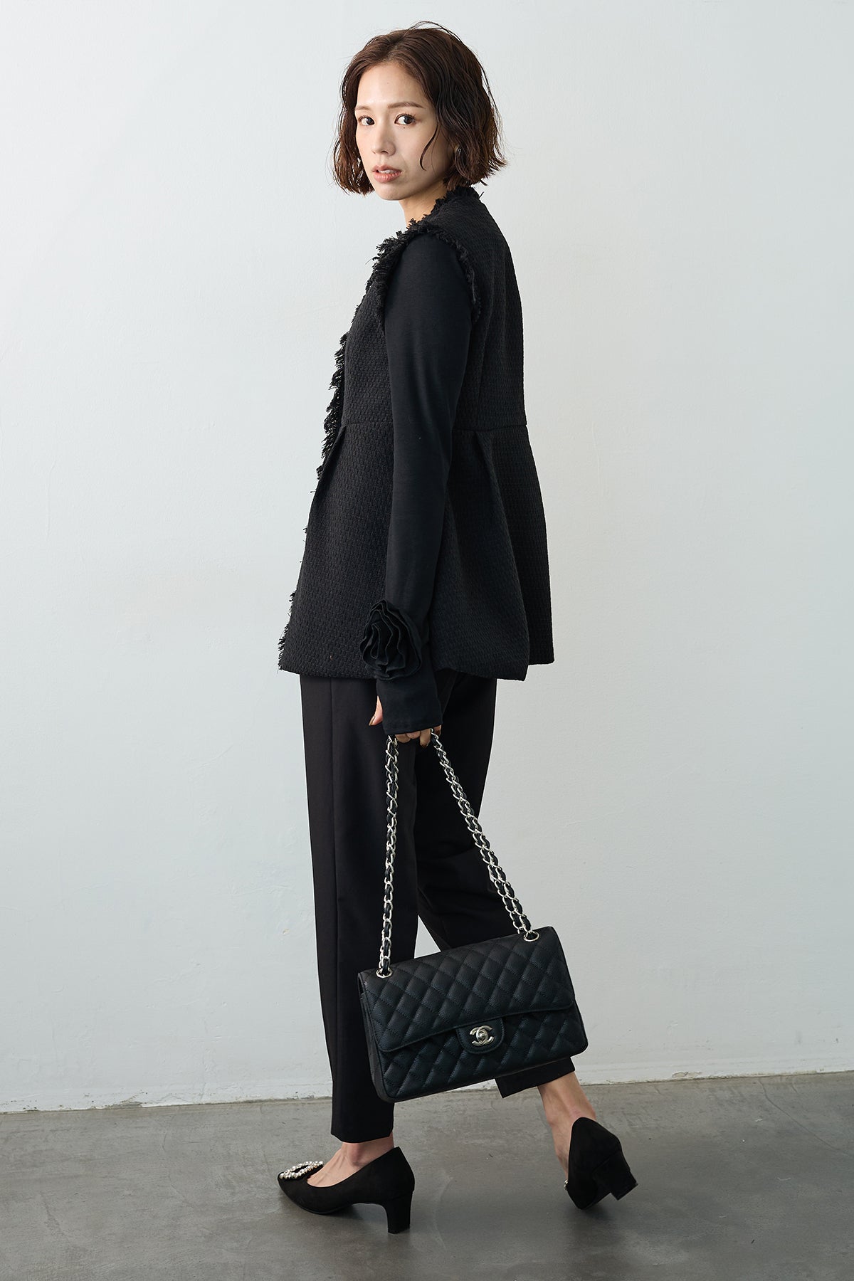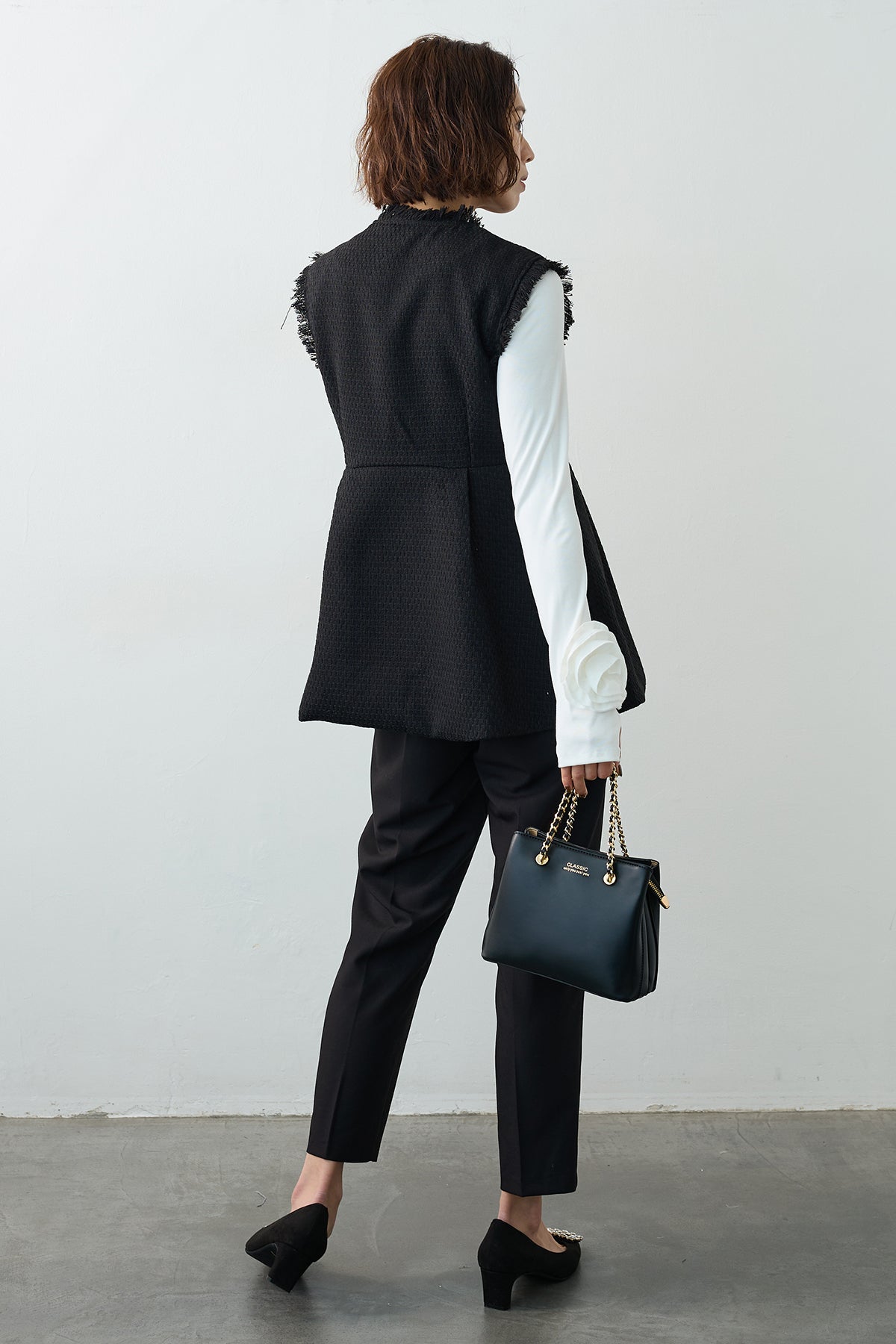 [予約/SET]フラワーモチーフポイントカットトップス+ツイードペプラム美フォルムジレ+タックテーパードパンツ(3set)