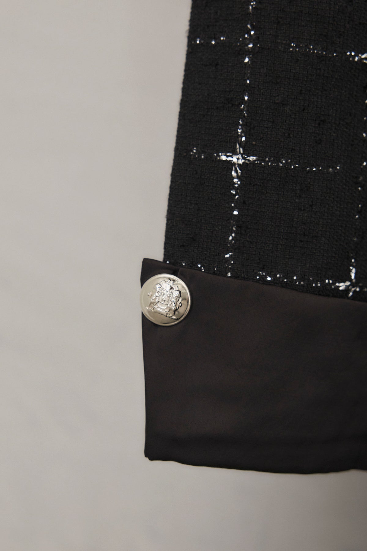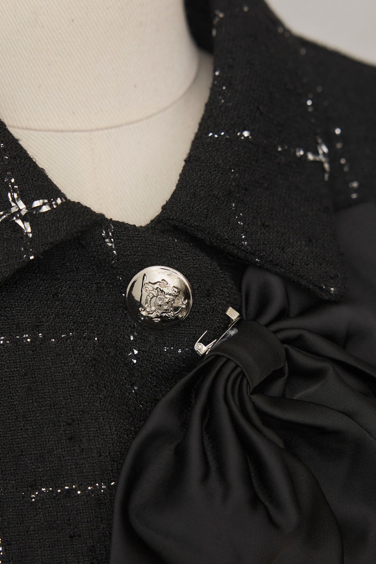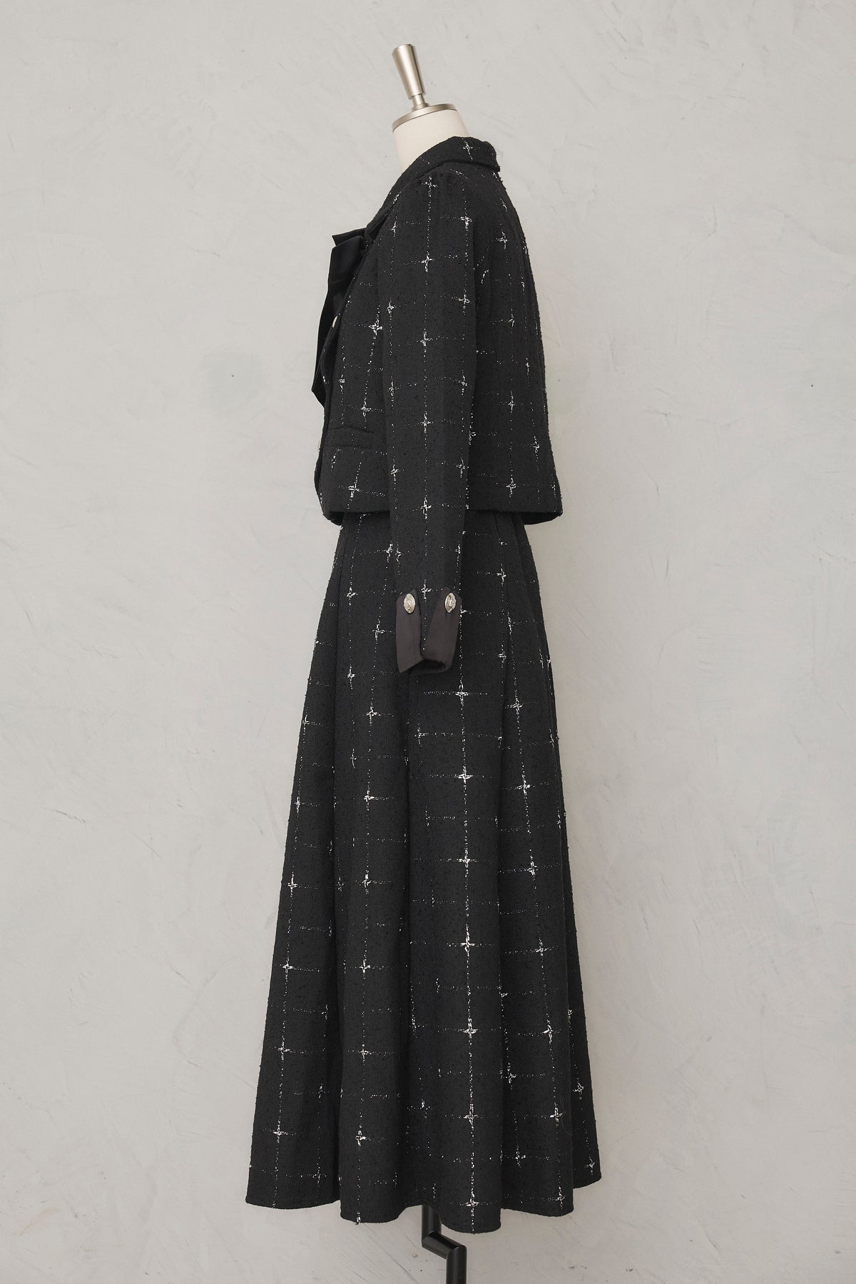 クラシカルなツイードに上品な光沢ラインを織り込み、凛とした存在感を放つ2wayセットアップ。大きめリボンは取り外し可能で、甘さを添えたり、すっきりと着こなしたりと気分に合わせて表情を変えられます。 程よいハリのある素材がシルエットを美しく保ち、特別なシーンでも品よく華やぐ一着。ジャケットとスカートの組み合わせで、オケージョンスタイルをより印象的に仕上げてくれます。