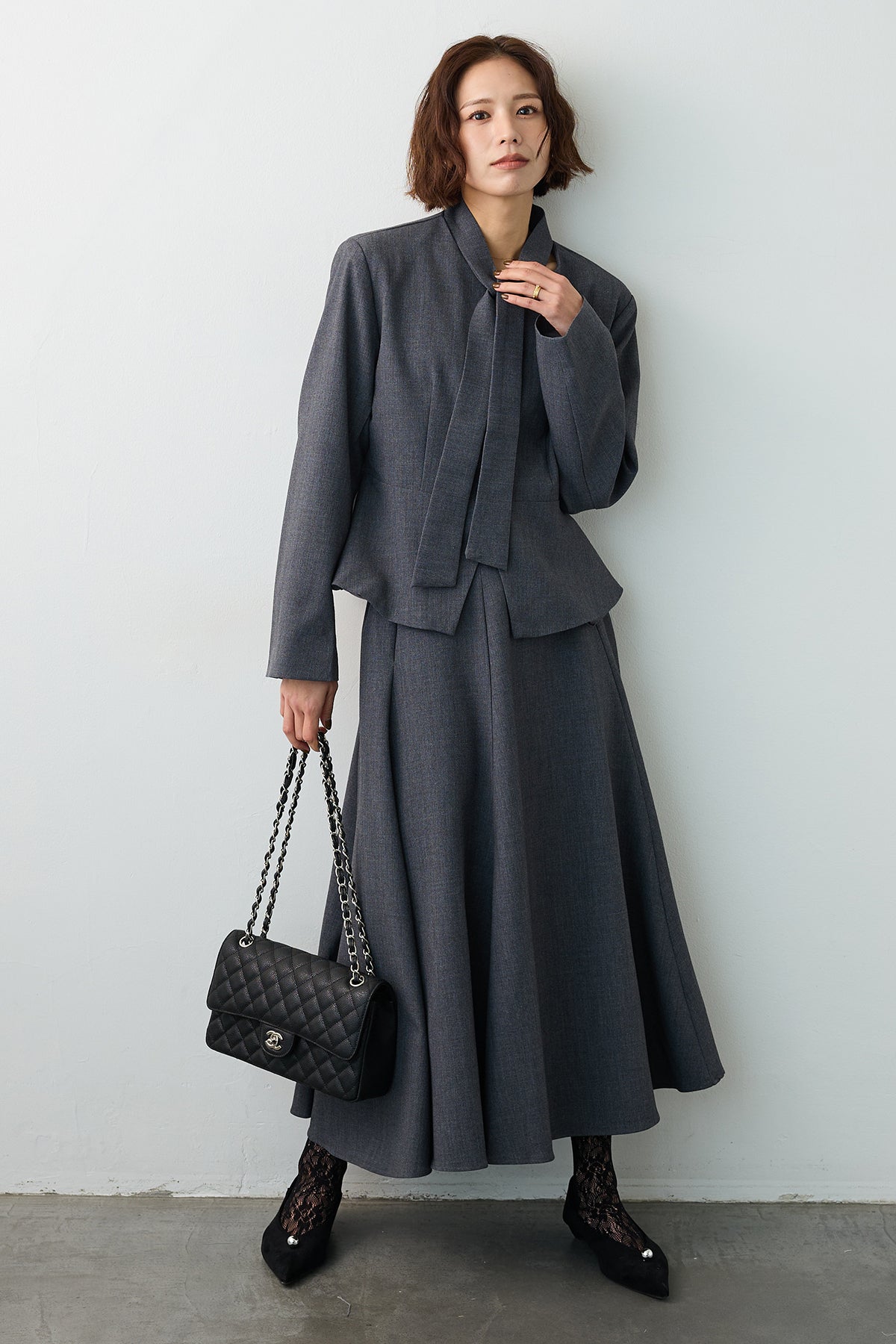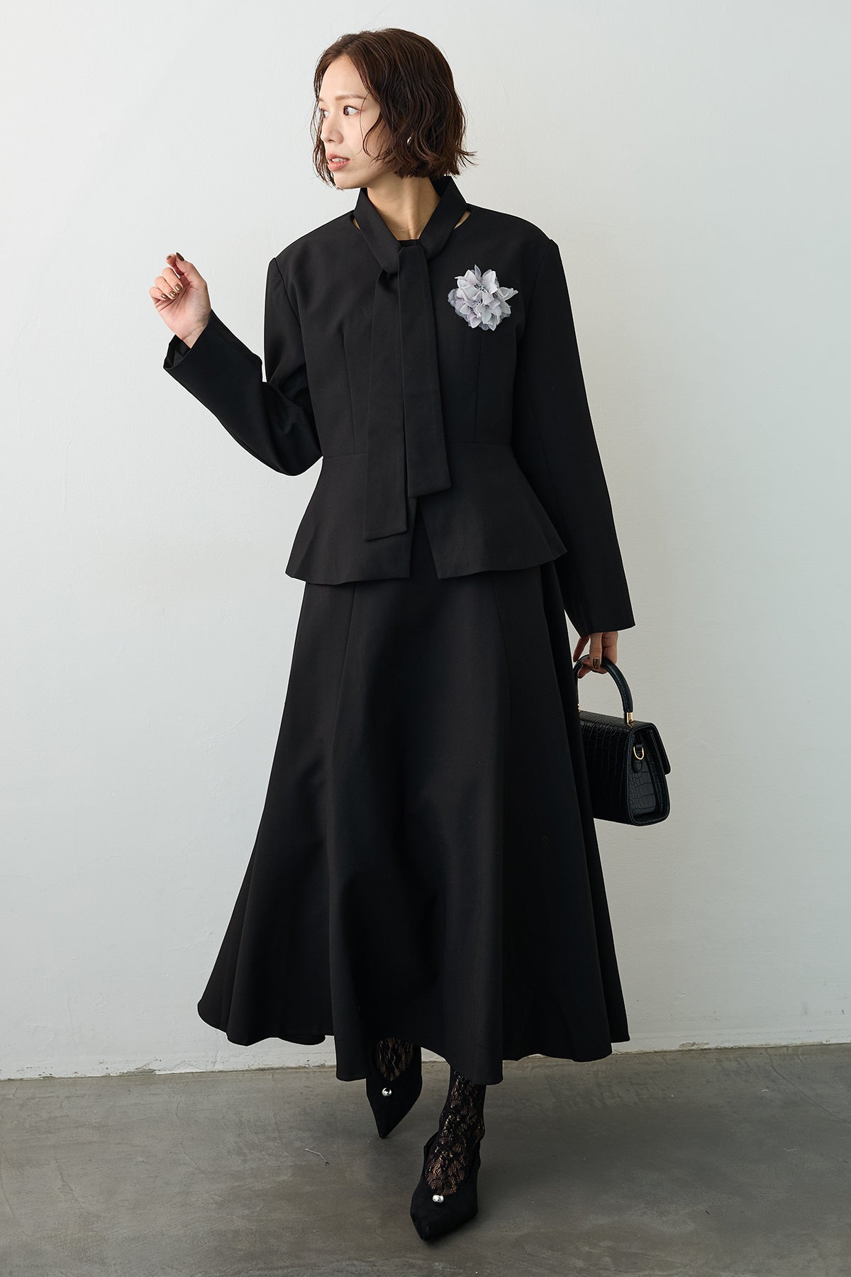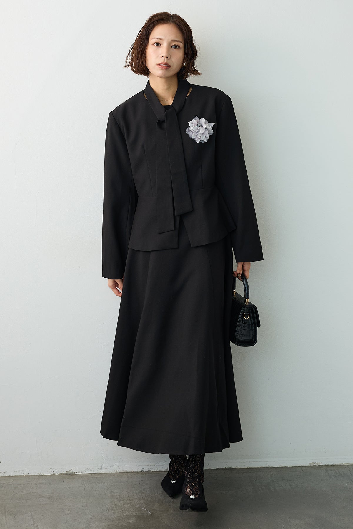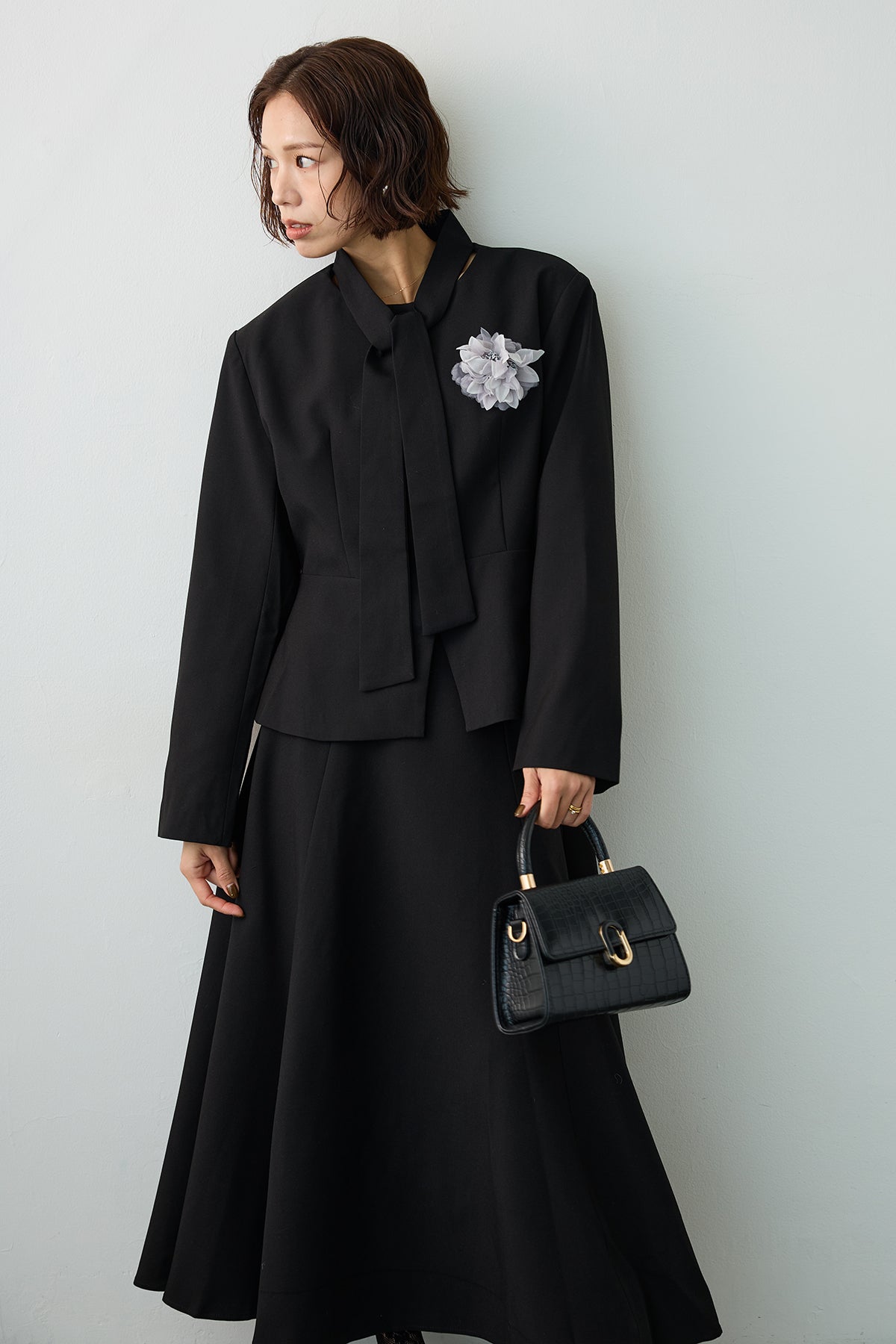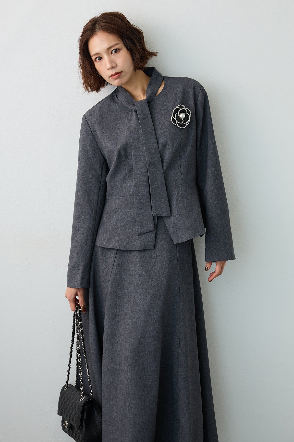 首元のボウタイデザインが、洗練されたアクセントを加えるノーカラージャケットとスカートのセット。 ジャケットは顔周りをすっきりと見せるノーカラー仕立てで、タイを結べばクラシカルで気品ある表情を演出します。 スカートは歩くたびに優雅に揺れるフレアシルエットで、大人の女性らしい落ち着きと華やかさを両立。 セットアップとしてはもちろん、それぞれ単品でも使いやすく、オフィスからセレモニーまで幅広いシーンで活躍する一着です。 ※胸元のコサージュは、セットには含まれません。