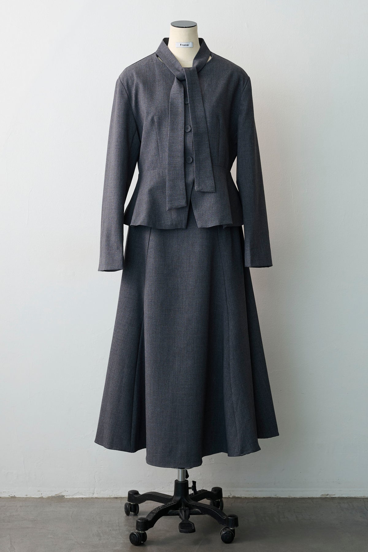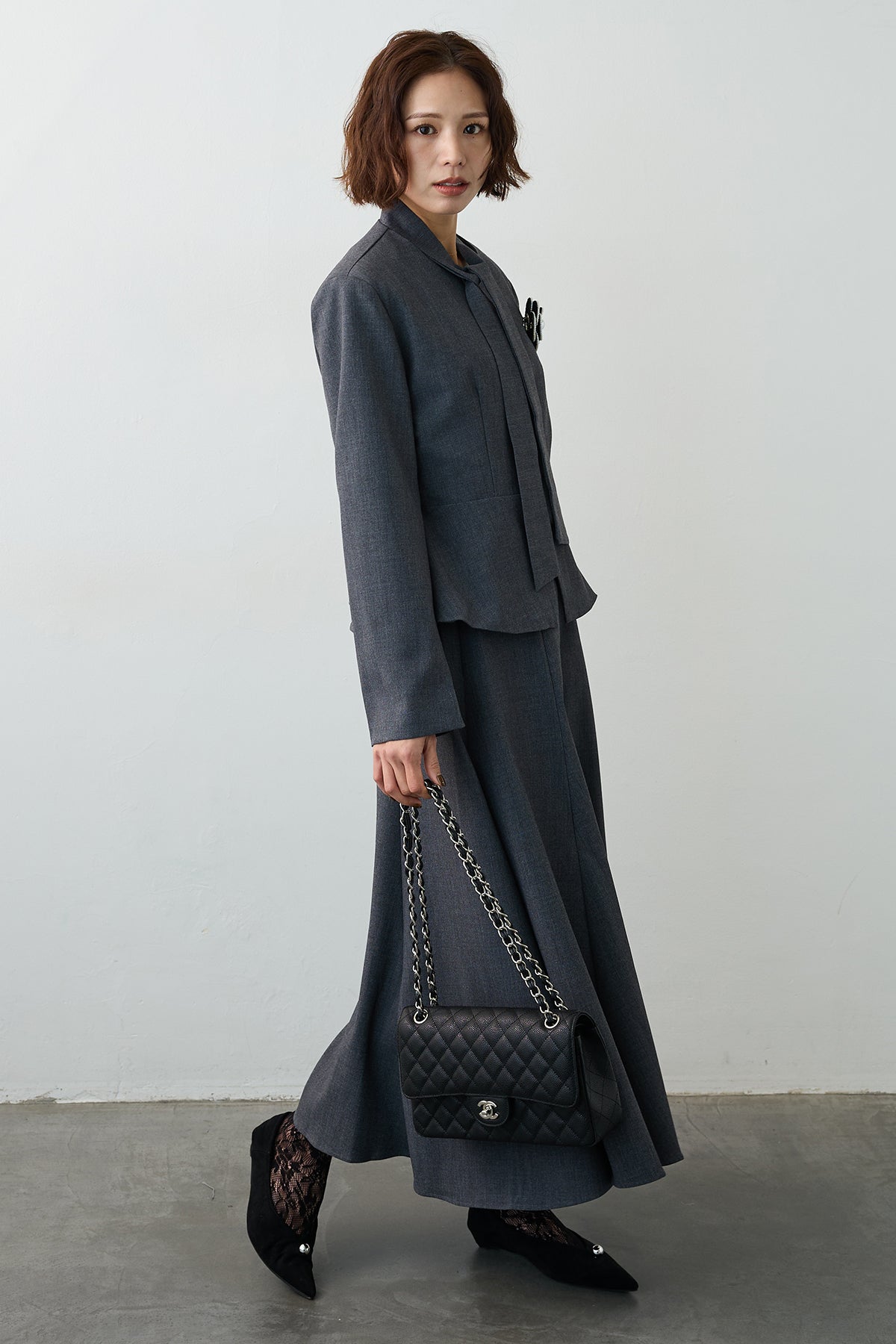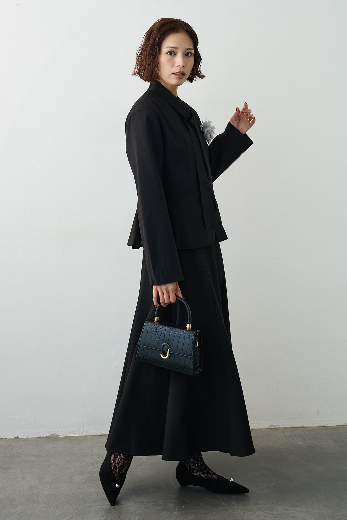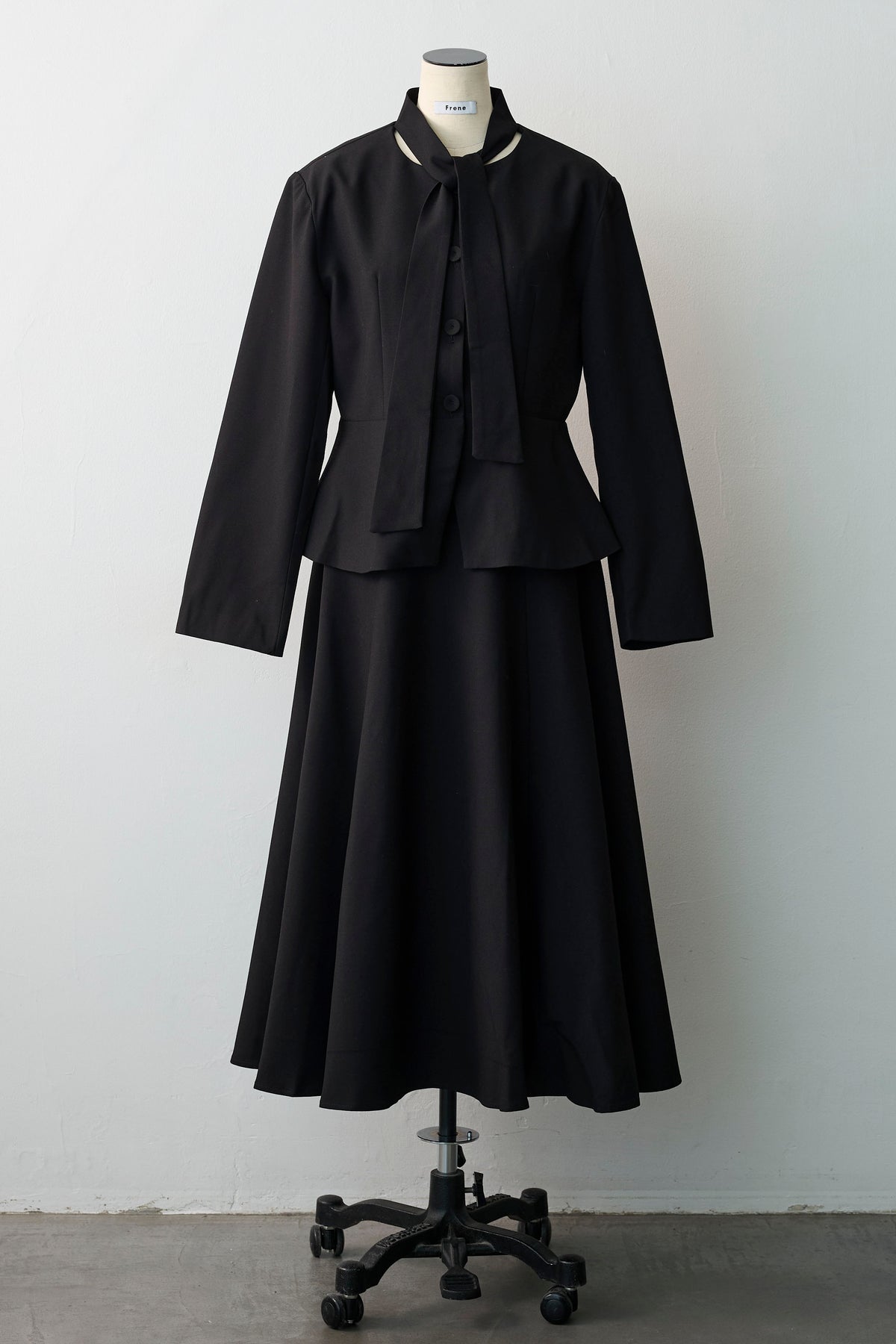 首元のボウタイデザインが、洗練されたアクセントを加えるノーカラージャケットとスカートのセット。 ジャケットは顔周りをすっきりと見せるノーカラー仕立てで、タイを結べばクラシカルで気品ある表情を演出します。 スカートは歩くたびに優雅に揺れるフレアシルエットで、大人の女性らしい落ち着きと華やかさを両立。 セットアップとしてはもちろん、それぞれ単品でも使いやすく、オフィスからセレモニーまで幅広いシーンで活躍する一着です。 ※胸元のコサージュは、セットには含まれません。