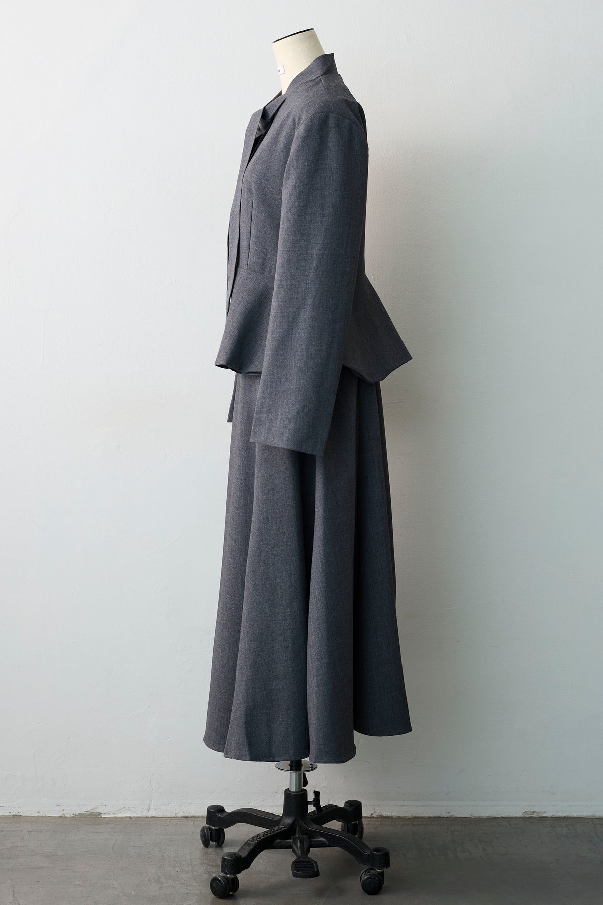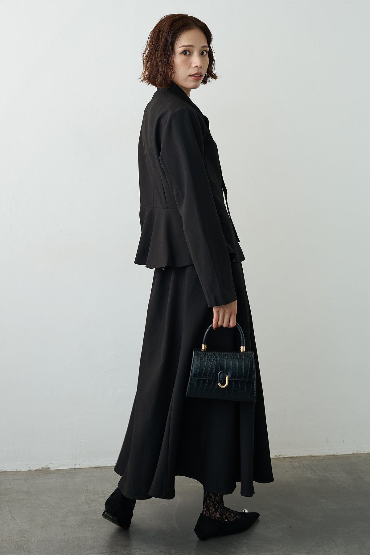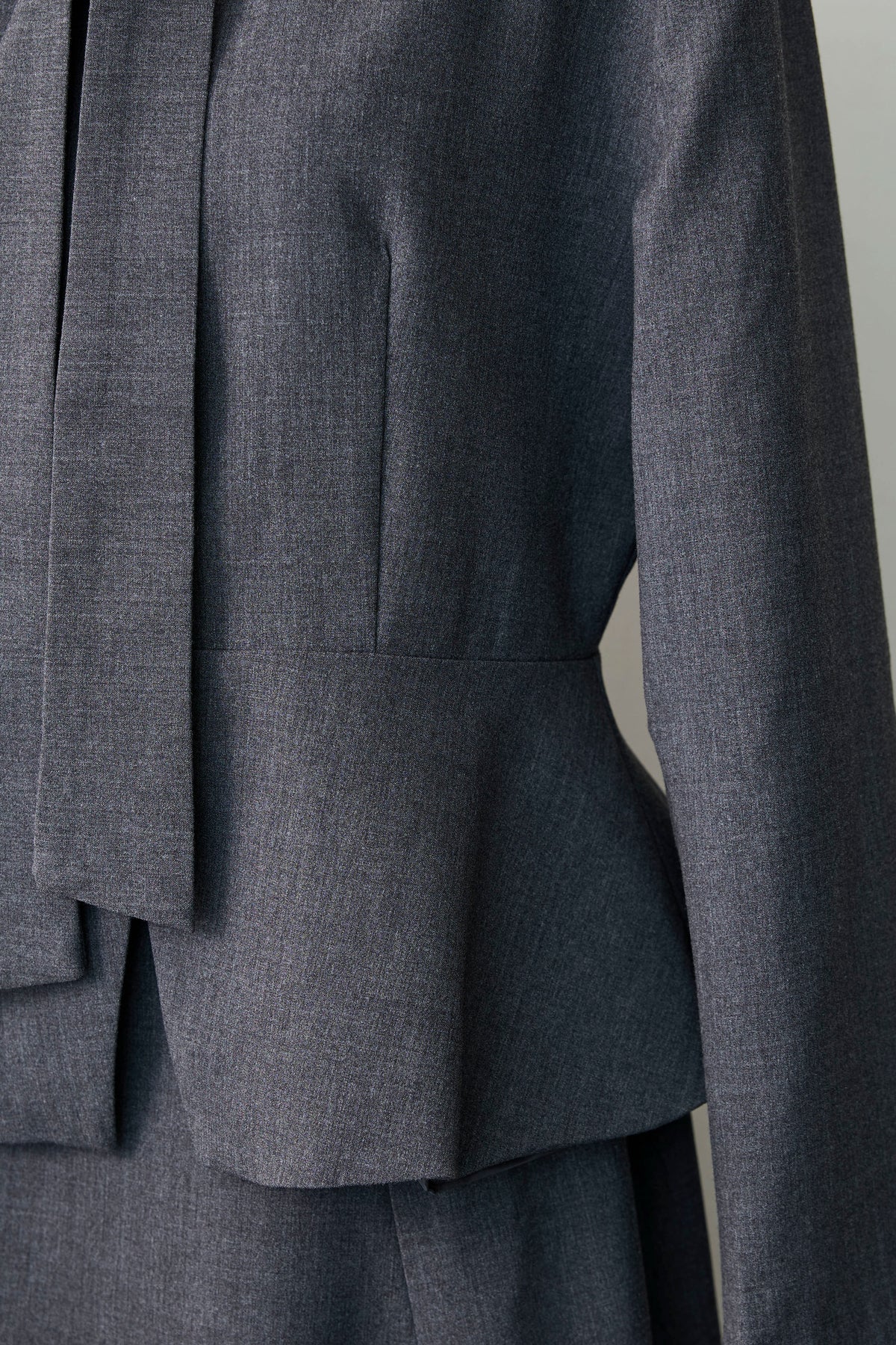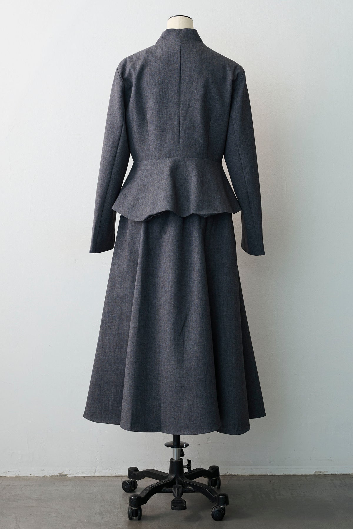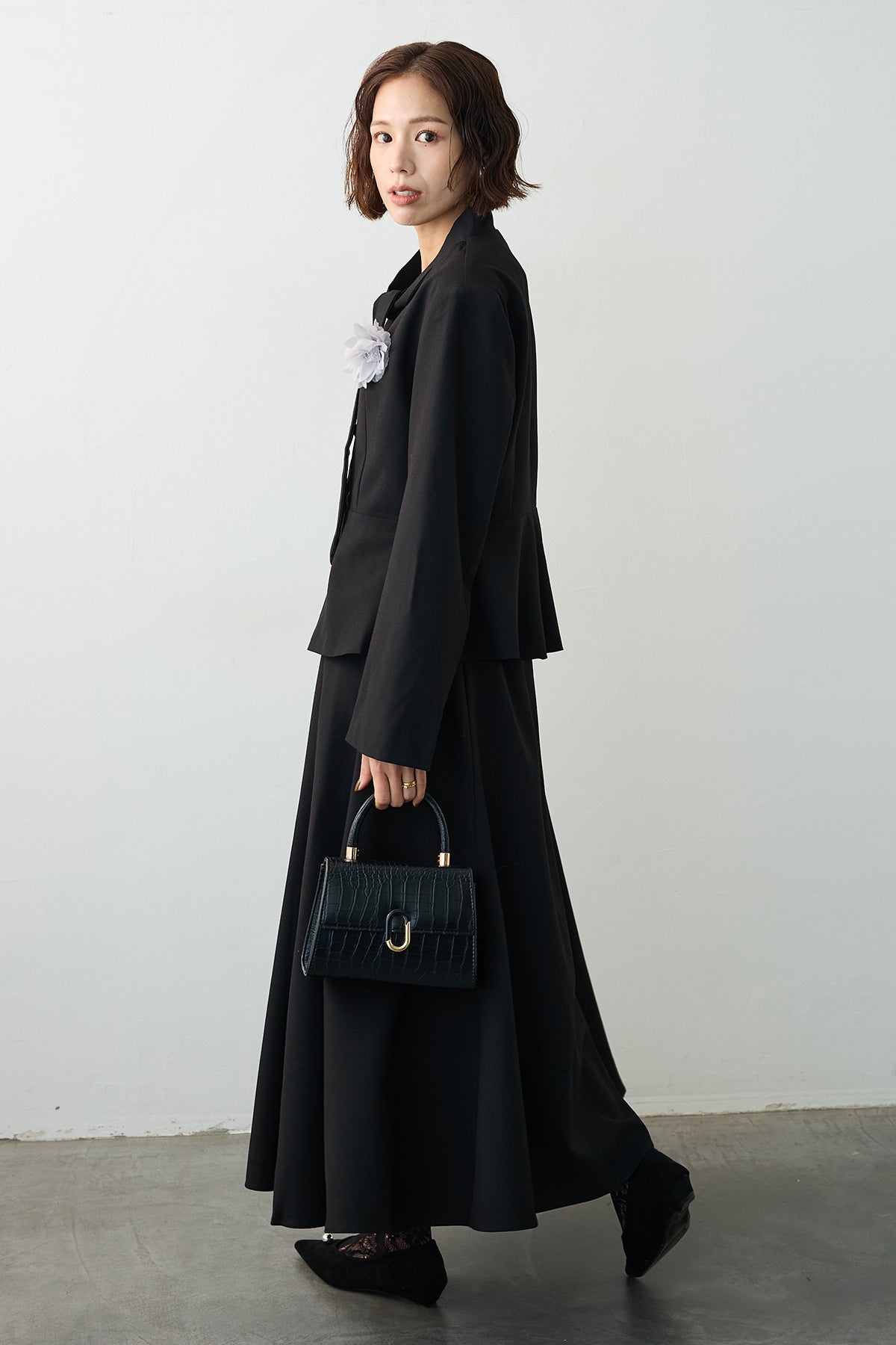 首元のボウタイデザインが、洗練されたアクセントを加えるノーカラージャケットとスカートのセット。 ジャケットは顔周りをすっきりと見せるノーカラー仕立てで、タイを結べばクラシカルで気品ある表情を演出します。 スカートは歩くたびに優雅に揺れるフレアシルエットで、大人の女性らしい落ち着きと華やかさを両立。 セットアップとしてはもちろん、それぞれ単品でも使いやすく、オフィスからセレモニーまで幅広いシーンで活躍する一着です。 ※胸元のコサージュは、セットには含まれません。