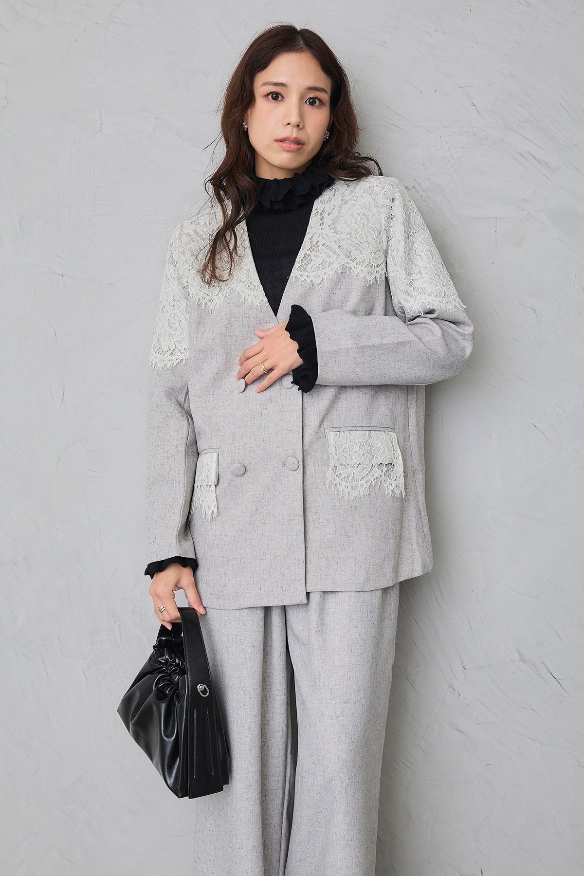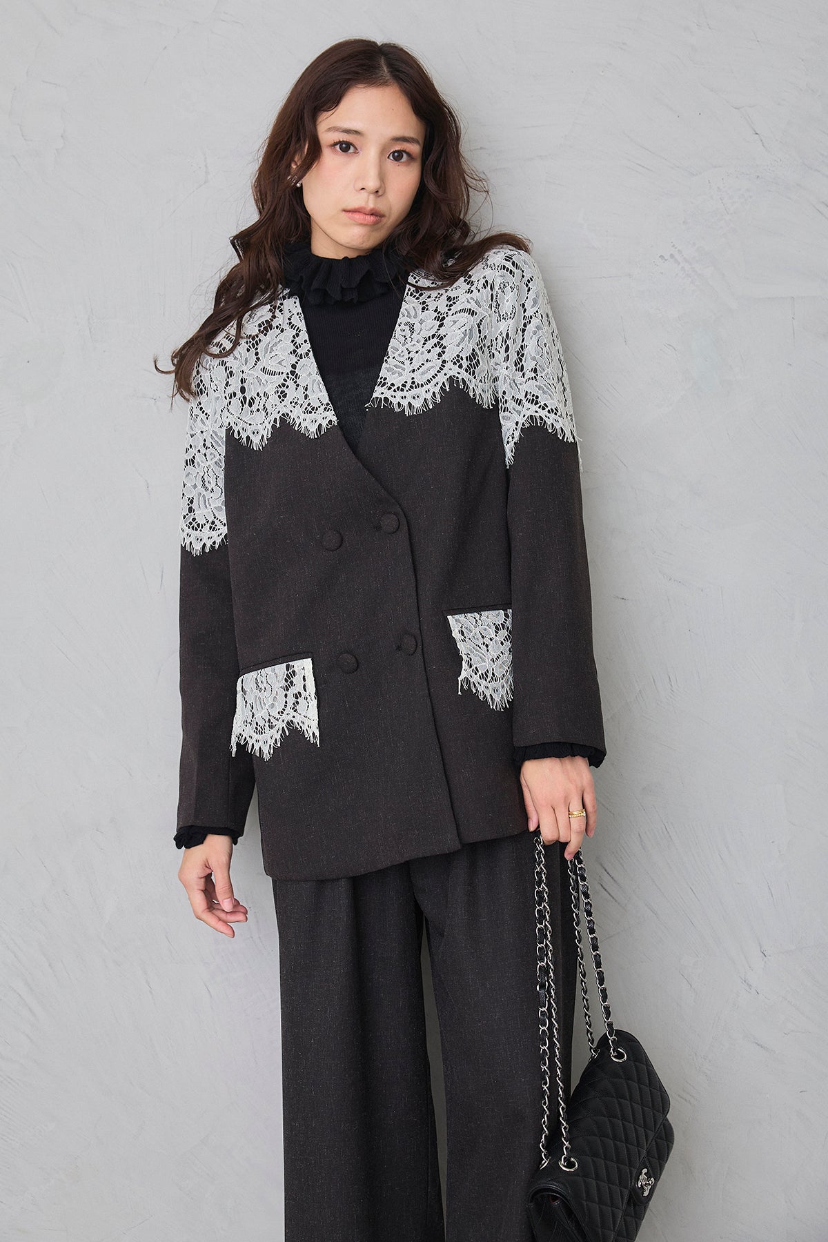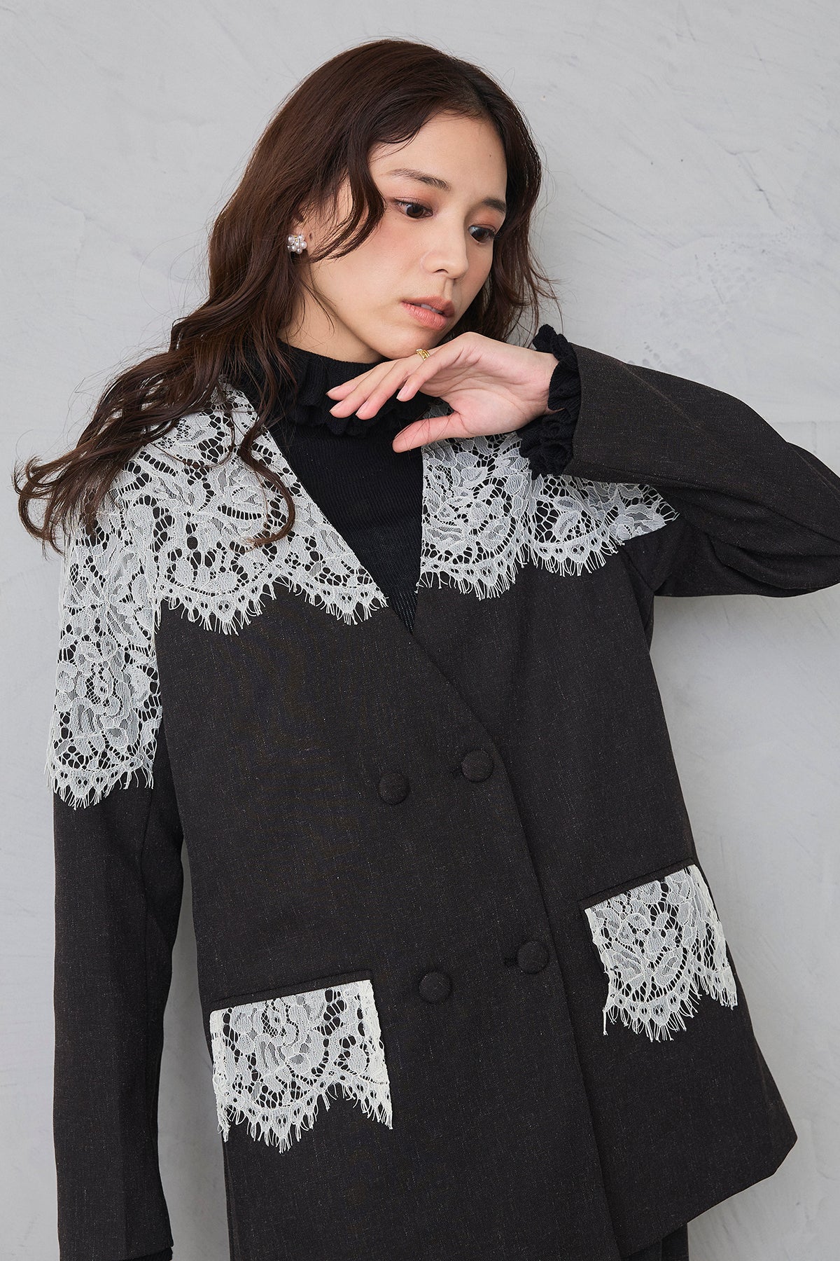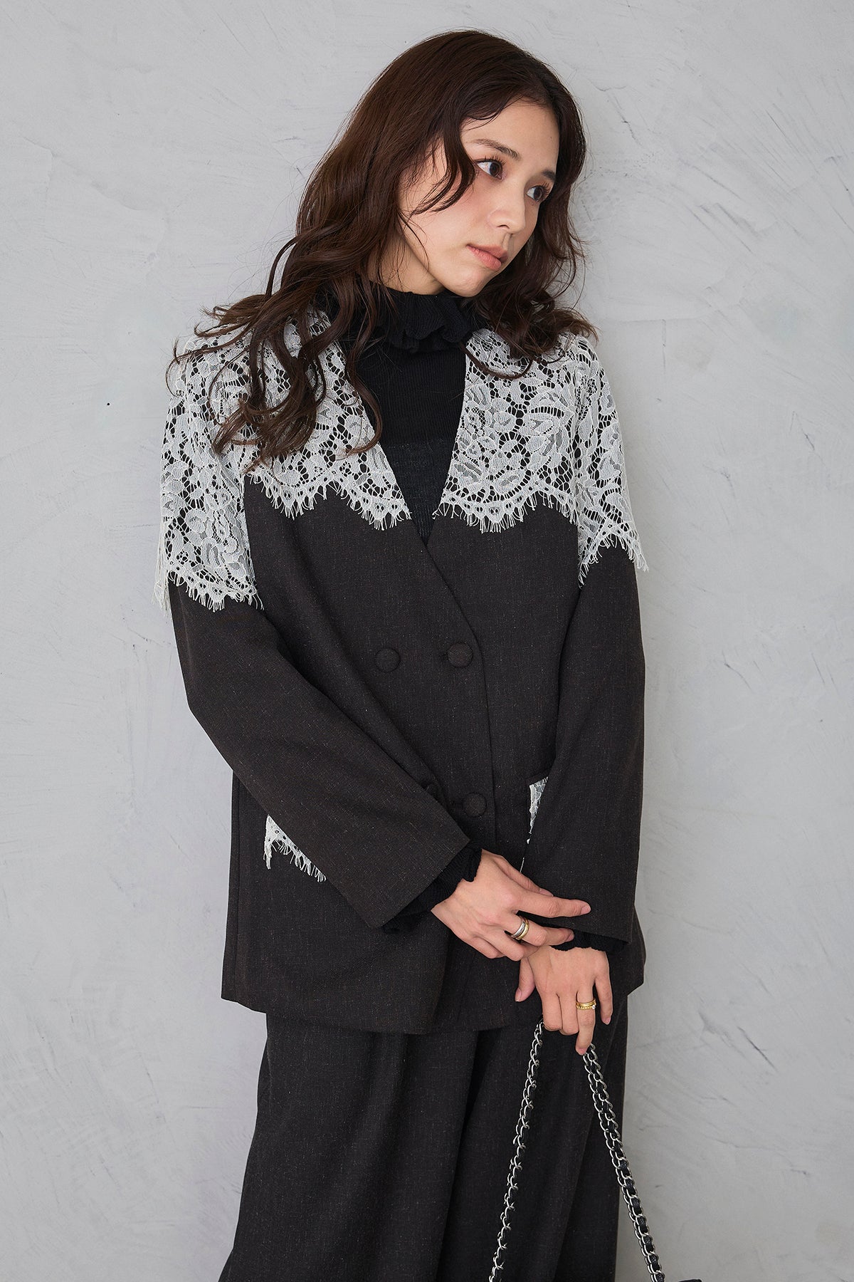 繊細なレースをショルダーから胸元に贅沢にあしらい、品よく華やぐ印象に仕上げたダブルジャケット。 落ち着いた生地とのコントラストが女性らしさを引き立て、羽織るだけでドレッシーな装いが完成します。 フォーマルにもきちんと馴染む端正なシルエットで、オケージョンシーンを上品に彩る一着です。