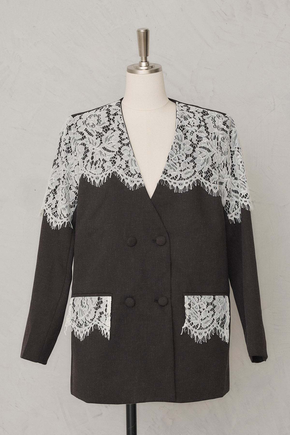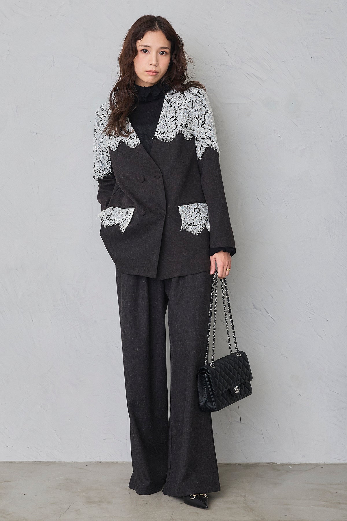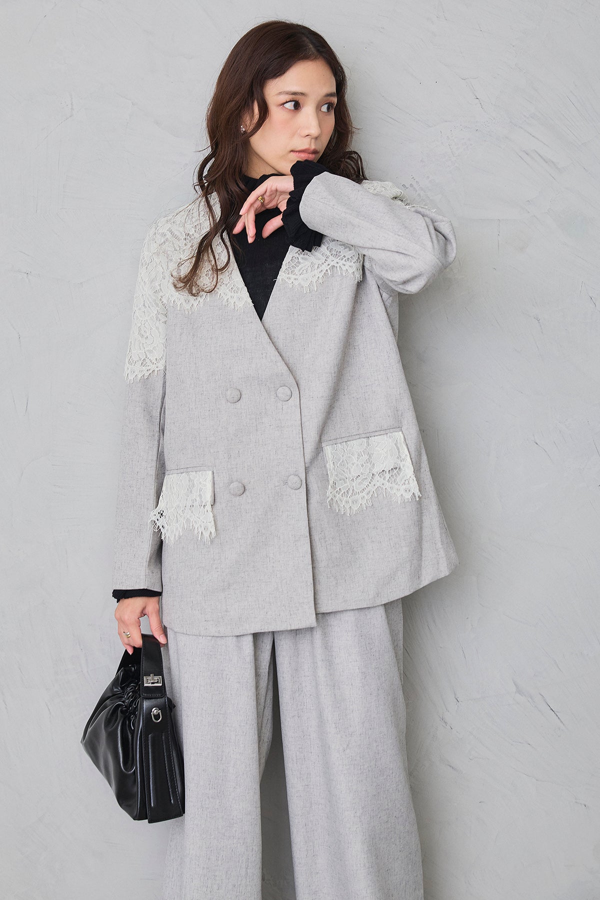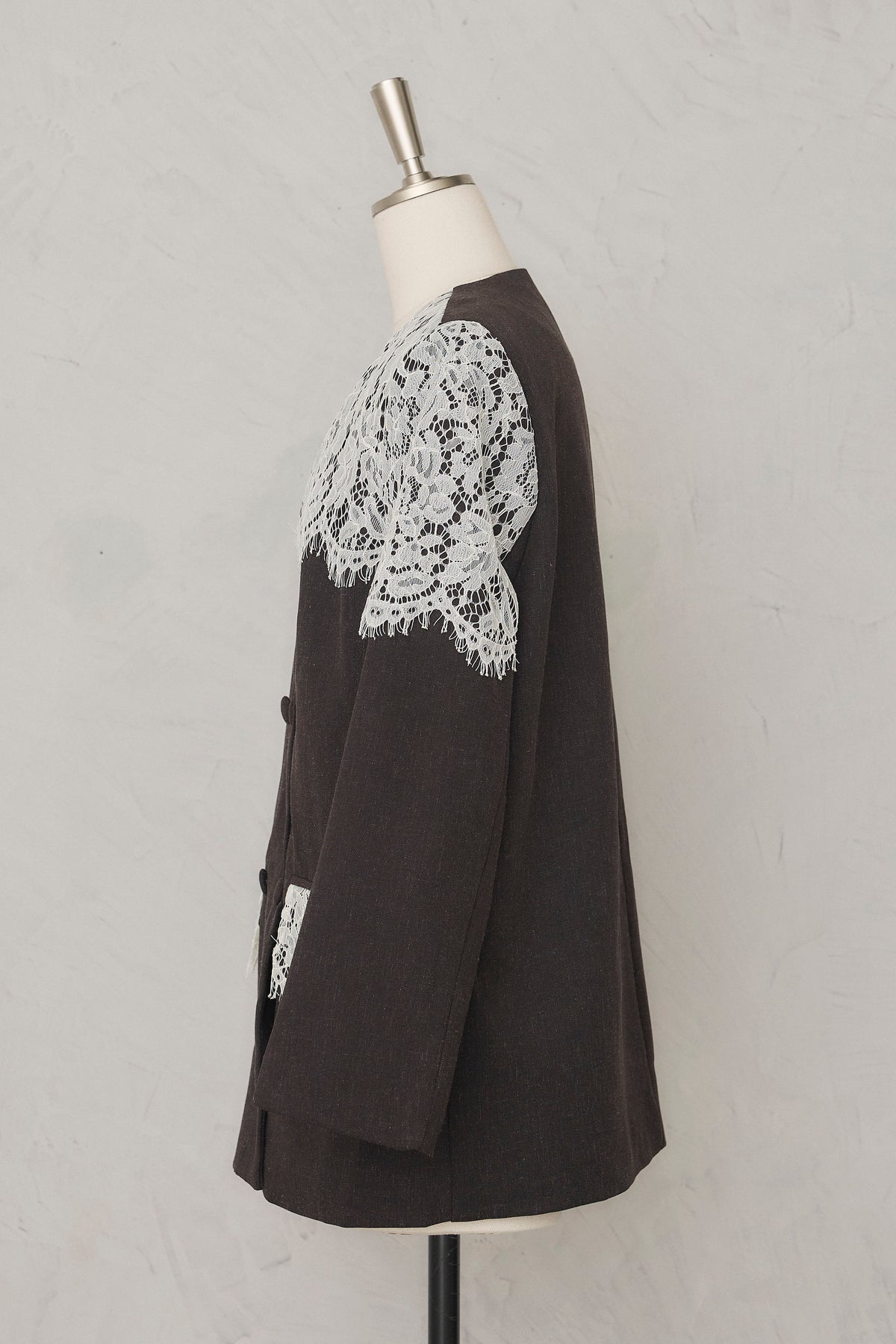 繊細なレースをショルダーから胸元に贅沢にあしらい、品よく華やぐ印象に仕上げたダブルジャケット。 落ち着いた生地とのコントラストが女性らしさを引き立て、羽織るだけでドレッシーな装いが完成します。 フォーマルにもきちんと馴染む端正なシルエットで、オケージョンシーンを上品に彩る一着です。